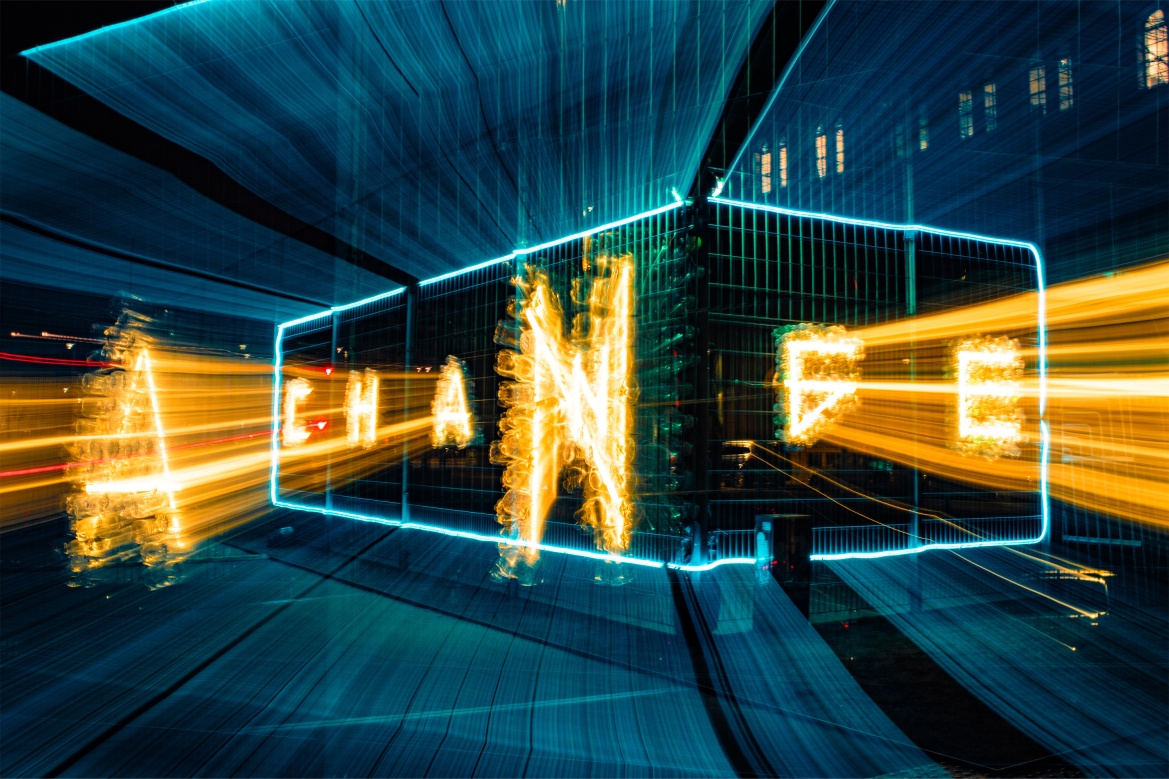 Waves of Change (2024) evolved the project into a public, interactive neon installation, spelling "Change" with flexible neon LEDs woven through suspended bottles. The dynamic visuals shifted with viewer movement, empowering community participation through workshops where people added their own bottles.