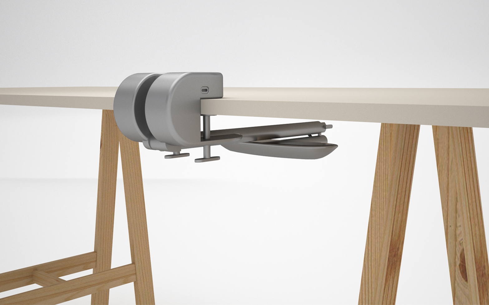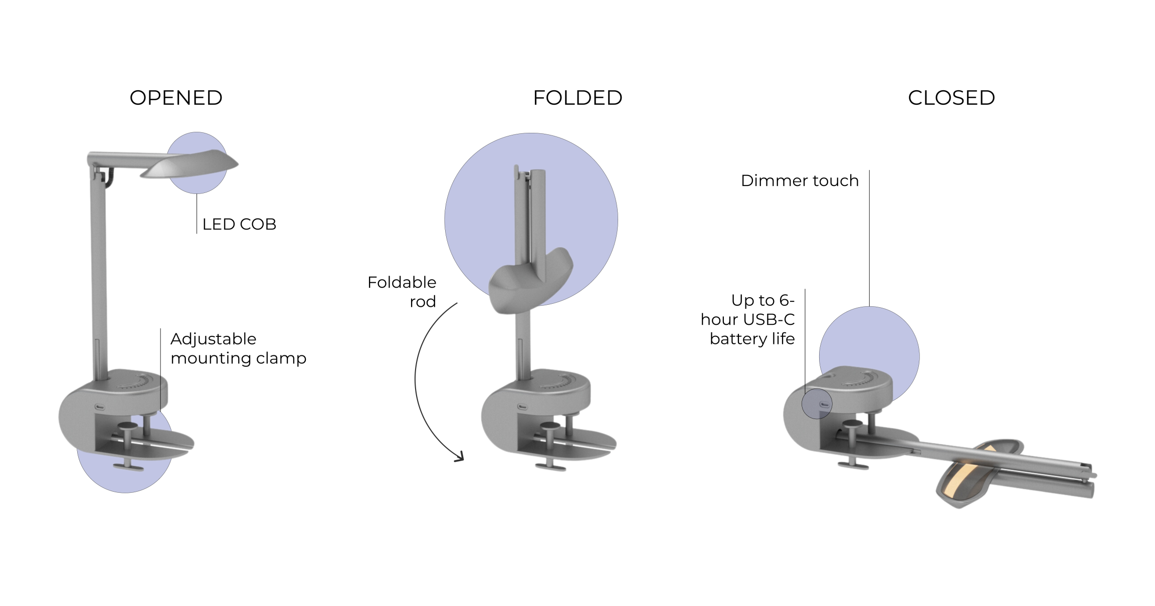 Entry DescriptionBrise is a task lamp designed specifically for trestle tables in cultural spaces, such as art studios and community centers, where creative activities like drawing and painting take place. When deployed, Brise provides focused illumination with visual comfort, supporting manual tasks without overwhelming the environment. Its adaptable structure integrates folding joints and rotating mechanisms, allowing the lamp to collapse neatly for compact storage beneath the tabletop.
