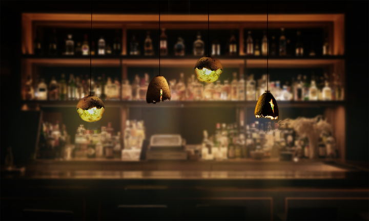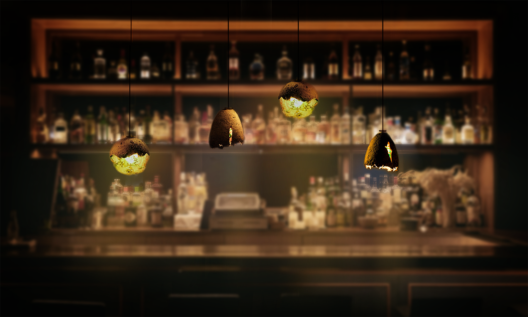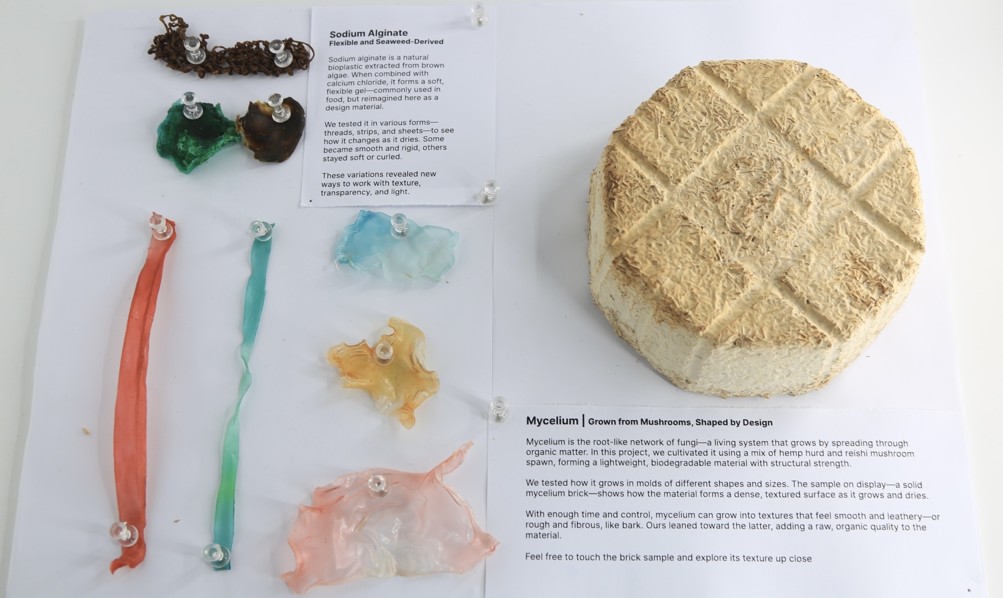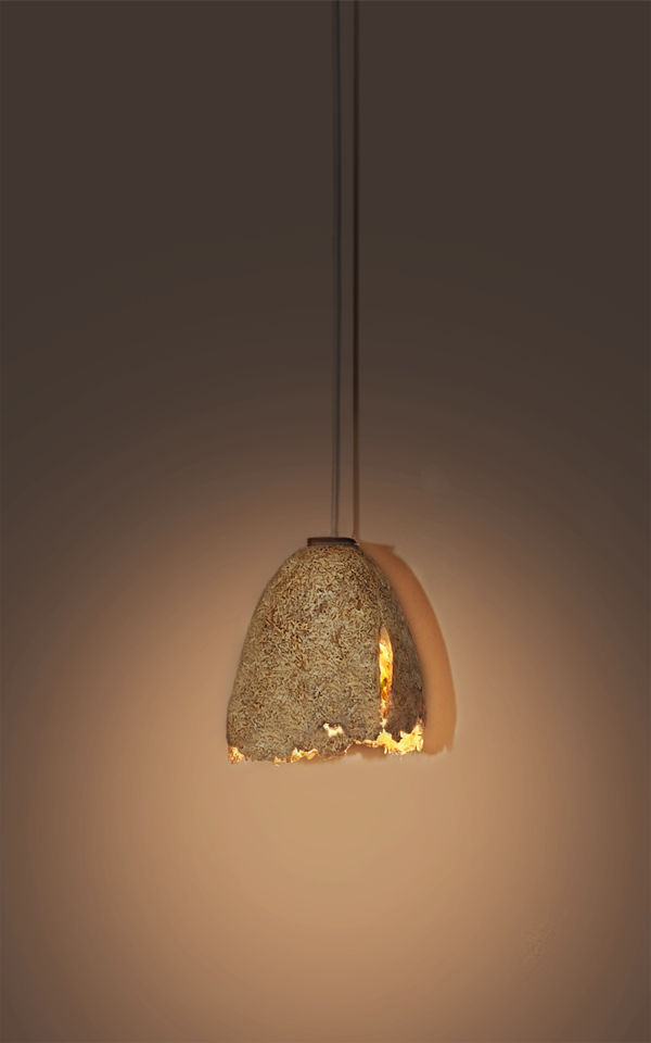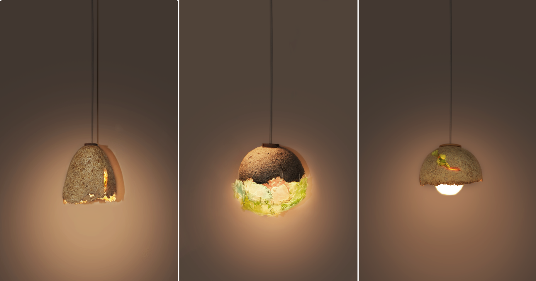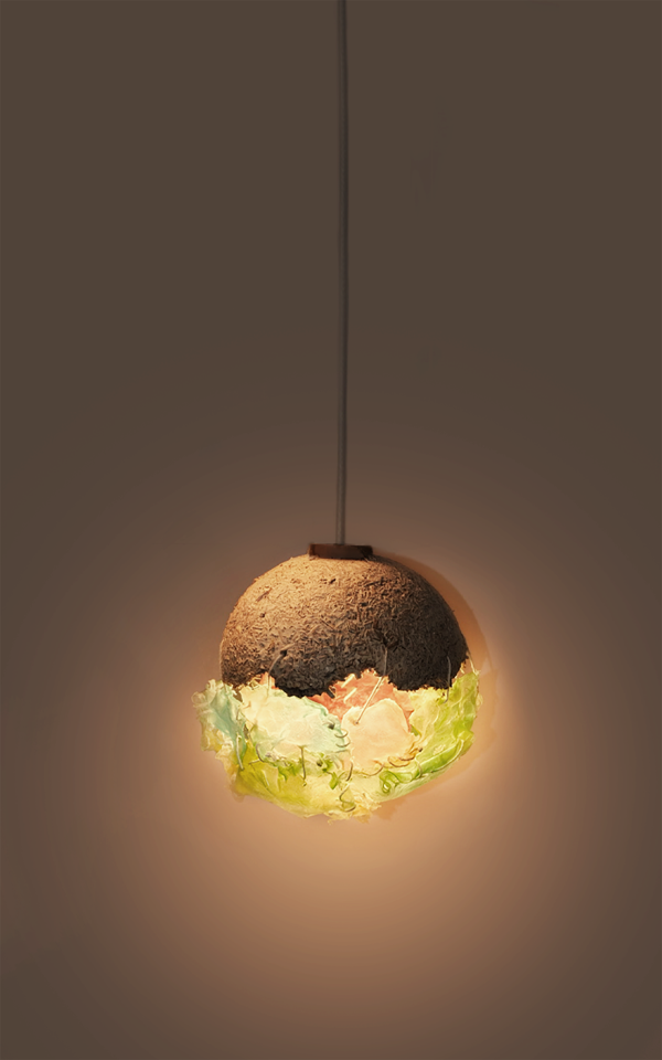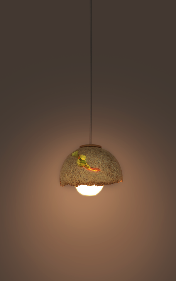 Mycelium, grown on agricultural waste, forms a lightweight yet stable shell with natural fire resistance and insulation, offering a sustainable alternative to synthetic composites. Sodium alginate, a seaweed-derived biopolymer, creates translucent, flexible repair patches, crosslinked with calcium and tinted with food-safe pigments. Shaped by low-impact methods such as air drying and reusable molds, the luminaire is designed for long-term interior use yet remains fully biodegradable, returning safely to nature at the end of life.
