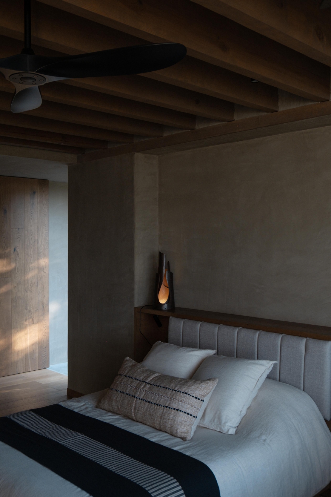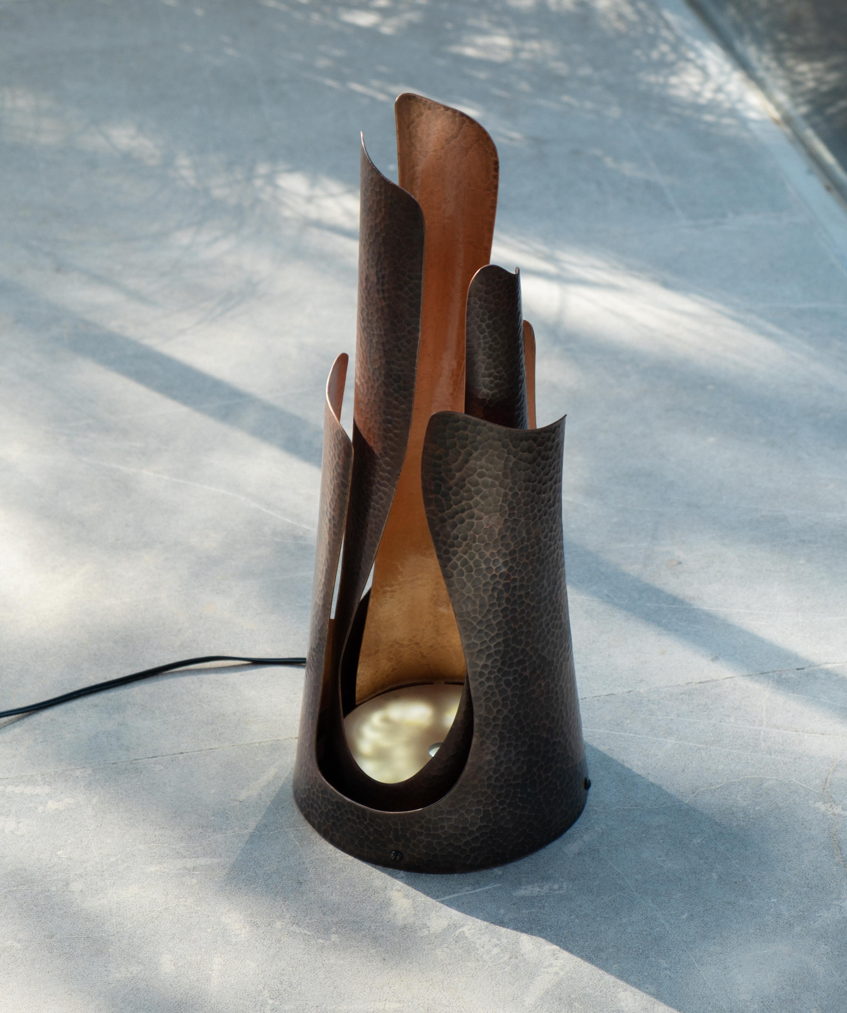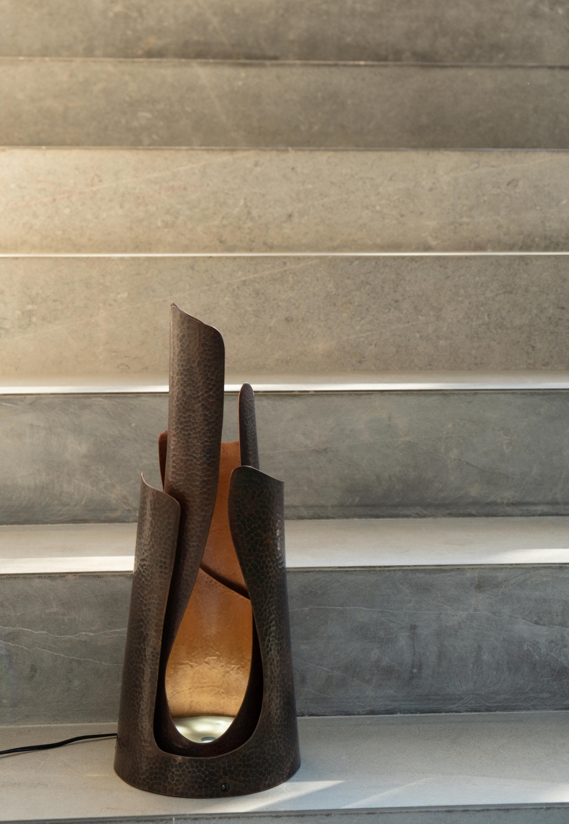 The lamp is designed with a shape of rolled and distorted fabric, an intentional choice that evokes the natural formations created by wind in the environment.