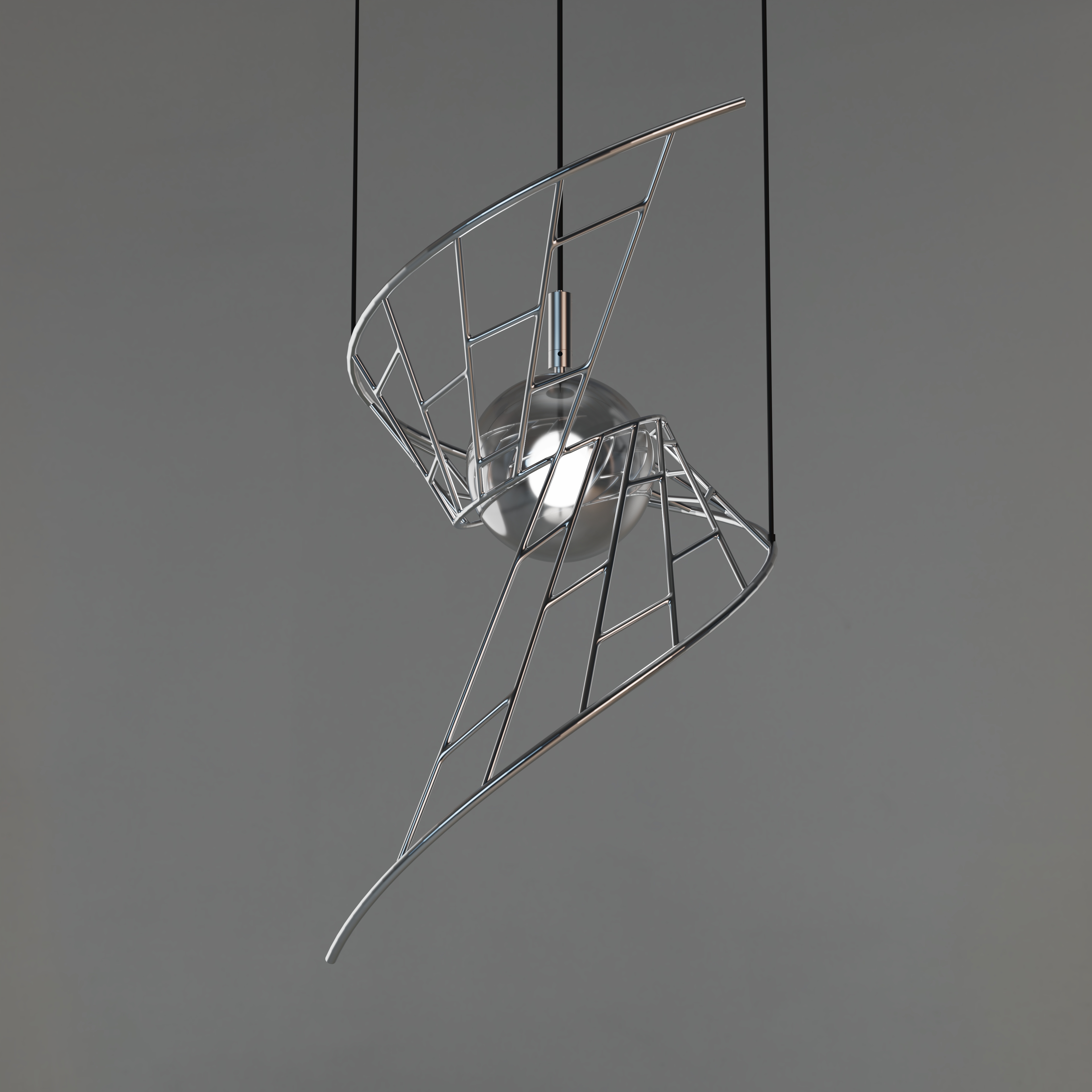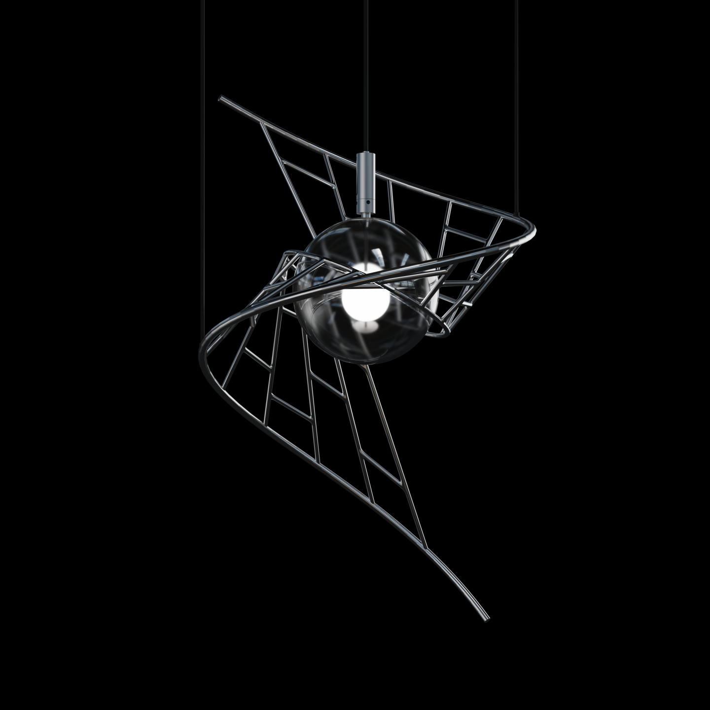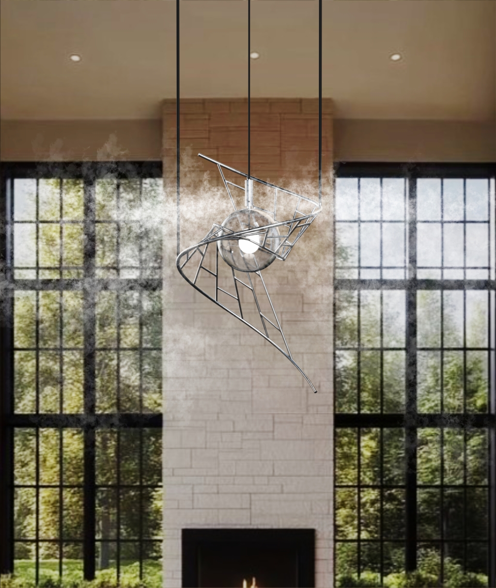 The body consists of three independent components: a metal frame, a central glass lighting element, and an ultrasonic cold-mist system. The spiral, semi-enclosed form is designed to resemble how dew appears caught in a web, while the central glass sphere represents the dew drop itself. Viewed from different angles, the structure reveals varying shapes, reflecting the layered and shifting geometry of a real spider web.