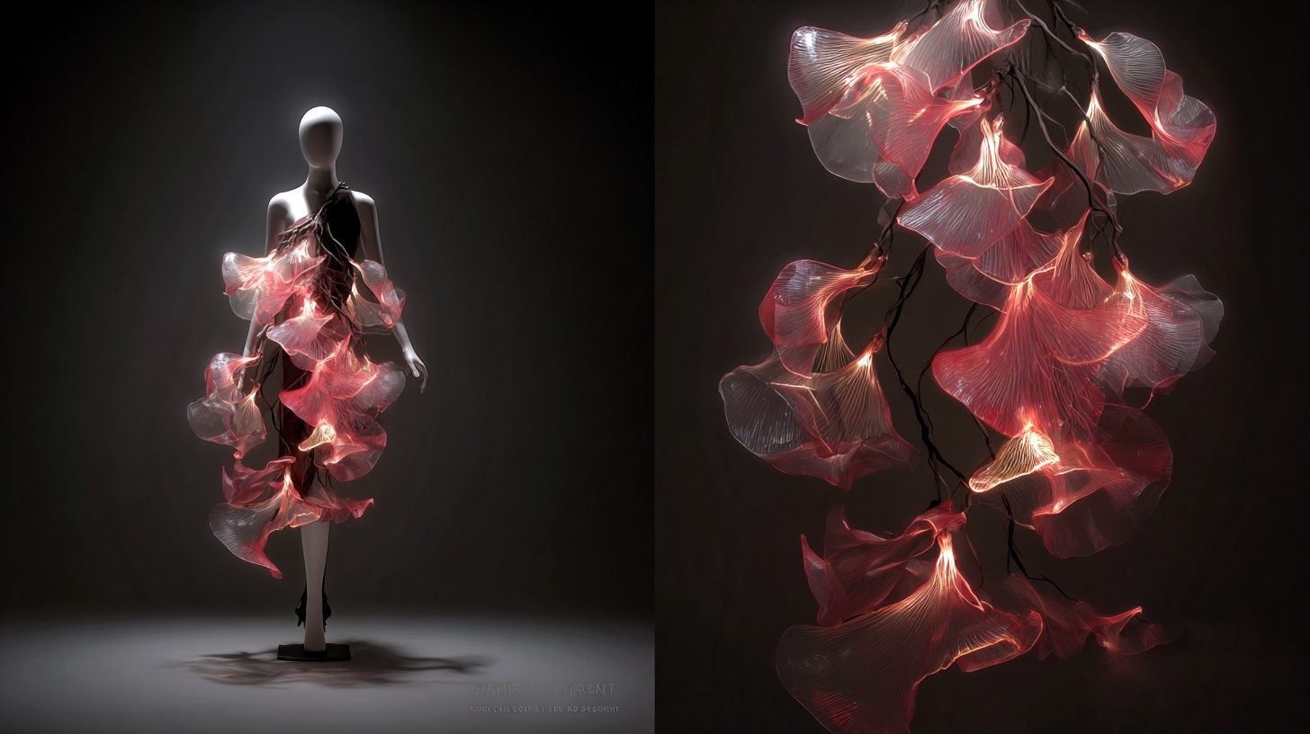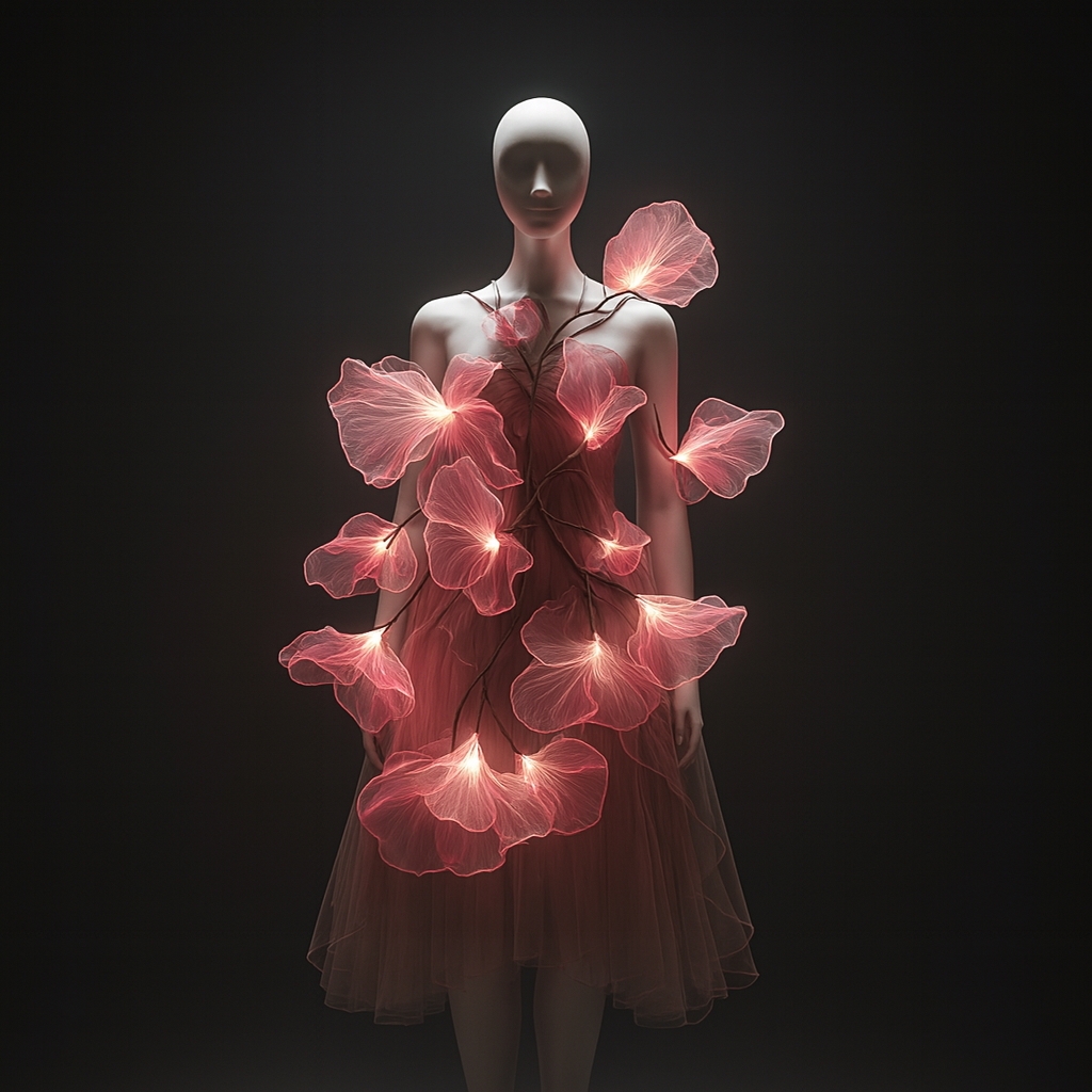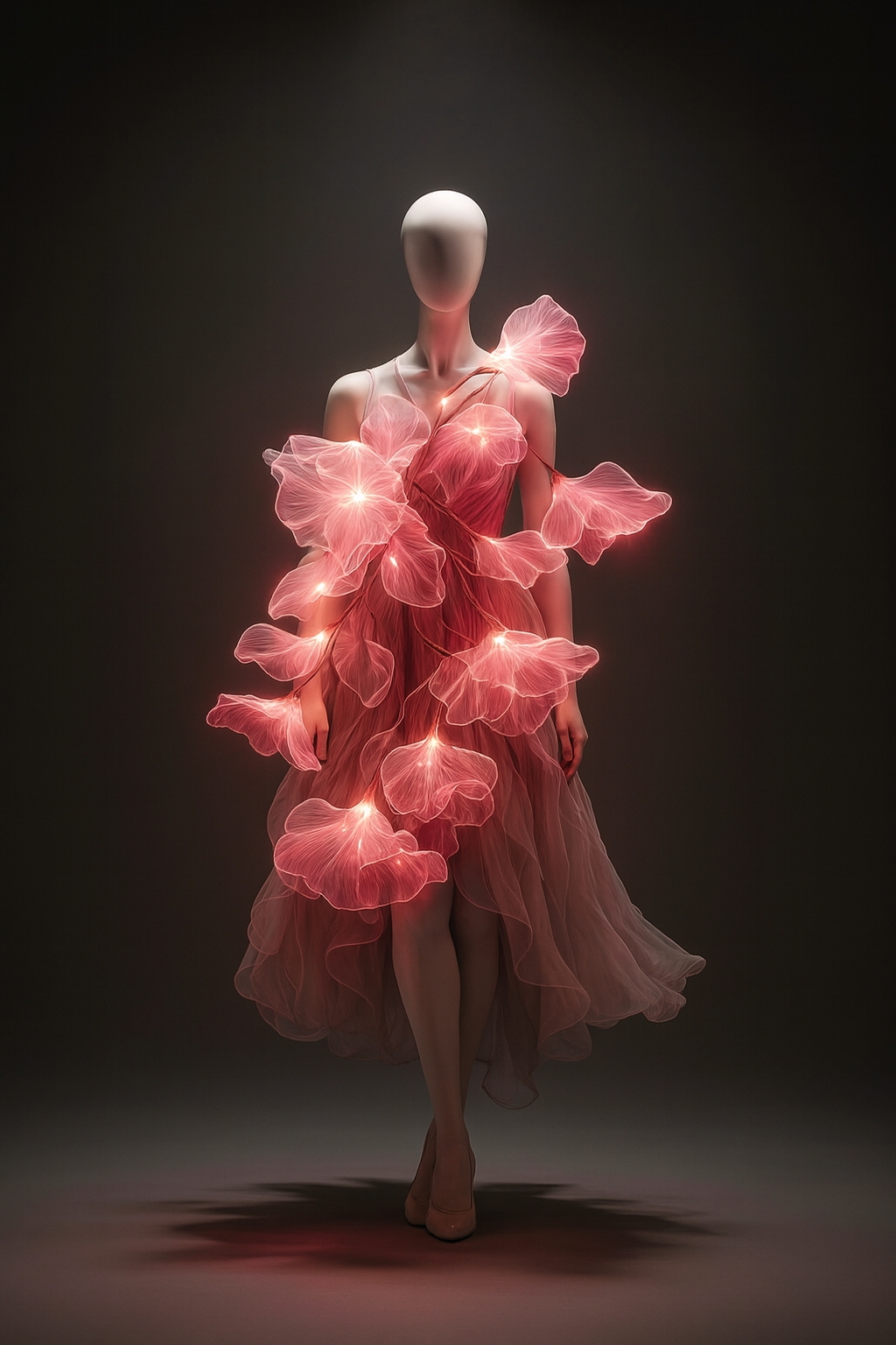 Sustainability ApproachThe piece integrates micro-LEDs and fiber optics within lightweight, translucent layers. Light patterns can be programmed or made responsive to movement, creating dynamic effects that shift with the body. Powered by a concealed rechargeable battery and controlled through a microcontroller, the garment allows for both interactive and pre-designed lighting sequences.
