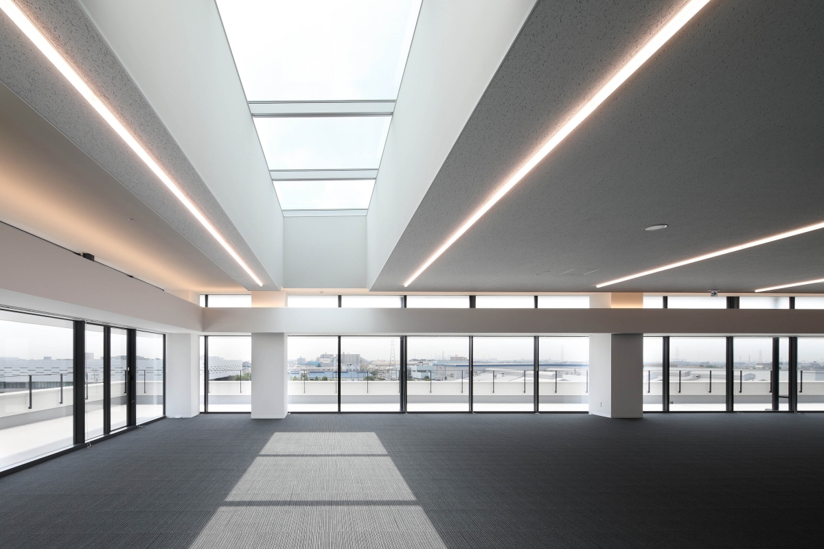 A crystal chip’s frequency characteristics depend on its thickness and angle. The architectural design emphasizes this by layering volumes of varying thicknesses, shaping a space that embodies the identity of DAISHINKU. This concept extends to the interior space. Each floor is organized around an atrium pierced through the center, with natural light from the skylight spreading across each layer. This stimulates encounters and communication among workers on different floors.