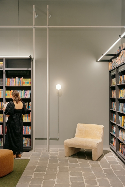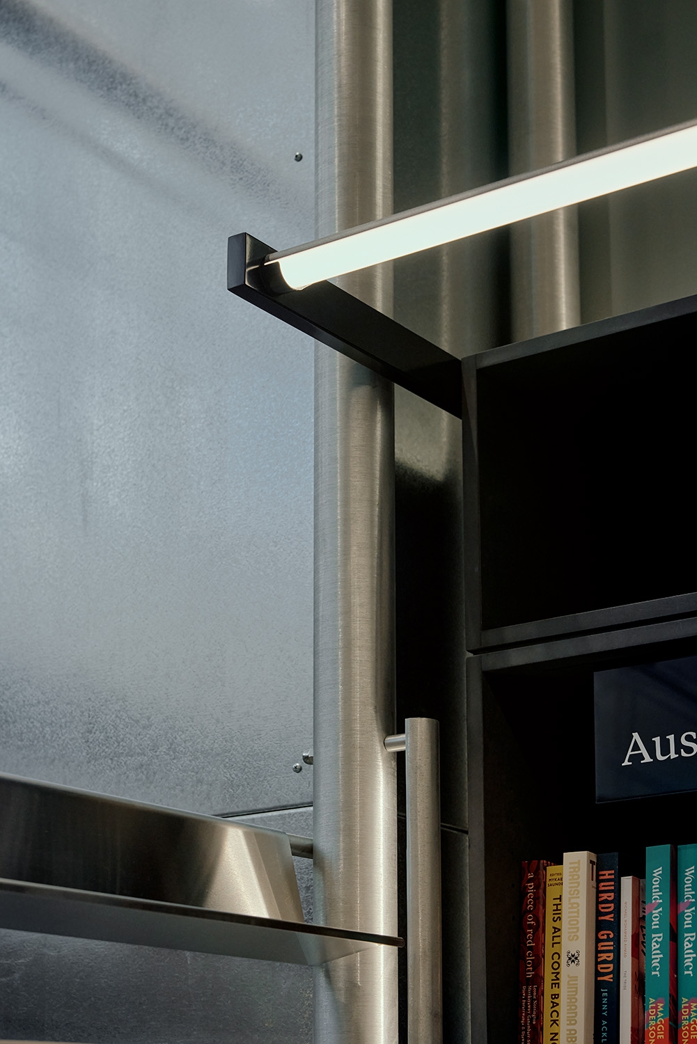 Linear lighting, integrated into the joinery, illuminates the bookshelves while subtly guiding movement. A wall wash effect adds depth and warmth to the design, while the curved shroud wall lights near the shopfront illustrate form meeting function. This thoughtful approach to lighting not only complements the industrial aesthetic but underscores the project’s small footprint ethos, making lighting the showcase of the overall design narrative.