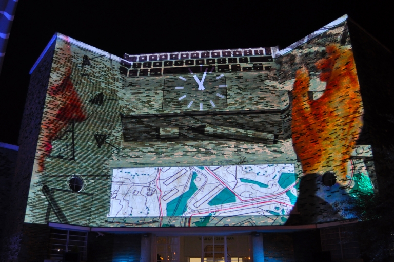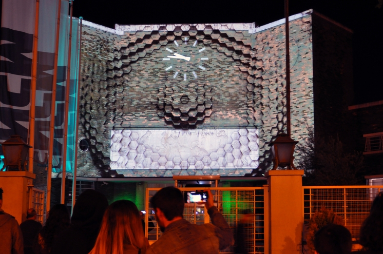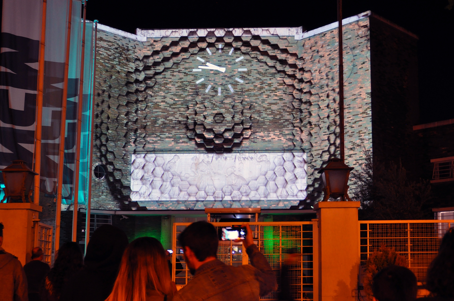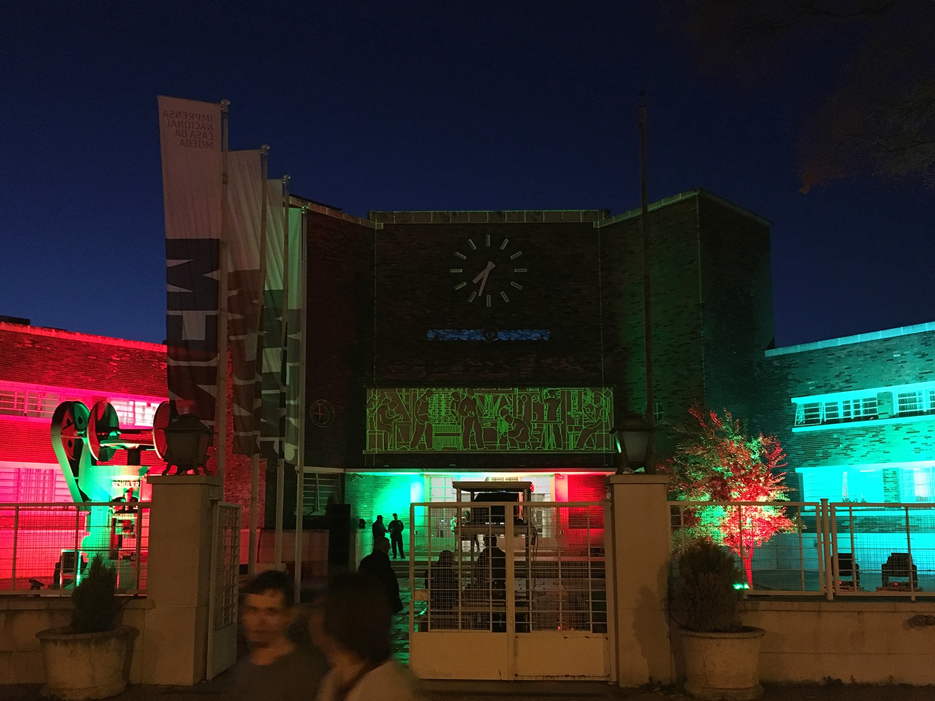 The VideoMapping had to be totally adapted to the façade not only in geometry but also in color correction and aberration as the green tilled façade absorbed almost every other color projected there. The solution was to calculate the amounts of green of each image and suppress it as much as possible to have a “somewhat” nicer and perceptible blending