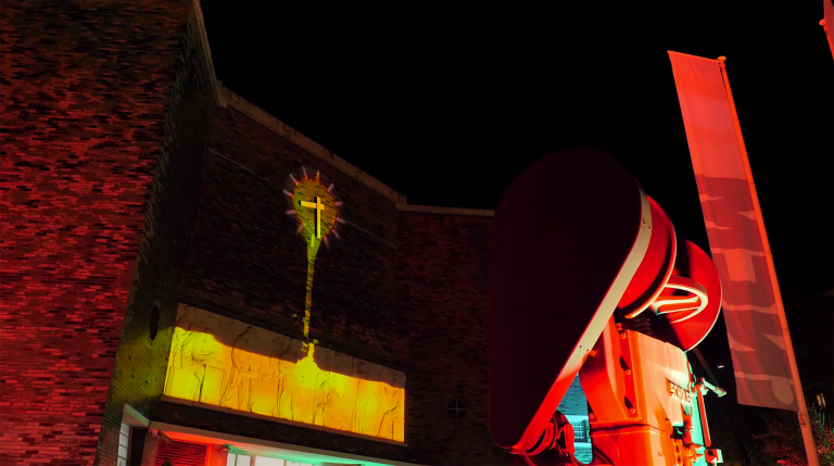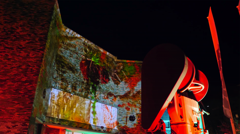 The project was a new challenge as the facade was not completely flat (the two side walls were 45 degrees angled advanced) and the area distance for projection was too short for the standards. So, using a wide-angle lens was the only possible way to project the facade with the CHRISTIE BOXER 4K30. The other adjacent walls were light painted with RGB Light Washers and beams and the whole front garden was also strategically filled with more RGB light projectors, all operated live via DMX to create a fully colored painted facade and a more immersive experience.