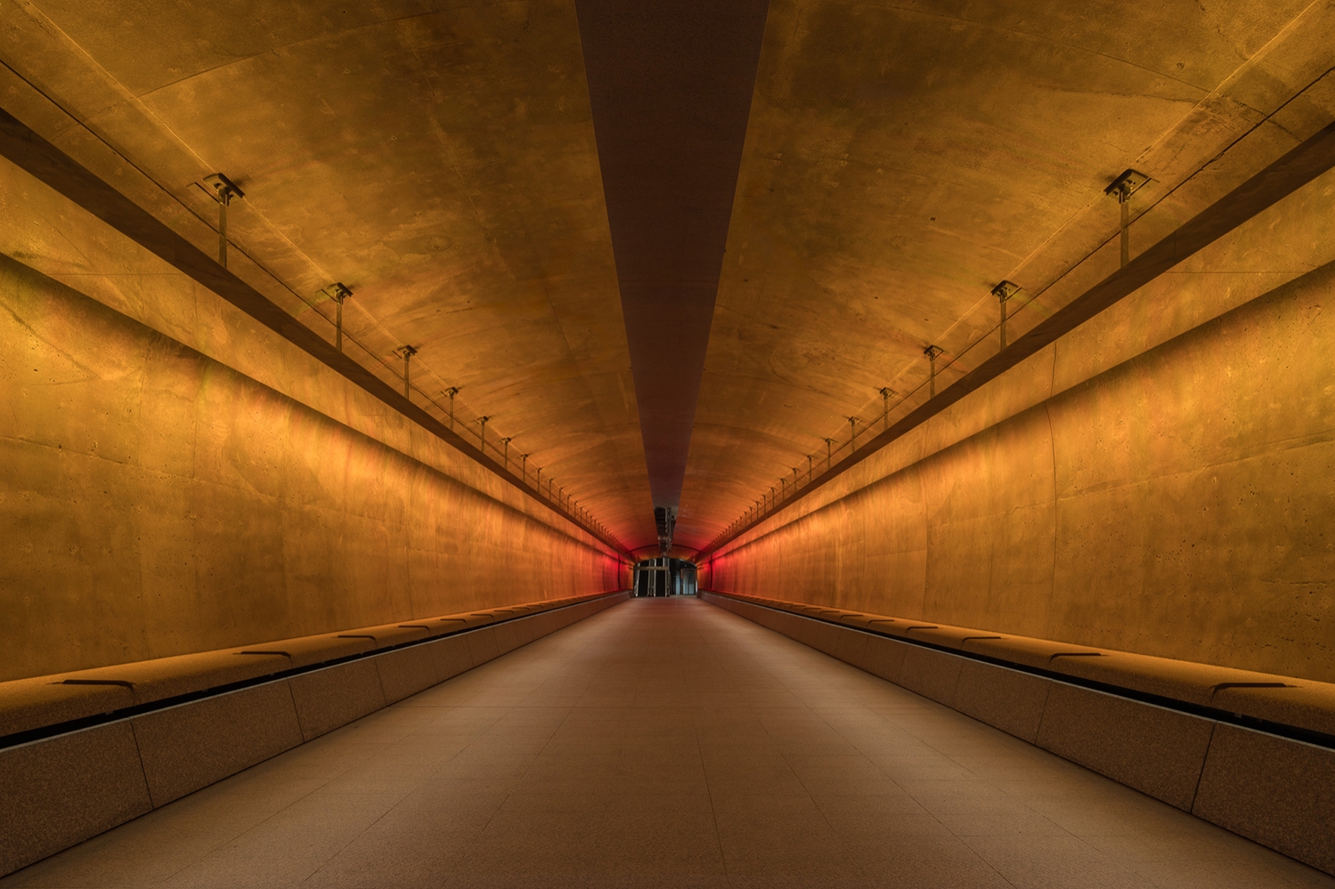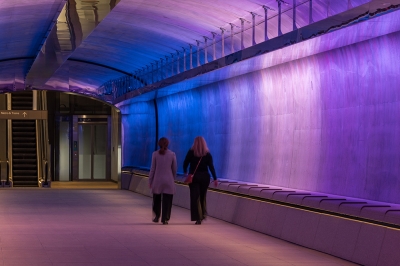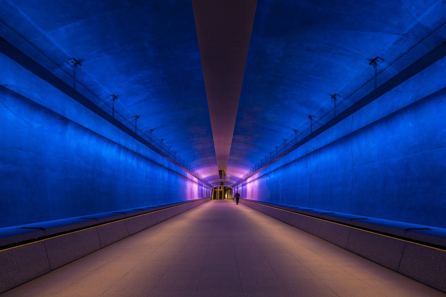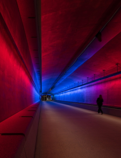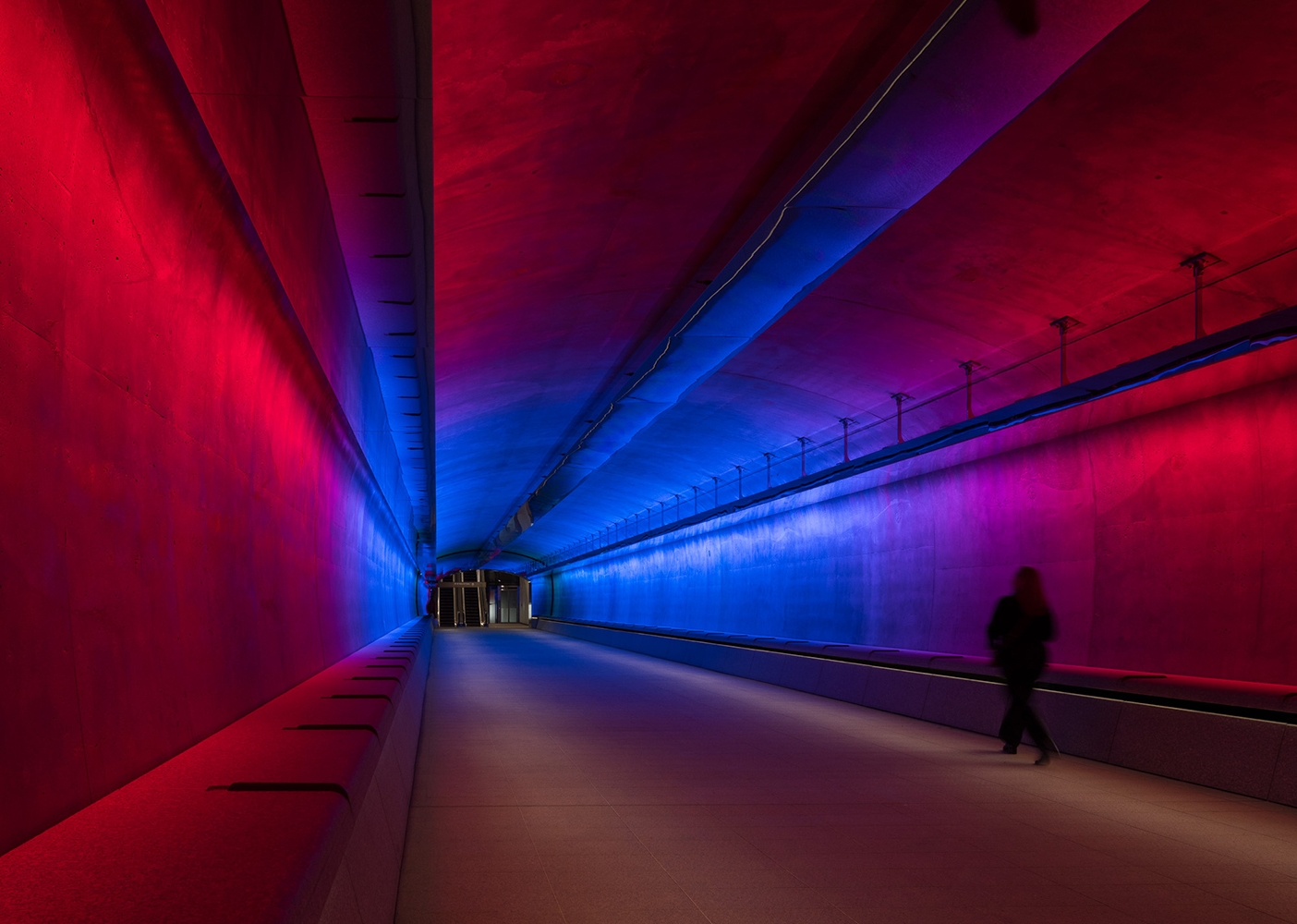 The Architect imagined this tunnel as more than just a services link, proposing a public pedestrian link providing a faster option between North & South concourses. The length & clean circular form of the tunnel presented a rare opportunity for a lighting installation.