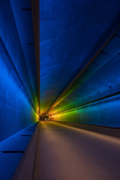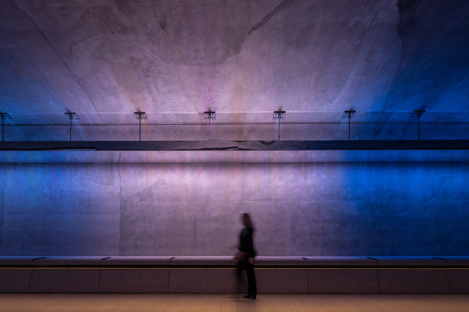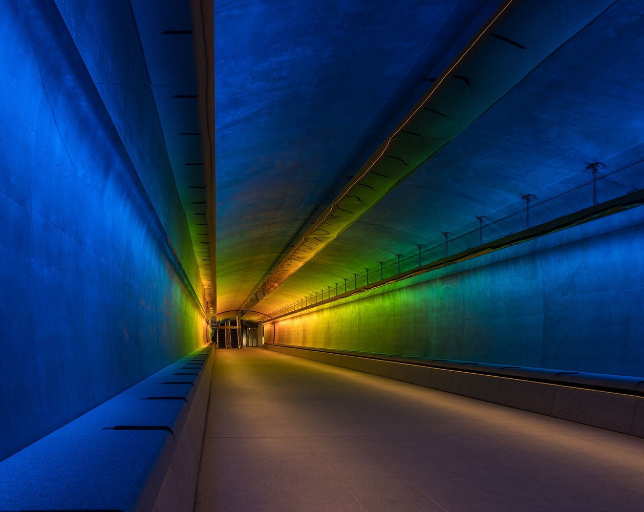 The lighting concept proposed 2 layers of light paired together with a series of audio soundscapes, providing an immersive experience in this unique space. The lower layer being a subtle white ‘carpet’ of light to satisfy the technical requirements of a public corridor – delivered in a way that avoided any impact on the remaining surfaces above. The second layer was to transform the upper cylindrical form of the tunnel into a dynamic light canvas which worked both with the 3-D form & the raw concrete textures of the space.