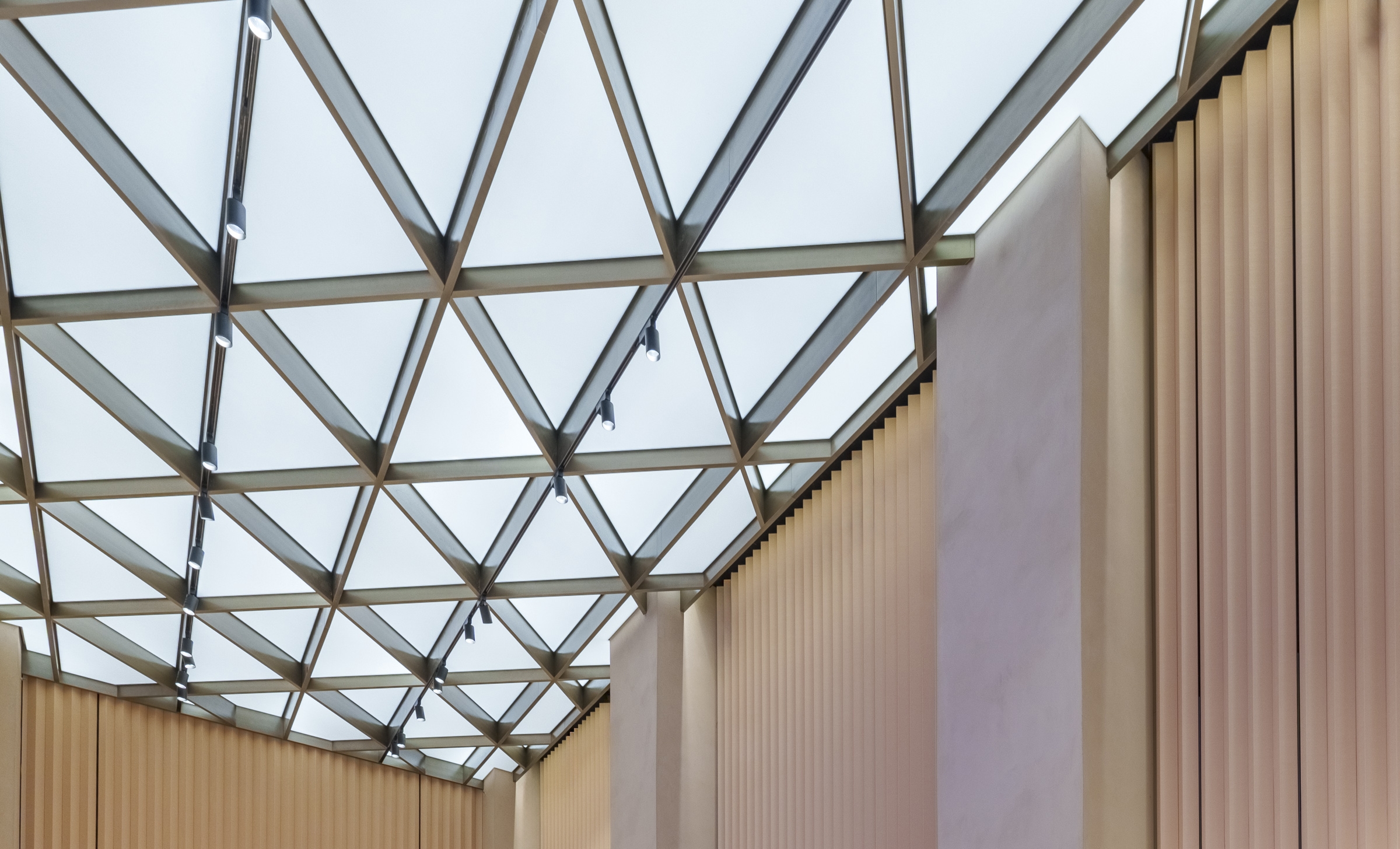 Sustainability ApproachThis essential lighting is part of a comprehensive sustainability approach that reduces energy usage to the absolute minimum while complying with regulatory parameters, limits real-time consumption, and extends the operational life of the equipment. In line with the material balance concept — aiming to minimize the output of materials destined for disposal — ceiling maintenance is simplified. This is achieved via the magnetic anchoring system of the light panels to the metallic structure, allowing for rapid removal and quick replacement. Due to the magnetic fastening of the tiles, they can also be reused in different compositions. Finally, all other project lighting fixtures are designed for reuse, via interchangeable electrical and electronic parts, confirming how intelligent design concretely translates into energy savings and responsible resource management.