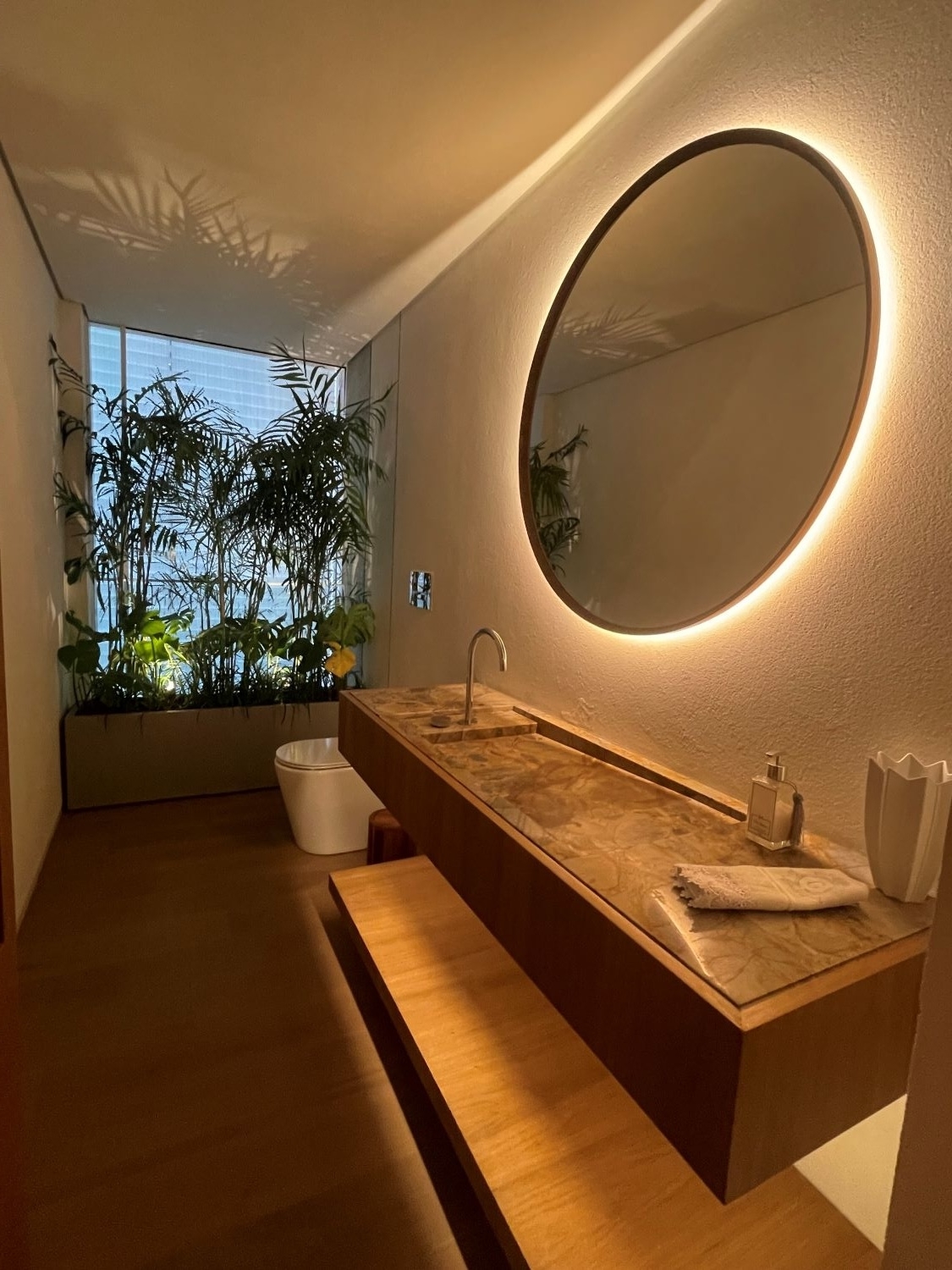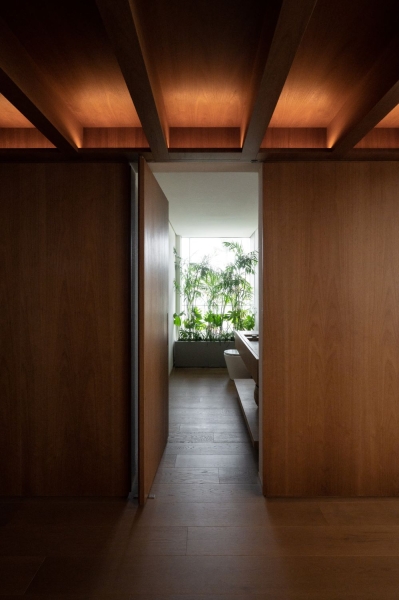 Lighting with an opening angle of 30° and 50° was used at strategic points in the apartment, but diffuse light was the most used resource, sometimes appearing more subtly in the carpentry or acting as the main light in the coves or indirectly appearing on the wooden ceiling at the entrance to the apartment.