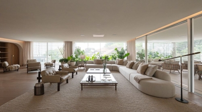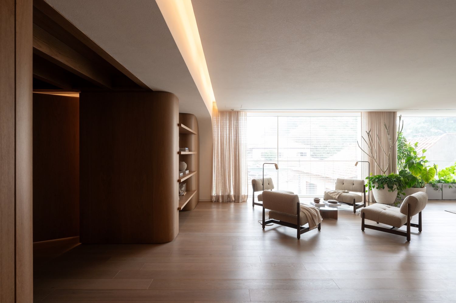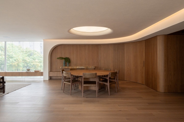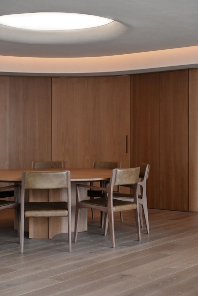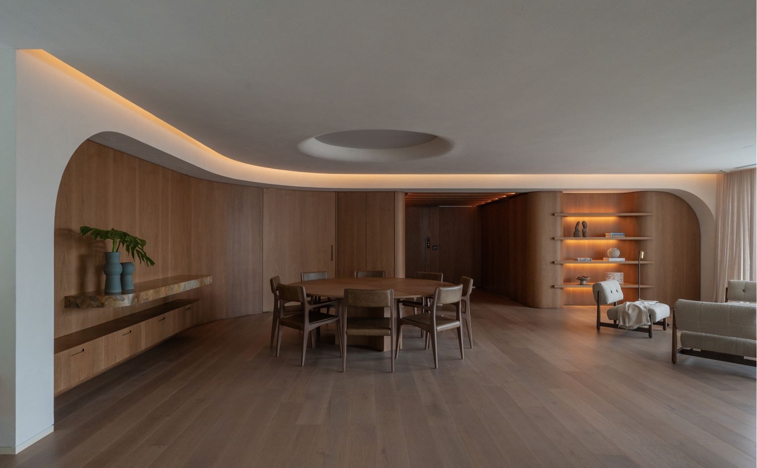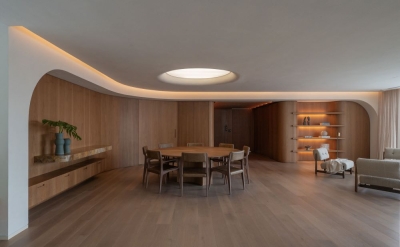Entry DescriptionThe starting point for the project came from references provided by the architecture and interior design team, where the curved shapes of the walls would be repeated in an element on the ceiling of the living room, as if there were a large gap, a zenithal opening, reflecting sunlight into the apartment.