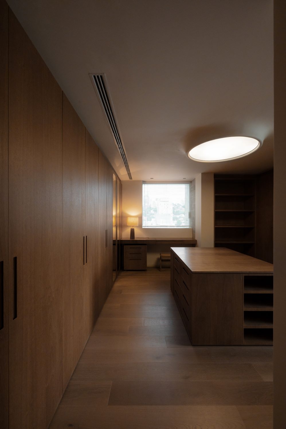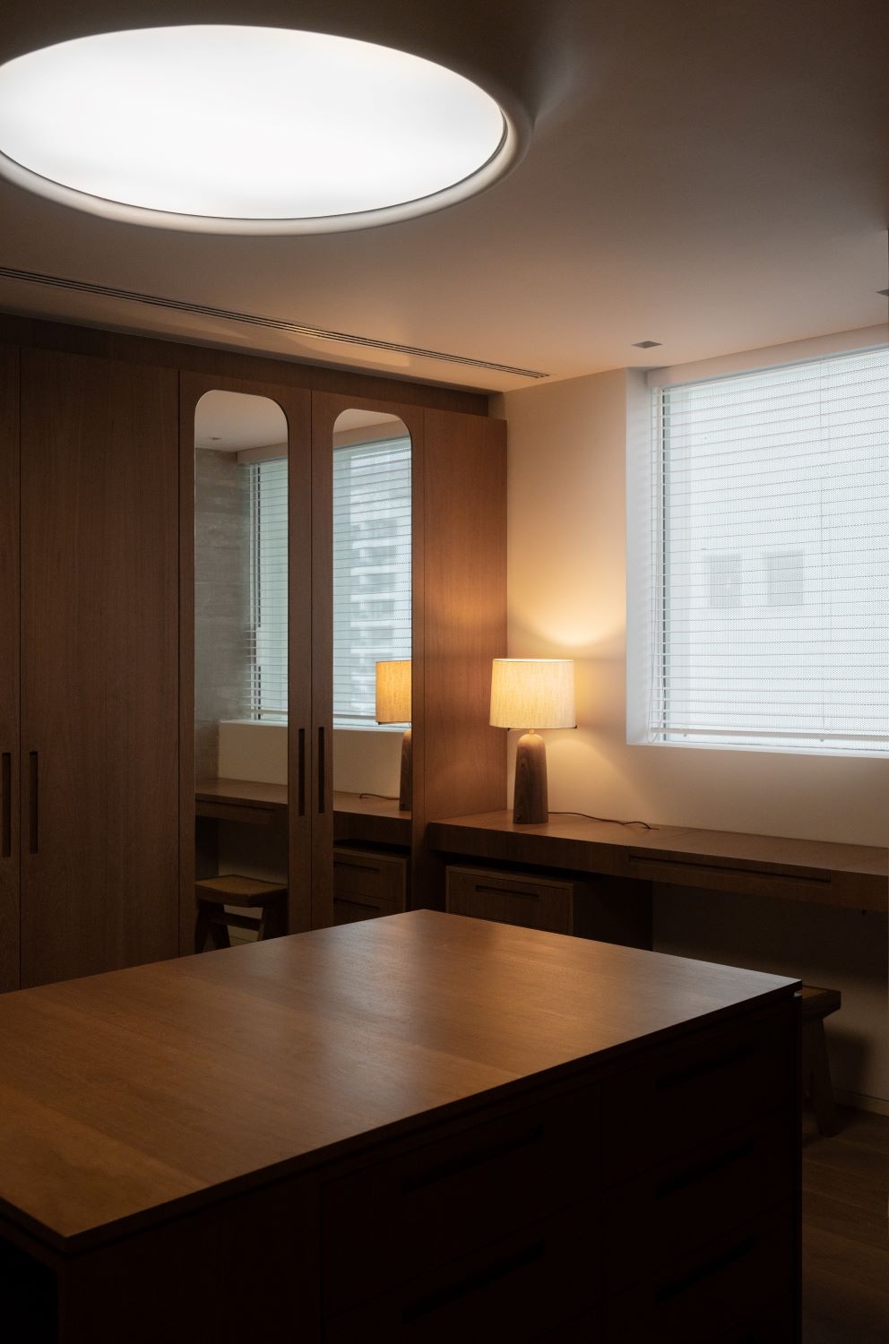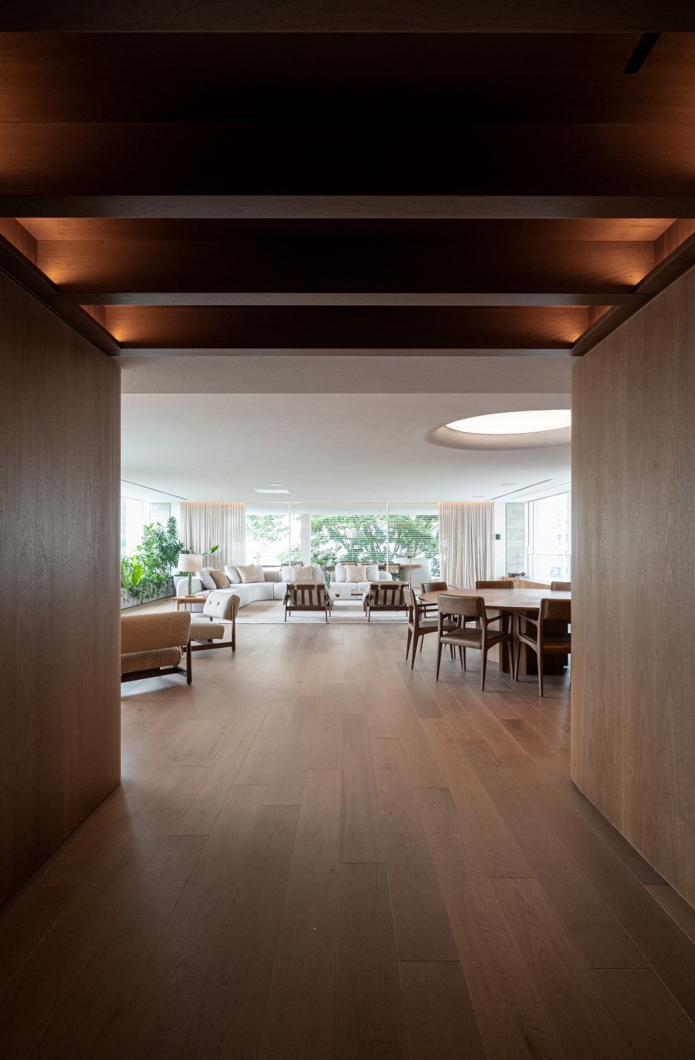 Entry DescriptionThe starting point for the project came from references provided by the architecture and interior design team, where the curved shapes of the walls would be repeated in an element on the ceiling of the living room, as if there were a large gap, a zenithal opening, reflecting sunlight into the apartment.