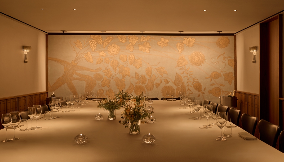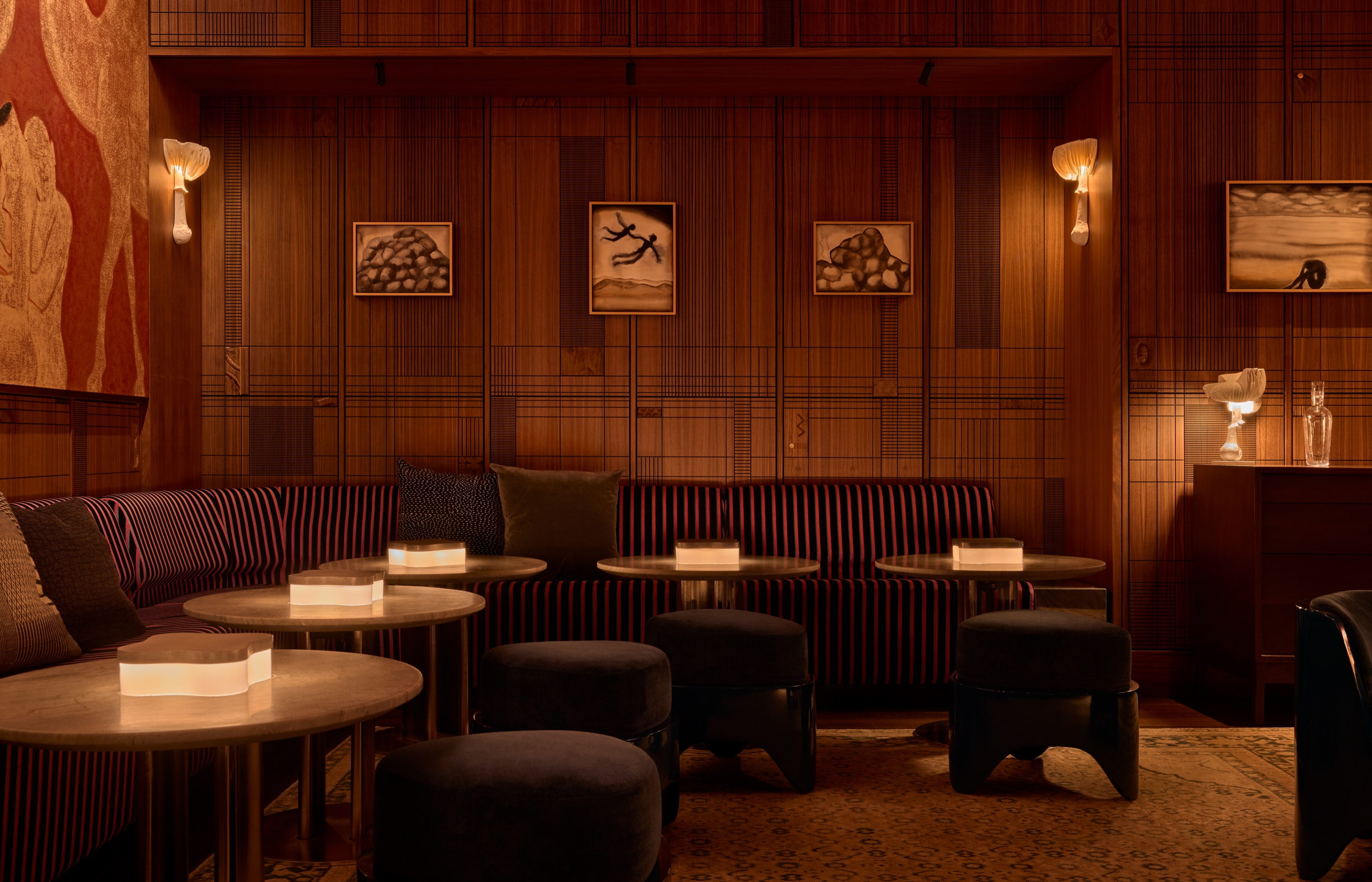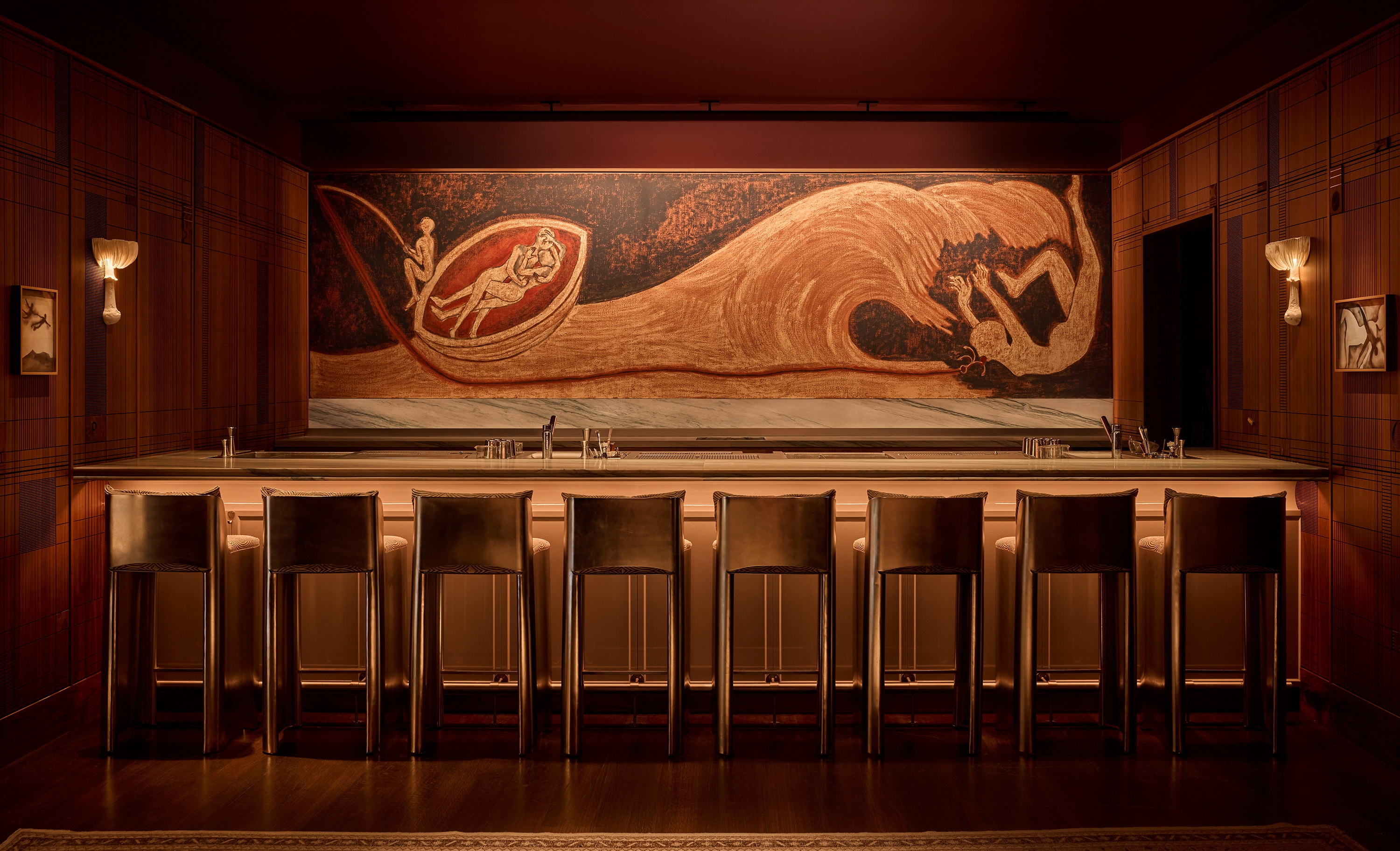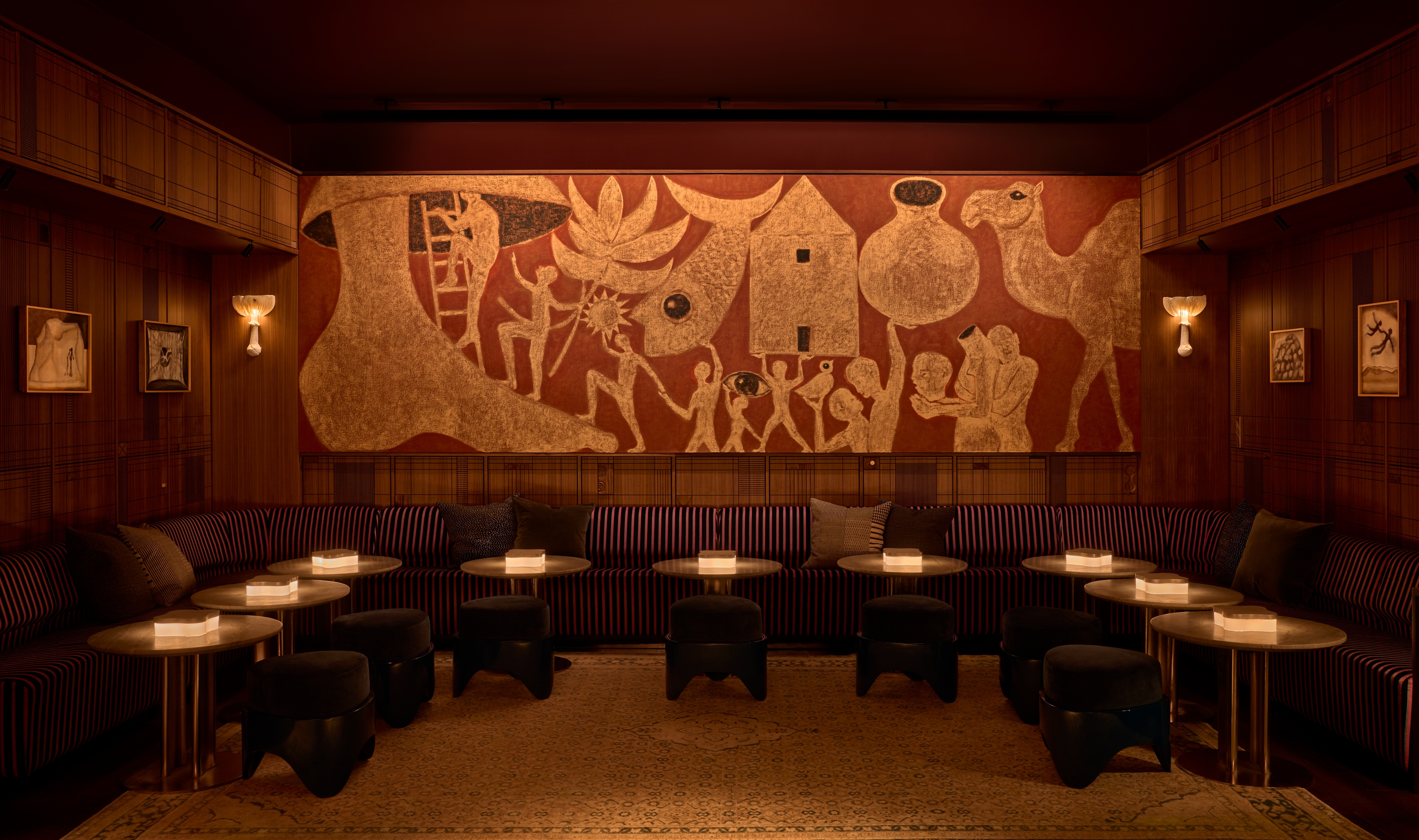 The bar’s atmosphere is built from a layered lighting approach in response to textures and the rich range of materials. A palette of warm color temperatures—from 2000K to 2400K—creates subtle tonal differences between seating zones, walls, and – most importantly, art. Murals at the scale of walls illuminate the room as lit pieces themselves. Lighting is integrated into hidden coves and through curated fixtures. While art glows with a consistent, soft presence, miniature projectors are positioned to bring out lifts in tone and texture; accentuating brushwork and gilded surfaces, while pockets of seating are accented so as to create a truly intimate ambience.