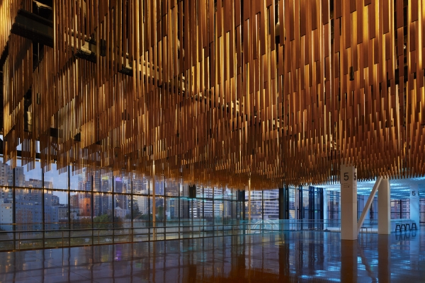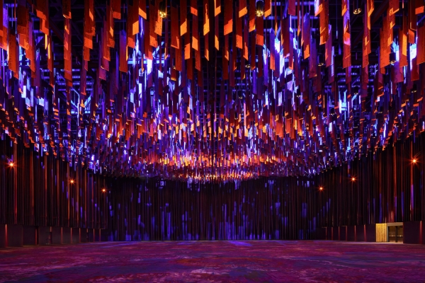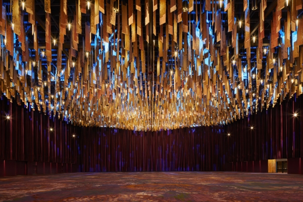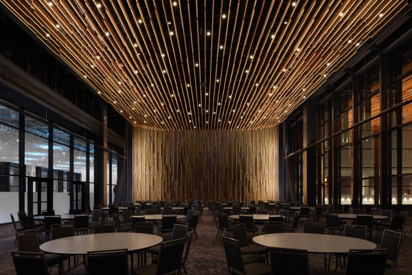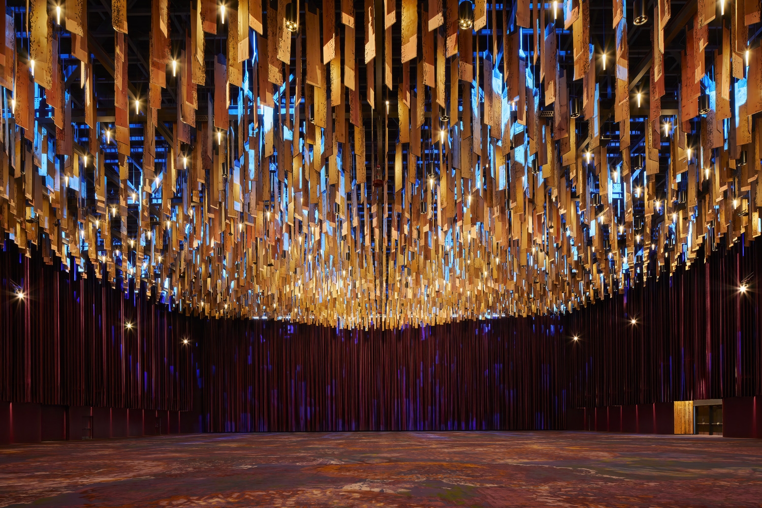 Inside the 58,000 ft2 ballroom, a sculptural wormwood ceiling evokes a native forest canopy. Light becomes storytelling—layered illumination is hidden within architecture, including glowing pendants casting a warm, intimate glow across the canopy. Embedded motorized fixtures—with framing, gobo, and color control—are networked via DMX for full theatrical flexibility allowing the space to adapt to each client’s vision.