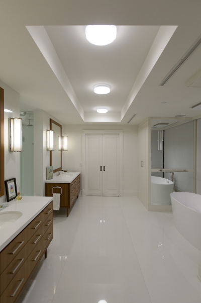 Complexity of spaces, compounded by coffered ceilings and tiny coves, was successfully addressed by asymmetric patterns which add interest and support the interior design and architecture. Difficult glossy, reflective surfaces were addressed with careful concealment of light sources in the ceilings, walls, coves and niches.