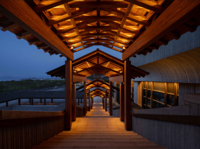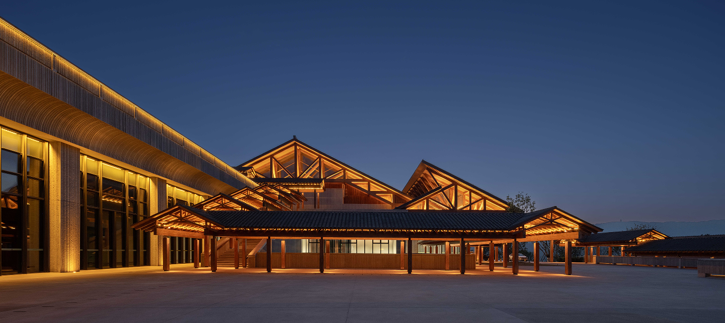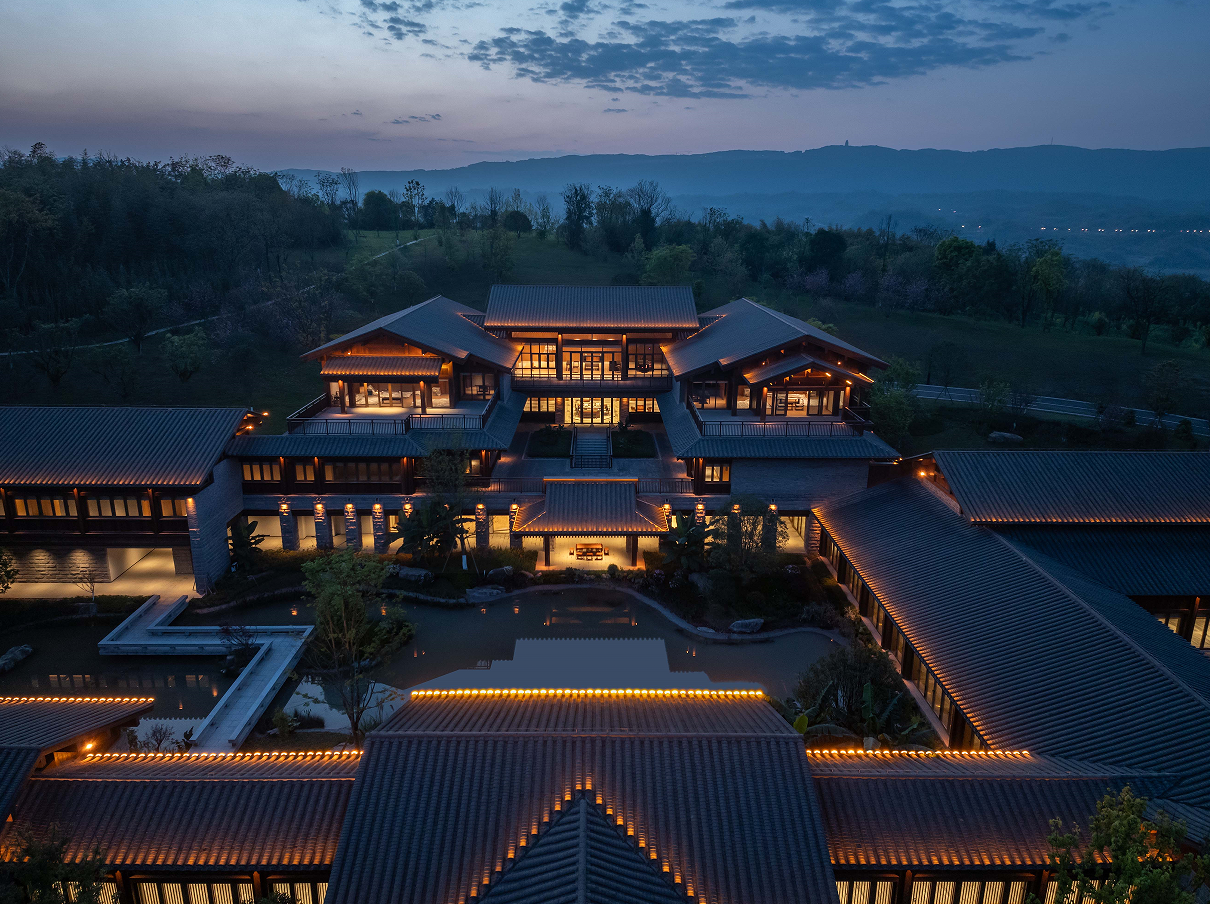 Mountain-Water Integration: Light aligns with terraināmountains nestle water, architecture follows slopes. As night falls, illumination traces mountain contours like brushstrokes, blending external silhouettes with internal structural highlights for a unified fusion.