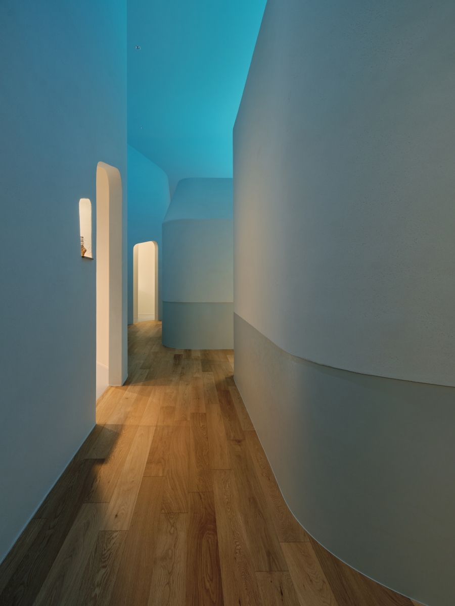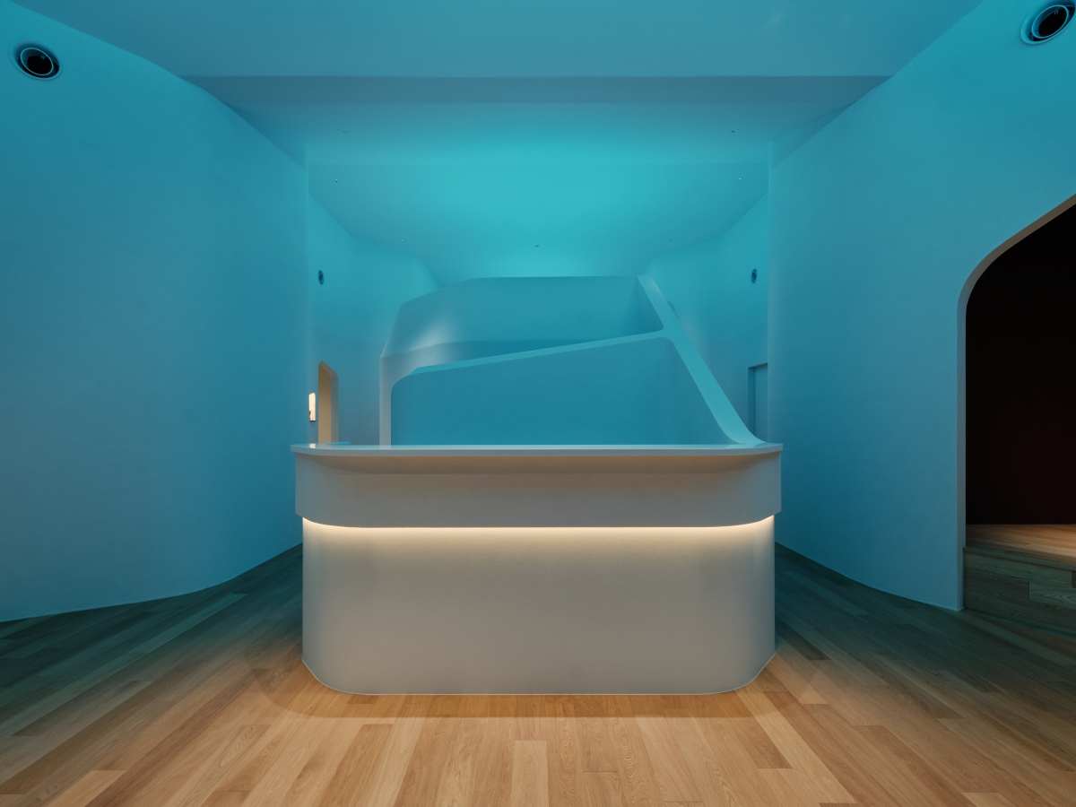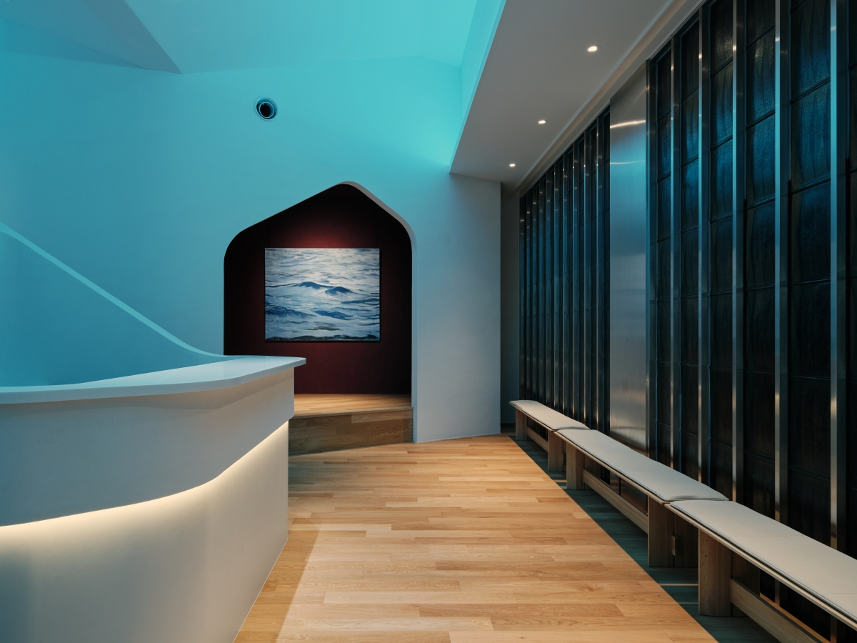 In corridors, Azure lighting extended through elliptically projected light, creating a spatial flow and immersive experience like “Blue Cave.” Color temperature followed the daily schedule: 20000K in early morning for alertness, 3500K during operating hours for focus, and 2700K in the evening to promote relaxation.