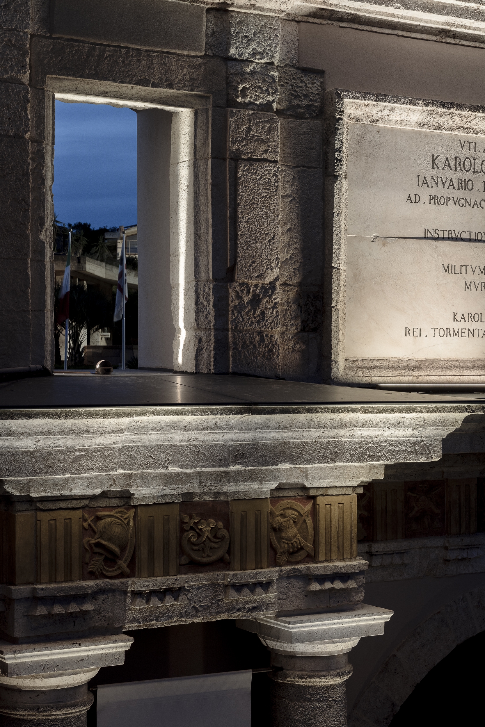 Sustainability ApproachThe light, designed with a dedicated shape on the portal, highlights the same, both in the main scene with the entire system turned on, and in the 2 am scene in which only the portal remains illuminated. The monumental lighting also affects part of the context adjacent to the arsenal gate. The walls forming part of the San Pancrazio complex and the commemorative plaque above the door of Altamira were also illuminated. The portal's lighting changes during the night with three different scenarios: at sunset, at midnight and 2 am. This allows for energy savings and at the same time to give different readings to the monument, highlighting certain parts and highlighting the architectural details and geometric shapes of the portal more clearly. Light pollution is also limited. All the light fixtures are shielded and oriented to project the light flow within the outline of the monument.