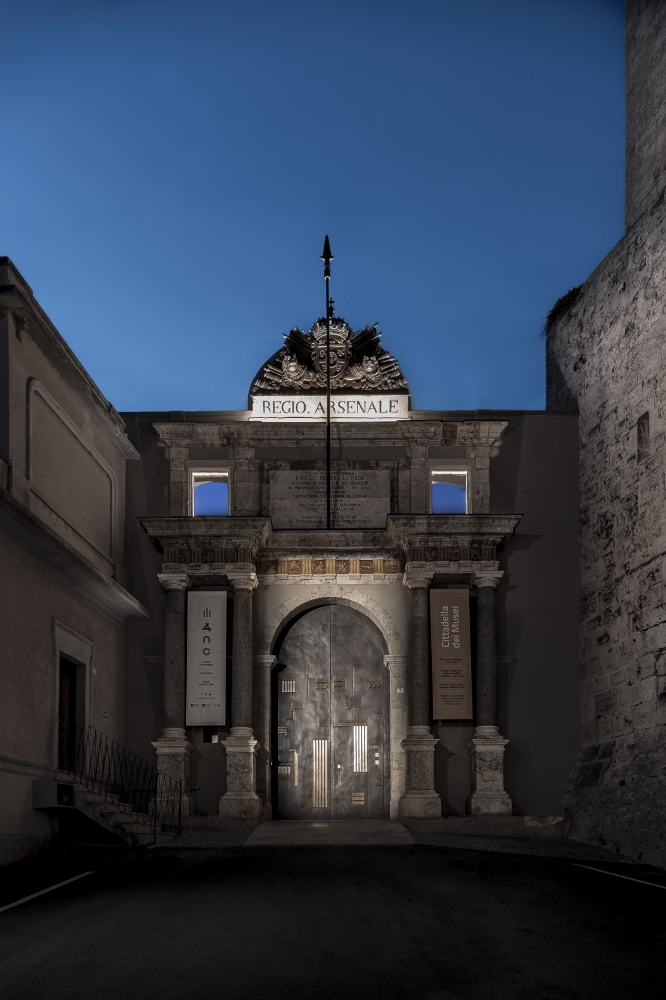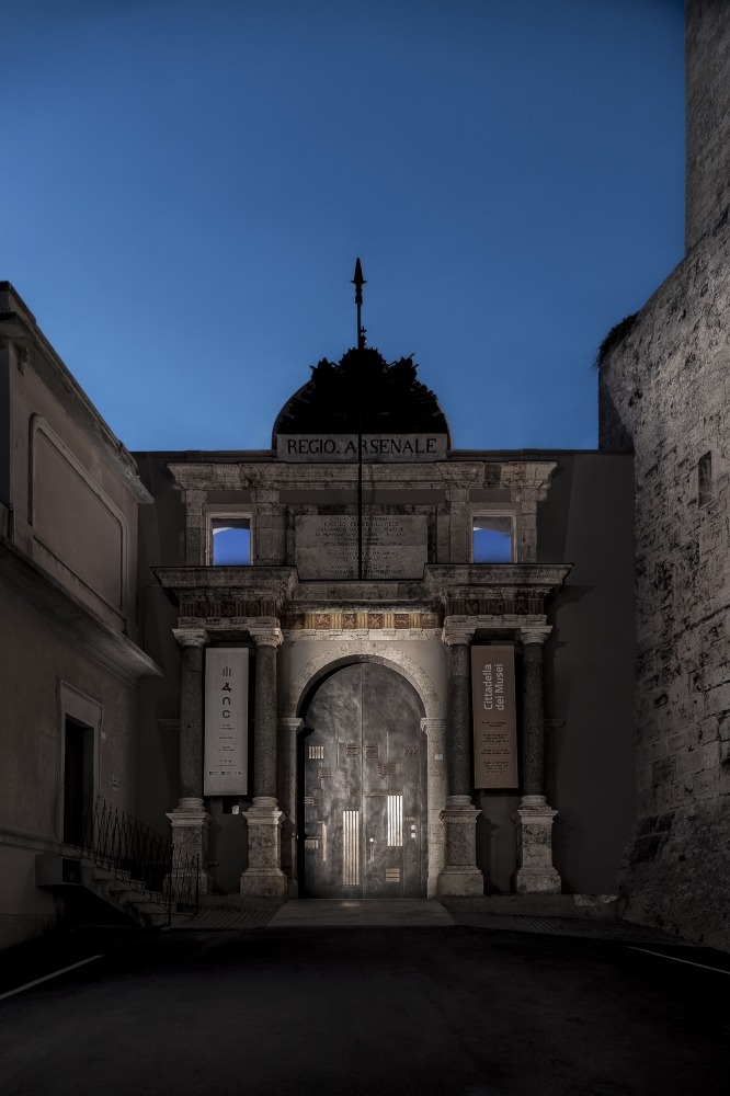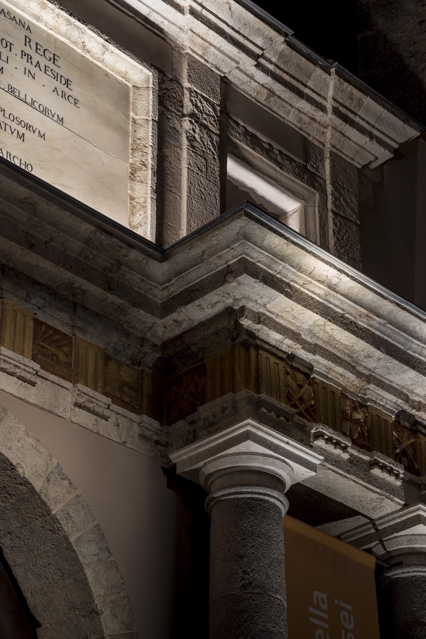 The door overlooks Piazza Arsenale which, yesterday as today, presents itself as a "closed" quadrilateral that welcomes the Castello district. The widening, which allows access to the ancient fortified village, was a true military fortress, while today it has become a scenic, original and highly evocative urban area. The lighting design is part of the completion of the restoration intervention, to enhance the door during the night hours,making it stand out in the magnificent historical context. The new lighting system was designed to be as less visible as possible. The lighting of the portal is almost theatrical,and allows you to read all the architectural parts of it, highlighting the details and the beautiful frieze with the lions above the writing "Regio Arsenale".