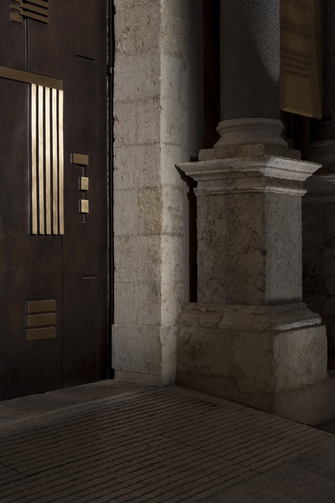 Particular attention was given to the lighting of the bronze portal as it is of particular artistic interest and a prominent element of the monumental door.A shaped light highlights the bronze portal while the remaining lighting highlights the individual architectural and decorative parts of the monumental door.
