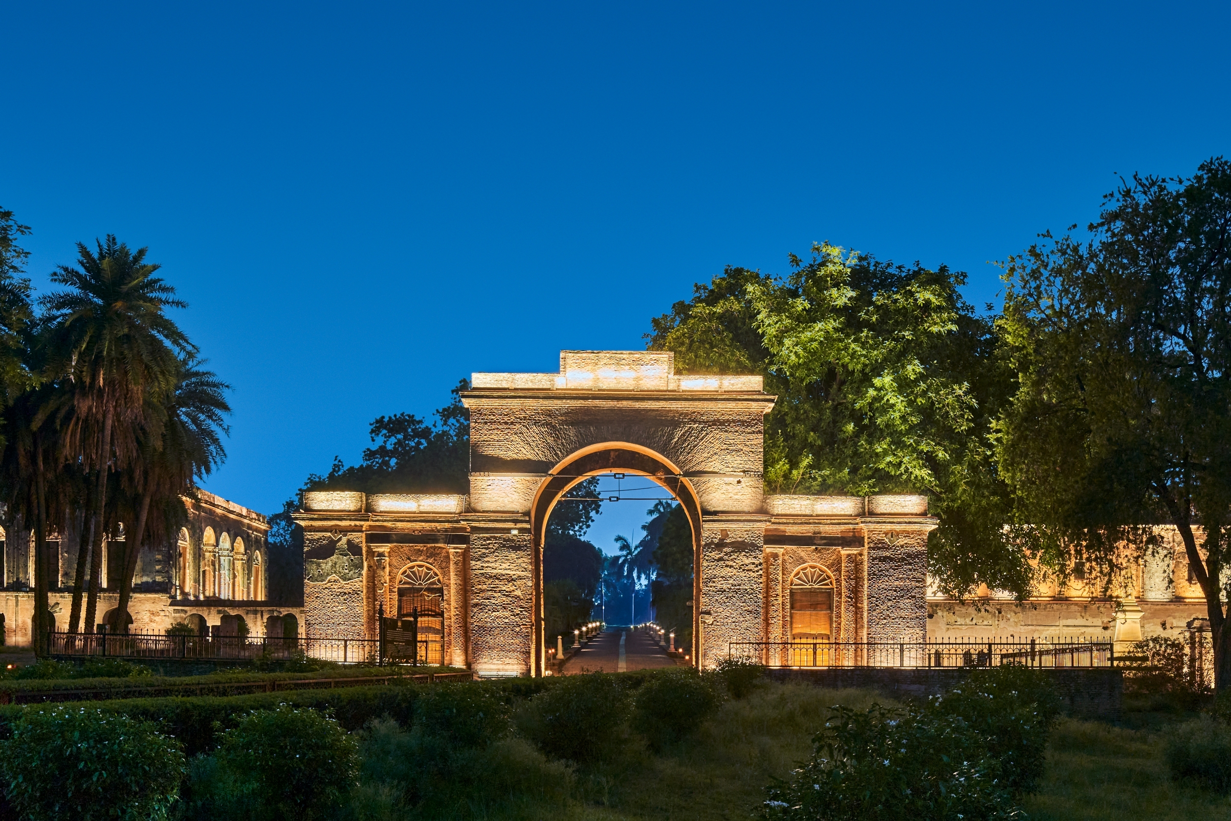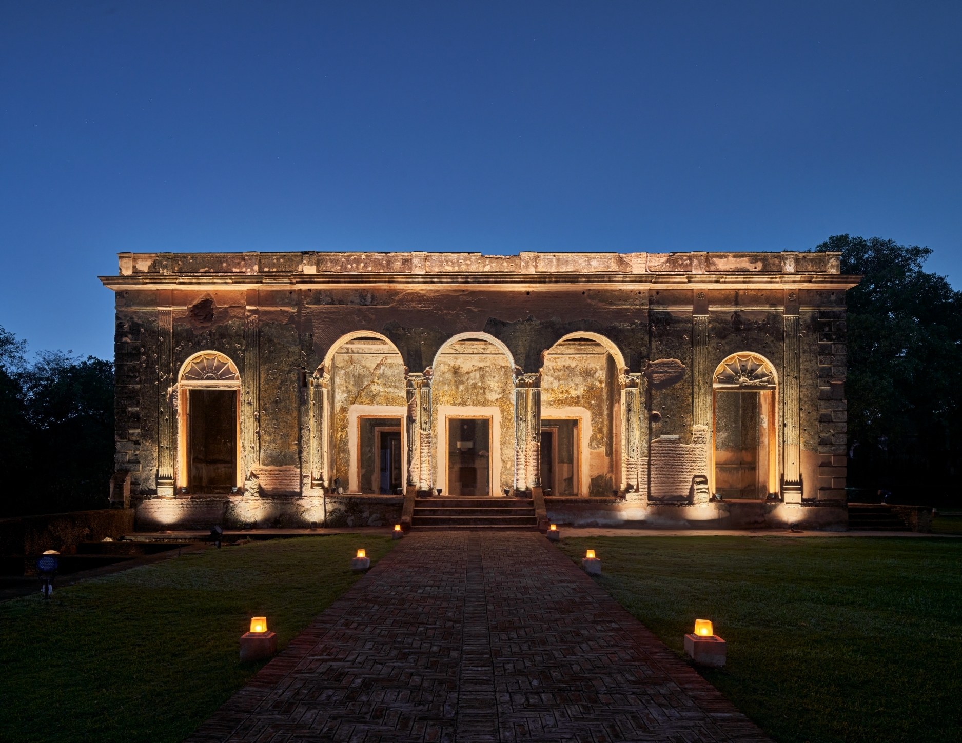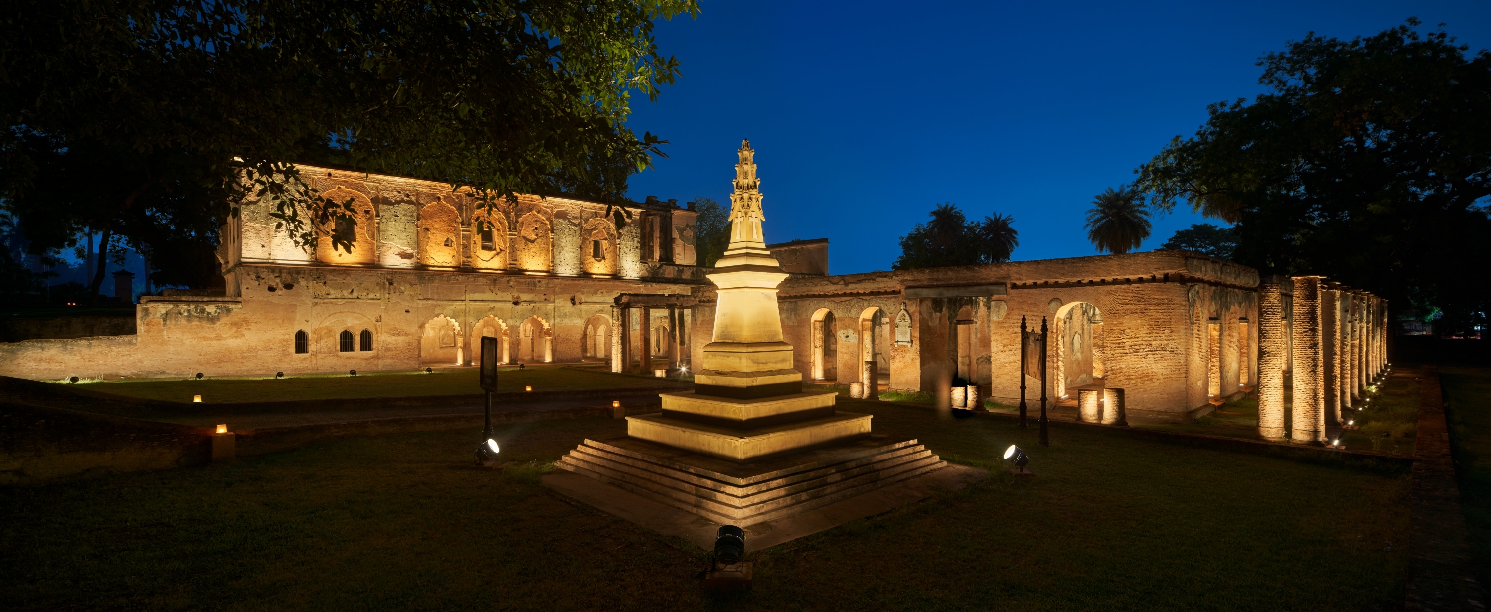 Ambient light provides general legibility; accent lighting draws focus to domes, arches, and surviving structures — now transformed into dignified nighttime landmarks. Pathways and gardens are subtly lit with bollards and lanterns, retaining the heritage charm while ensuring safety.