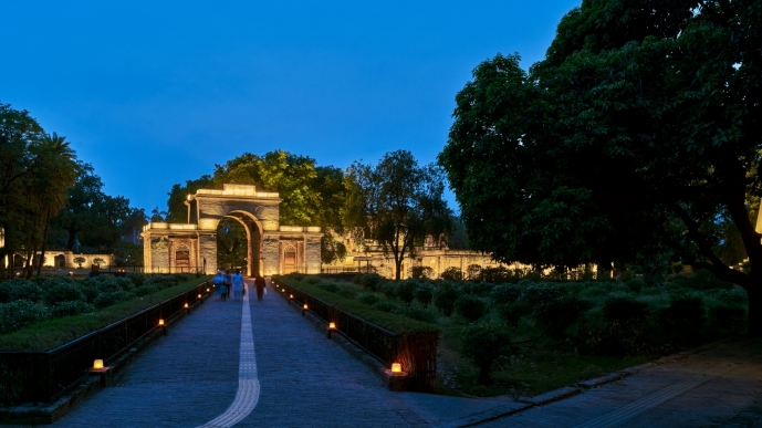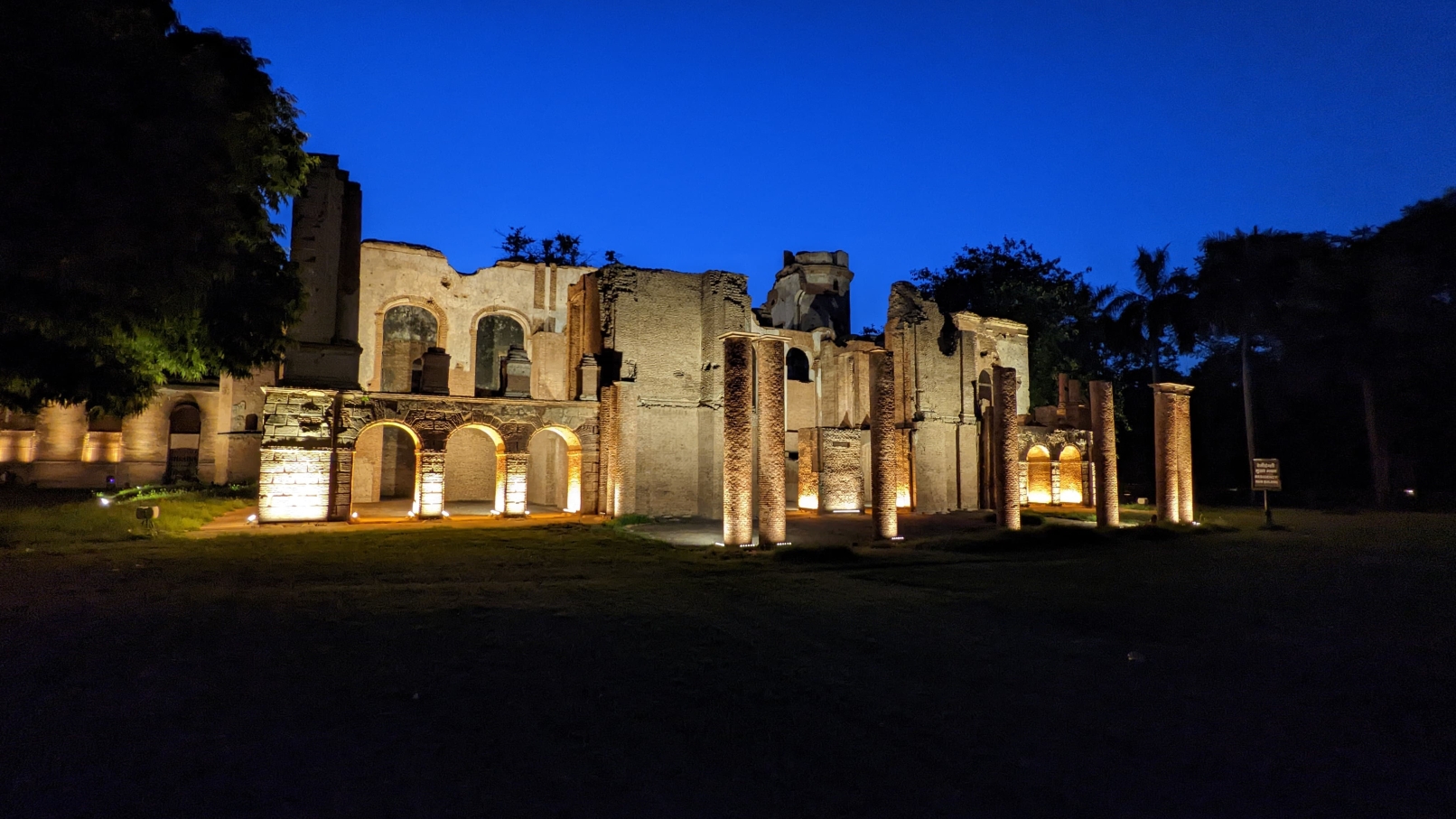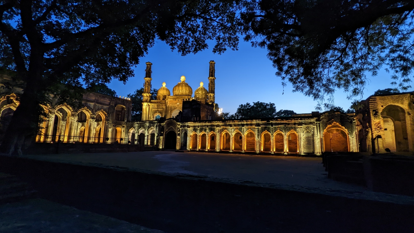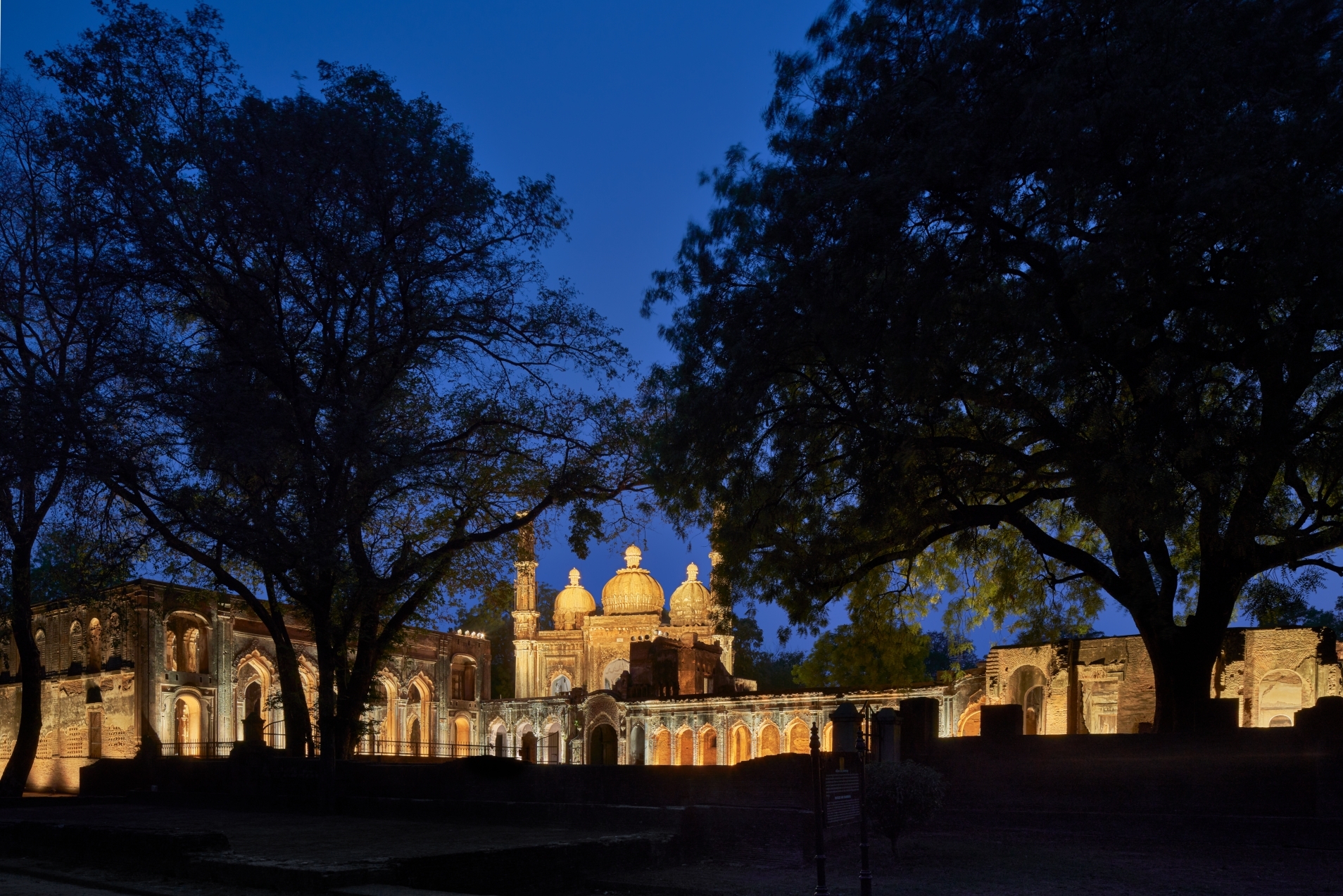 Ambient light provides general legibility; accent lighting draws focus to domes, arches, and surviving structures — now transformed into dignified nighttime landmarks. Pathways and gardens are subtly lit with bollards and lanterns, retaining the heritage charm while ensuring safety.
