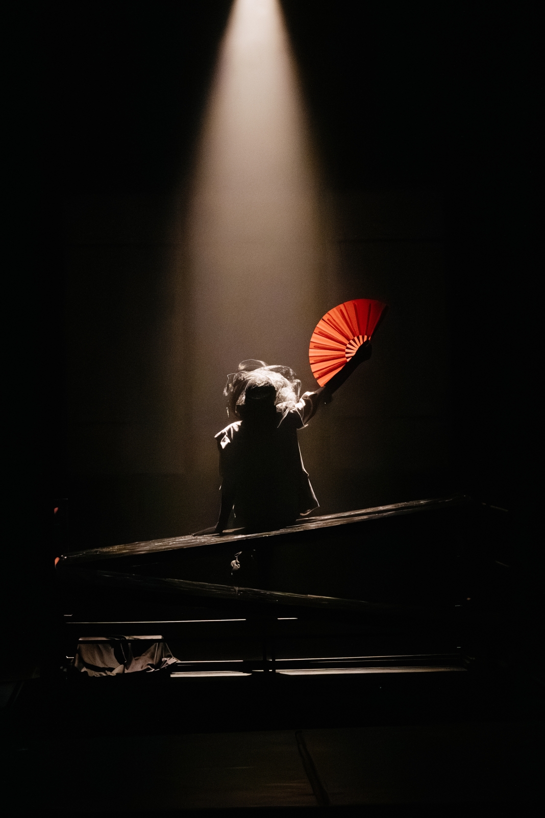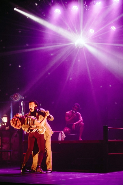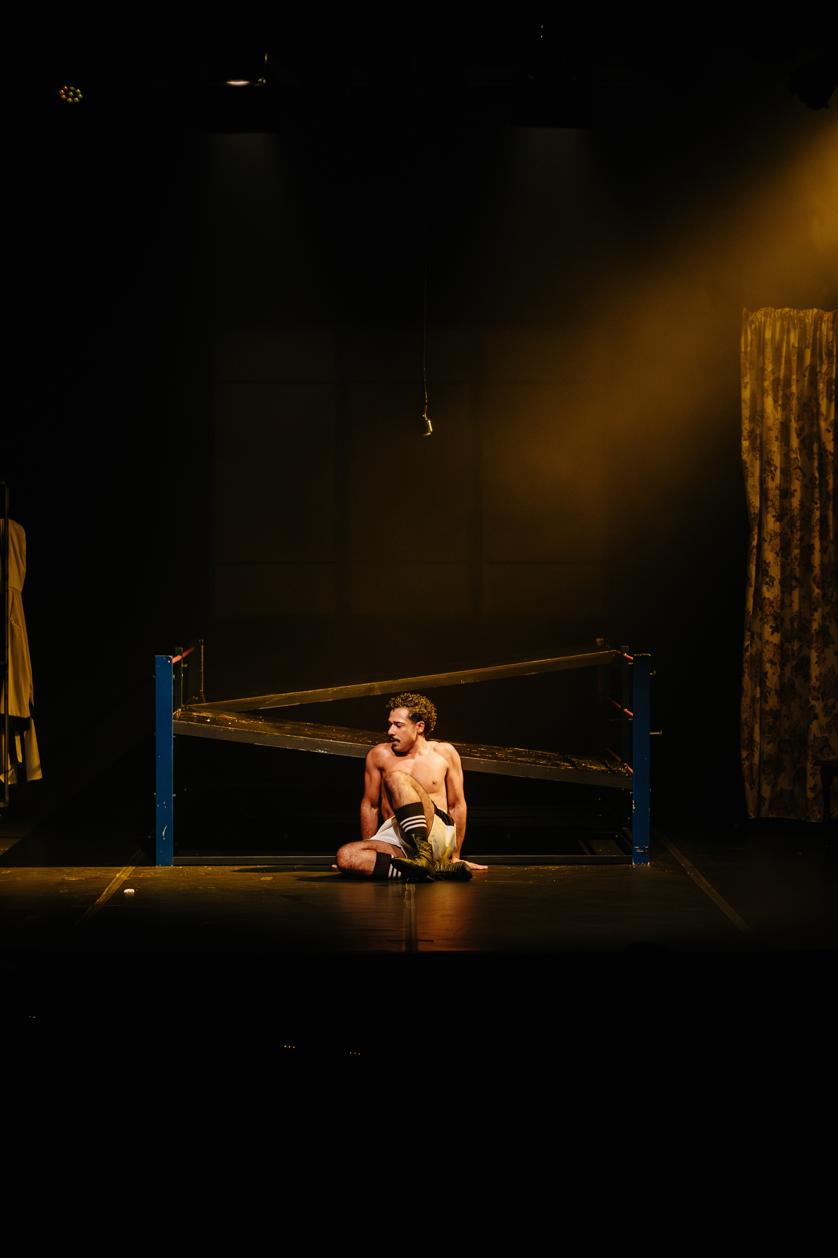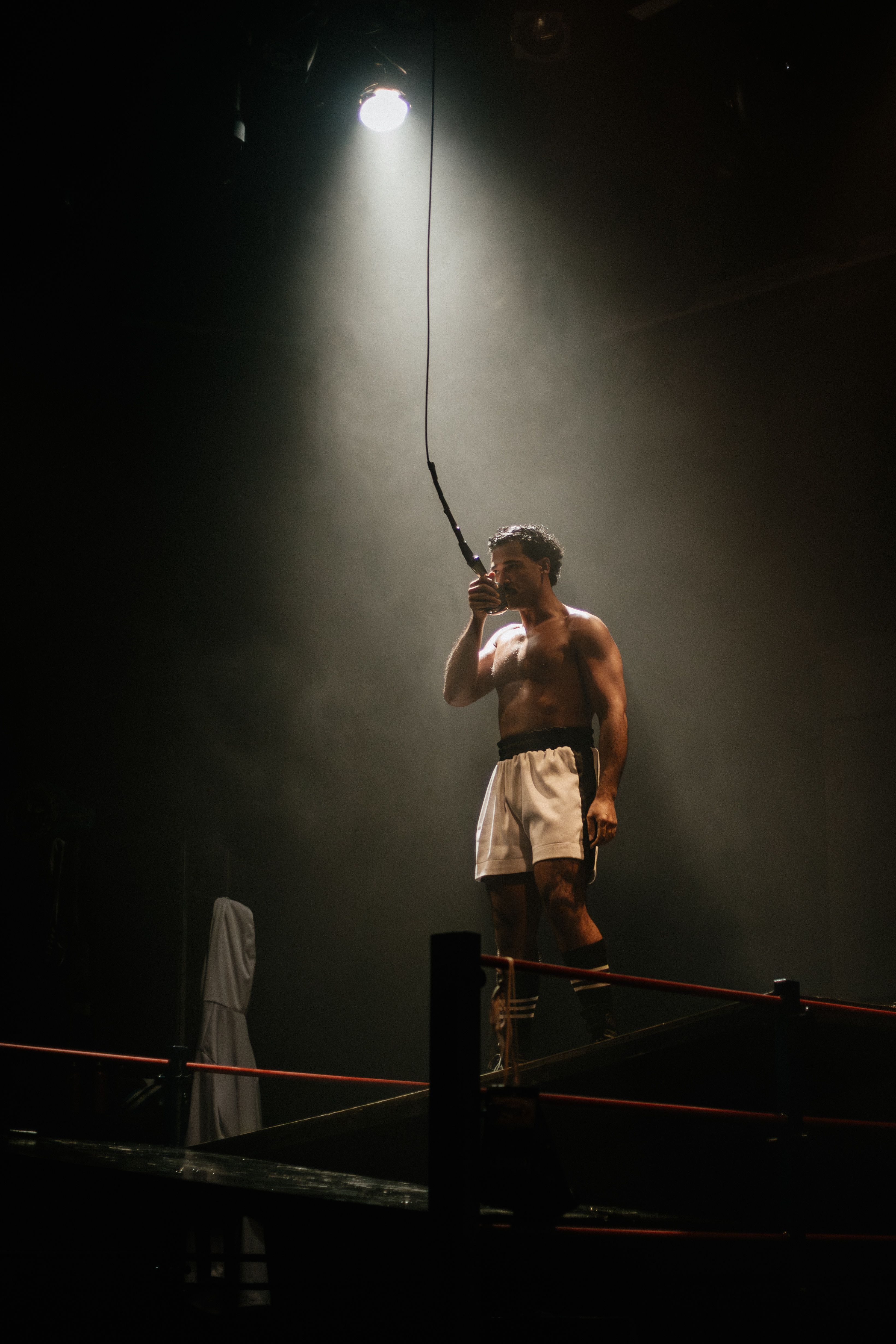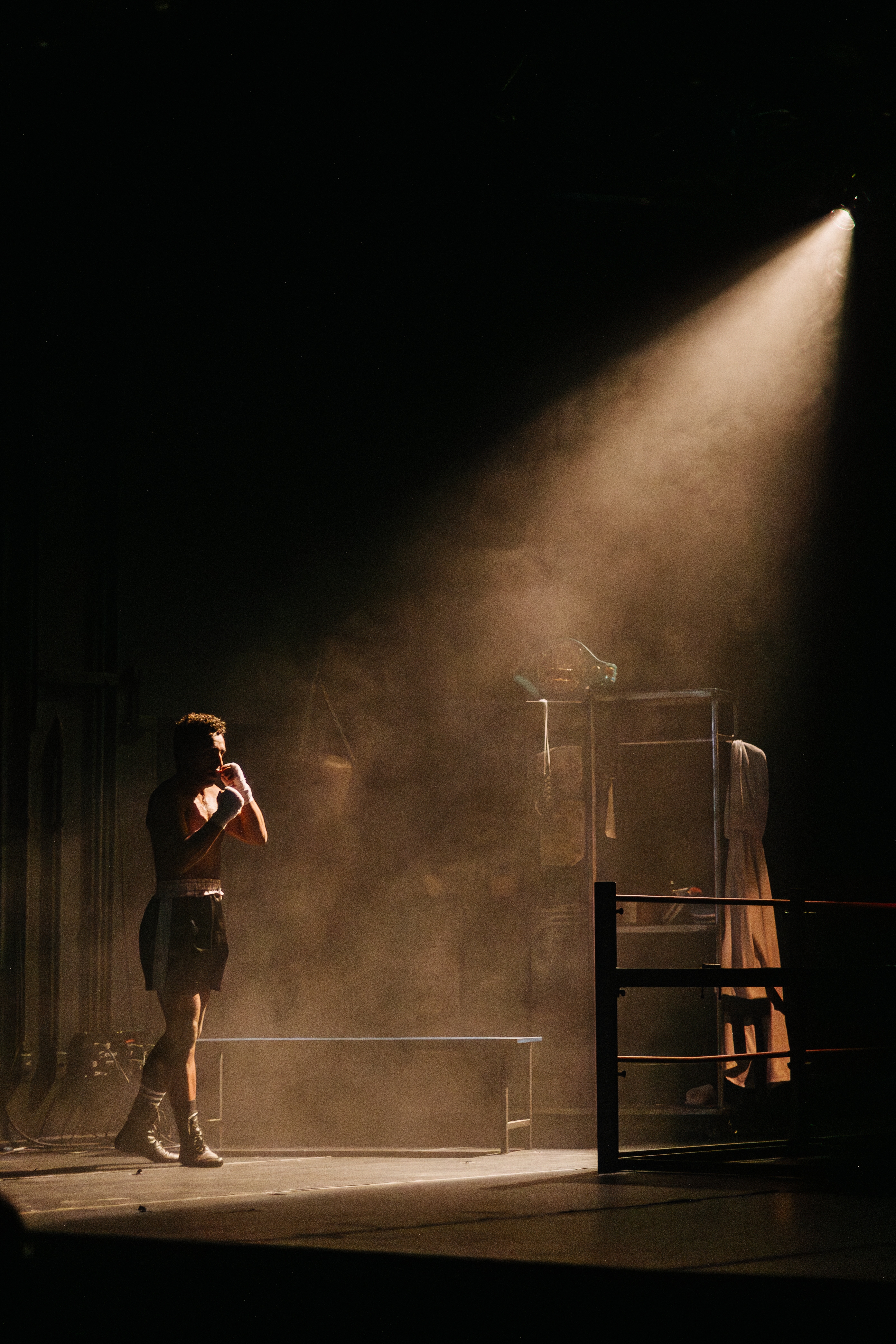 The dramaturgy is structured like a boxing match, in twelve rounds (scenes) of three minutes each, interspersed with one-minute intervals. The direction leads the performance as a stage cine-biography. The lighting was tasked with creating the visual narrative, defining distinct atmospheres and controlling space and time. The design moves between subtle and linear moments and others of great impact, always with delicacy and avoiding literalness through shadows and contrasts. Filters were chosen to enhance the skin tones and Blackness of the cast, in a palette of yellows, golds, chocolate, and purples, reinforcing the poetic density and dramatic expressiveness of the staging.