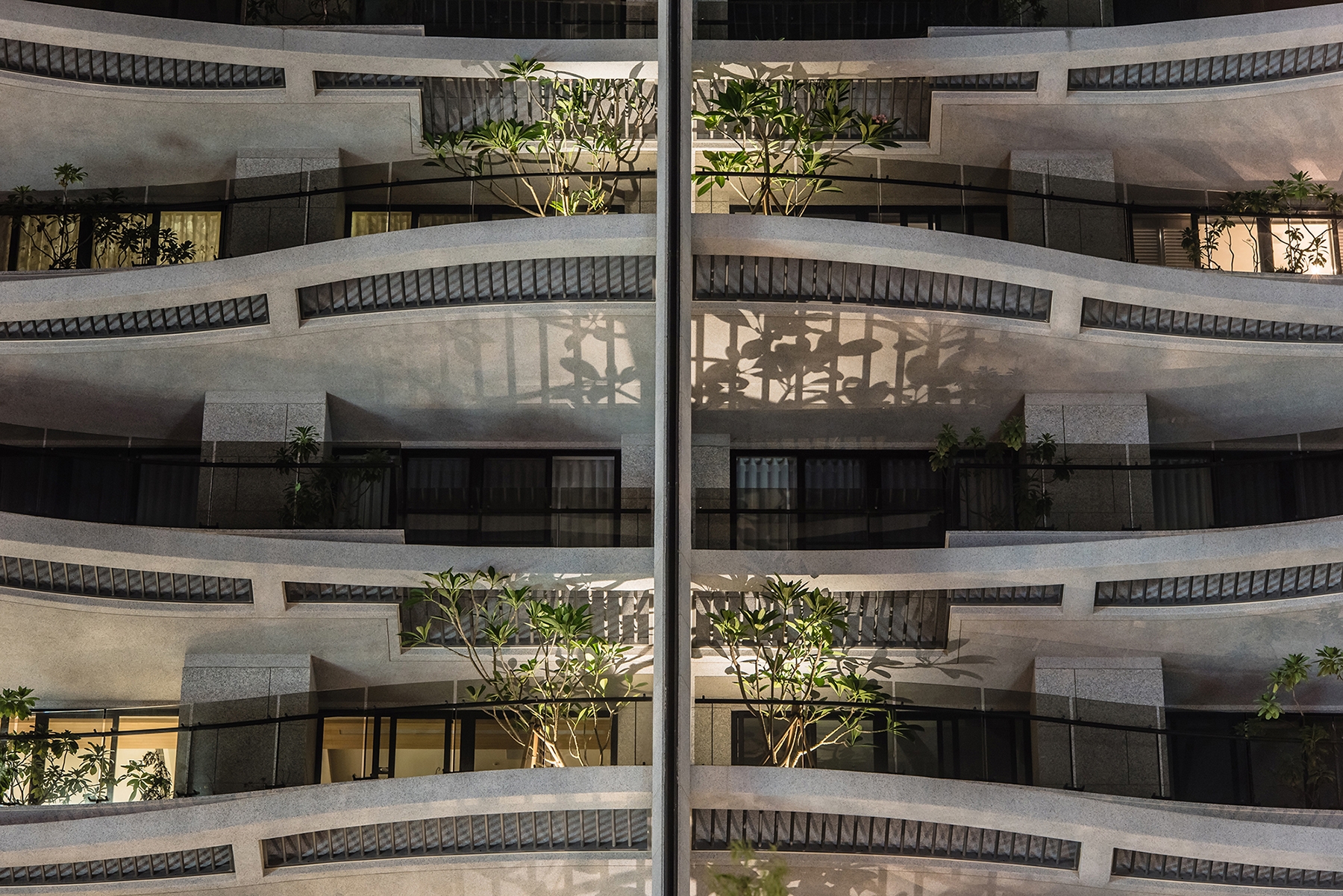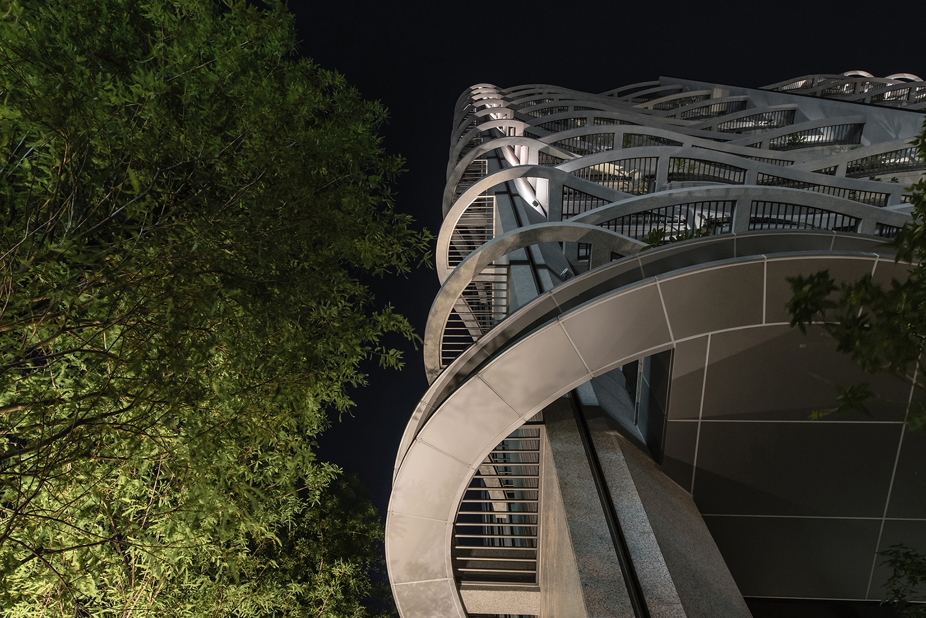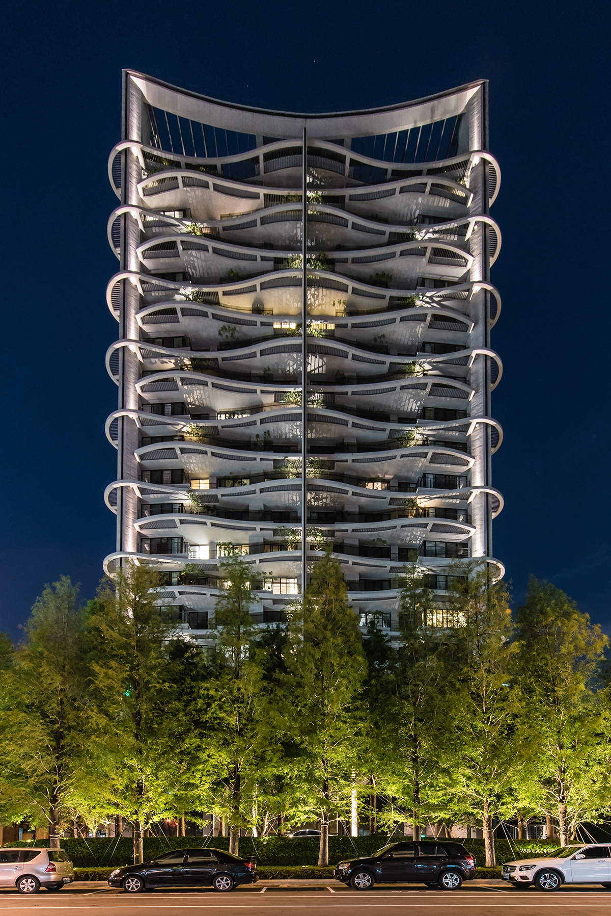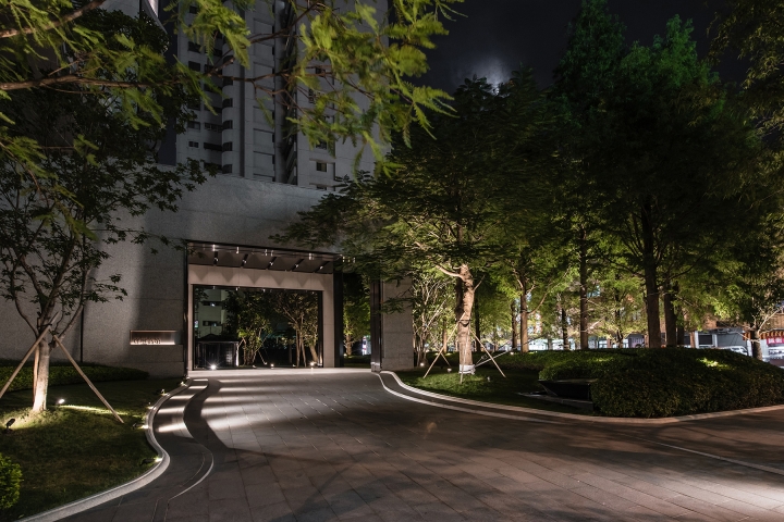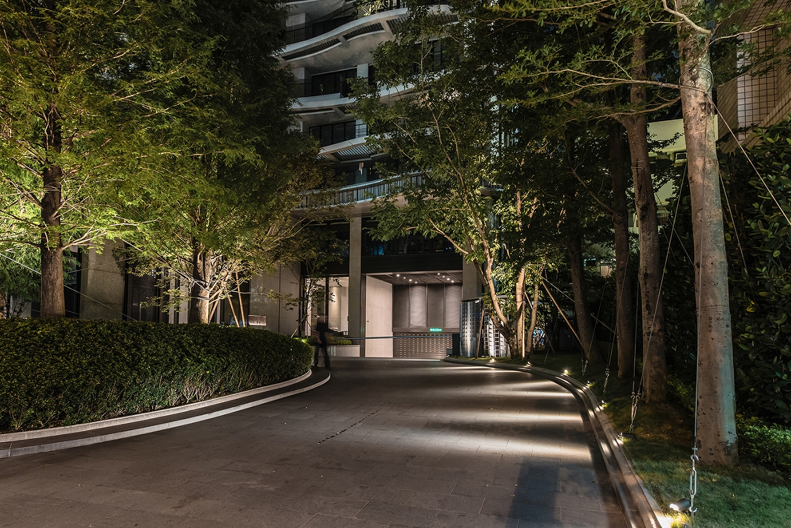 Aside from receiving natural lights, the balcony can also create an ambience using light source at night, utilizing indirect halation from the bottom to the top, presenting a rich layering to the building. The shadow of the tree reflects at the balcony top, creating a sense of elegance and tranquility like an oriental ink painting.