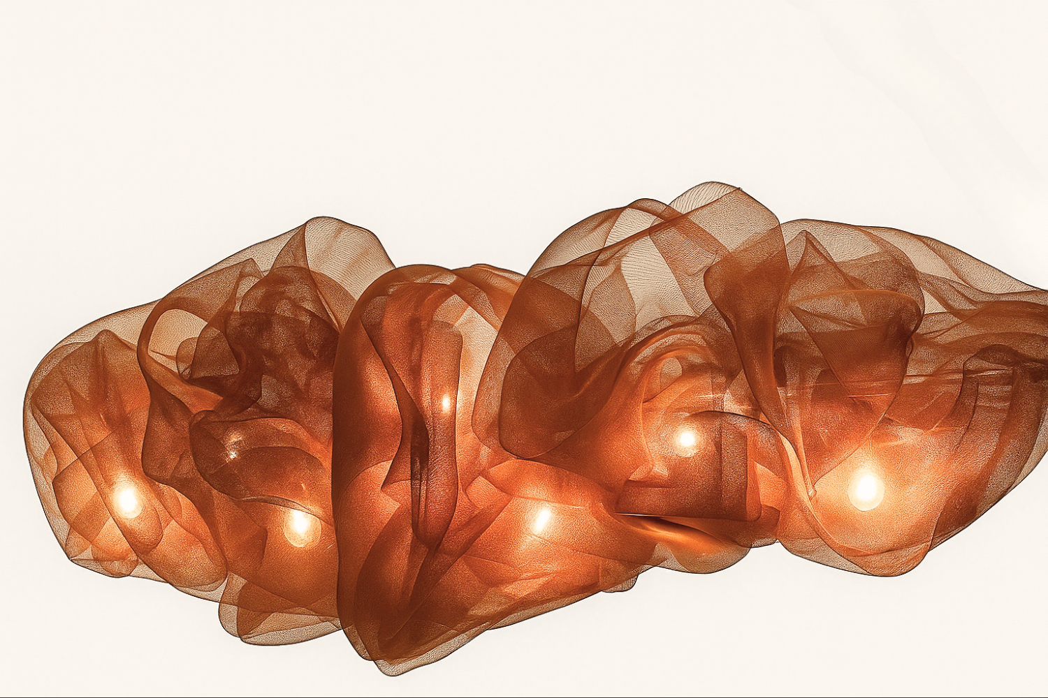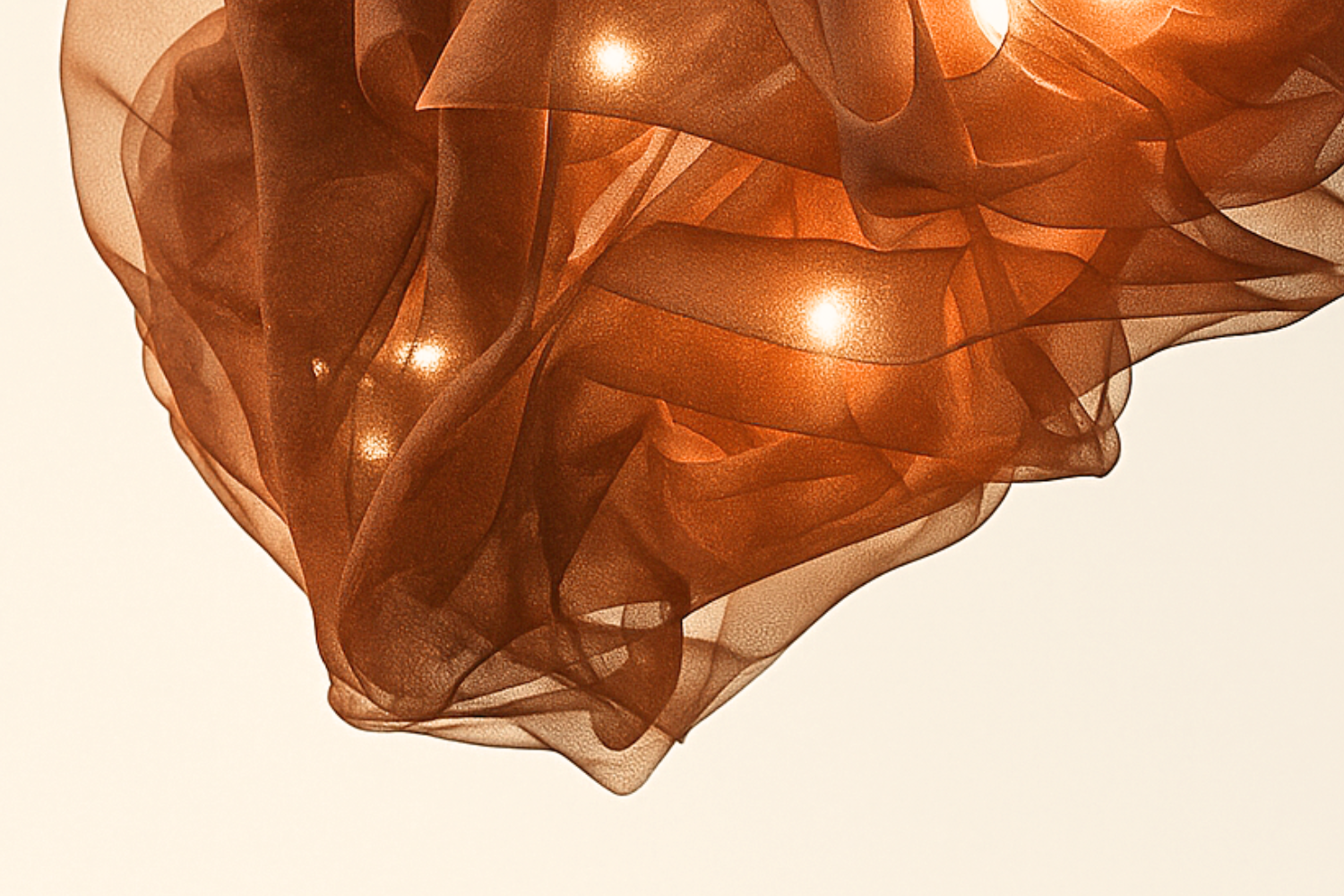 The form is organic, asymmetrical, and intentionally imperfect, with each piece subtly unique—reflecting principles of wabi-sabi and natural impermanence. Layers of mesh catch and scatter light, creating soft shadows and a warm ambient glow, without the use of traditional diffusers.