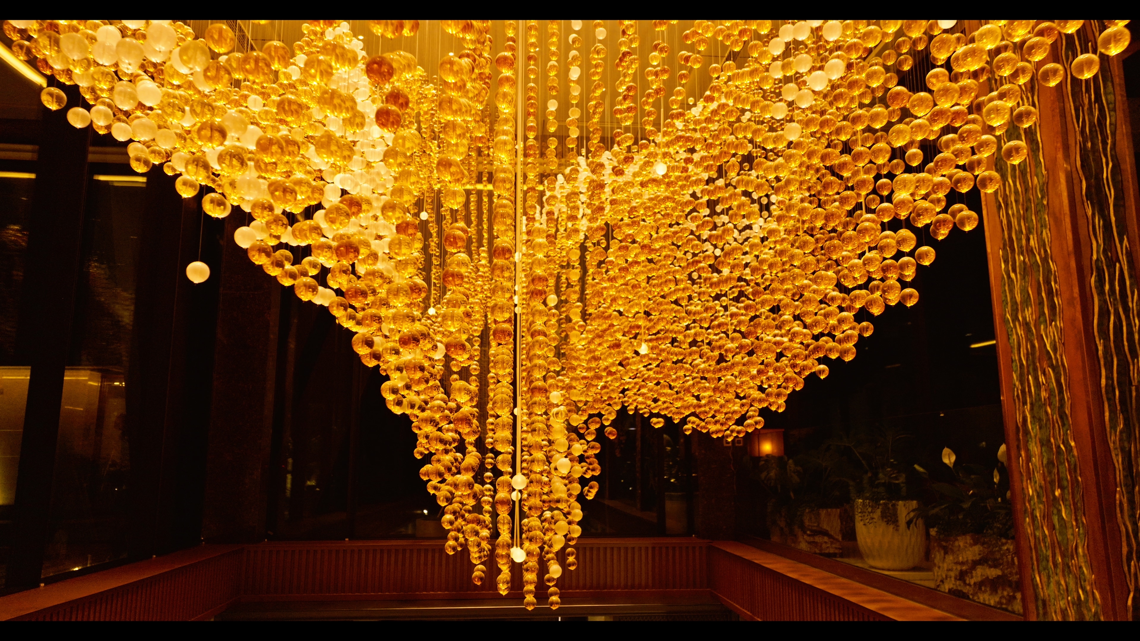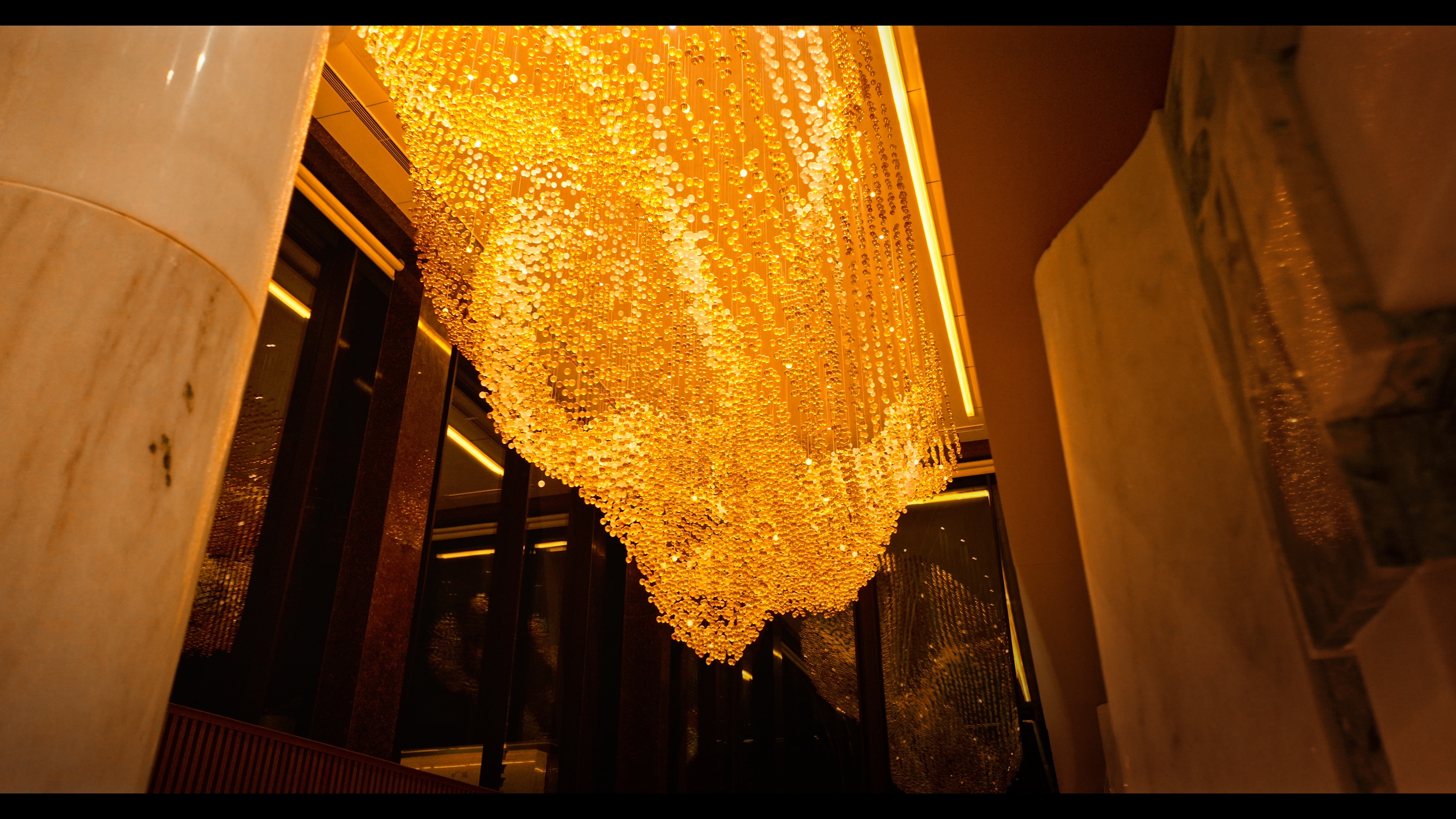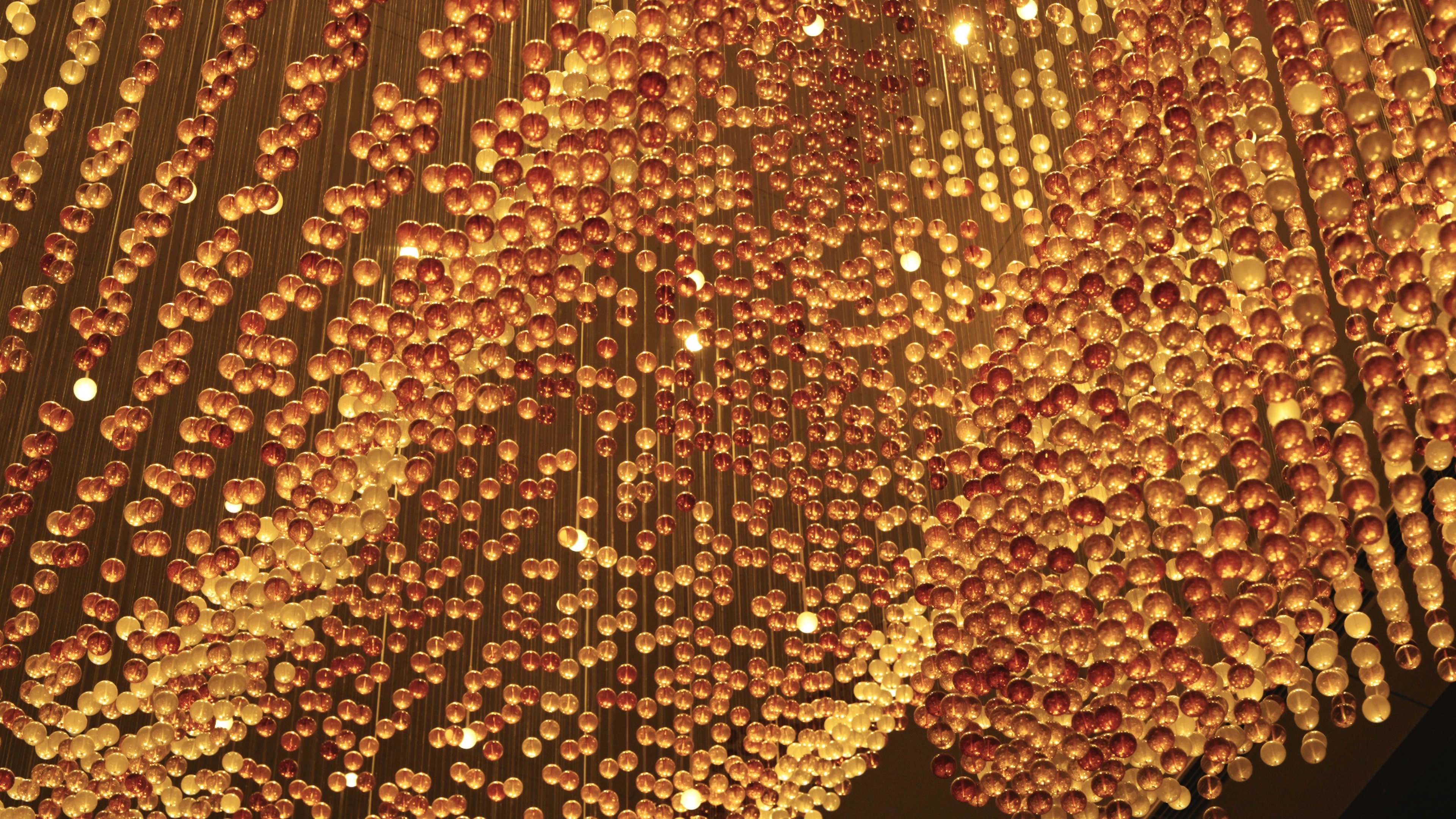 The overall form of Lua, consisting of more than twenty thousand solid glass balls, is inspired by the movement of silk.