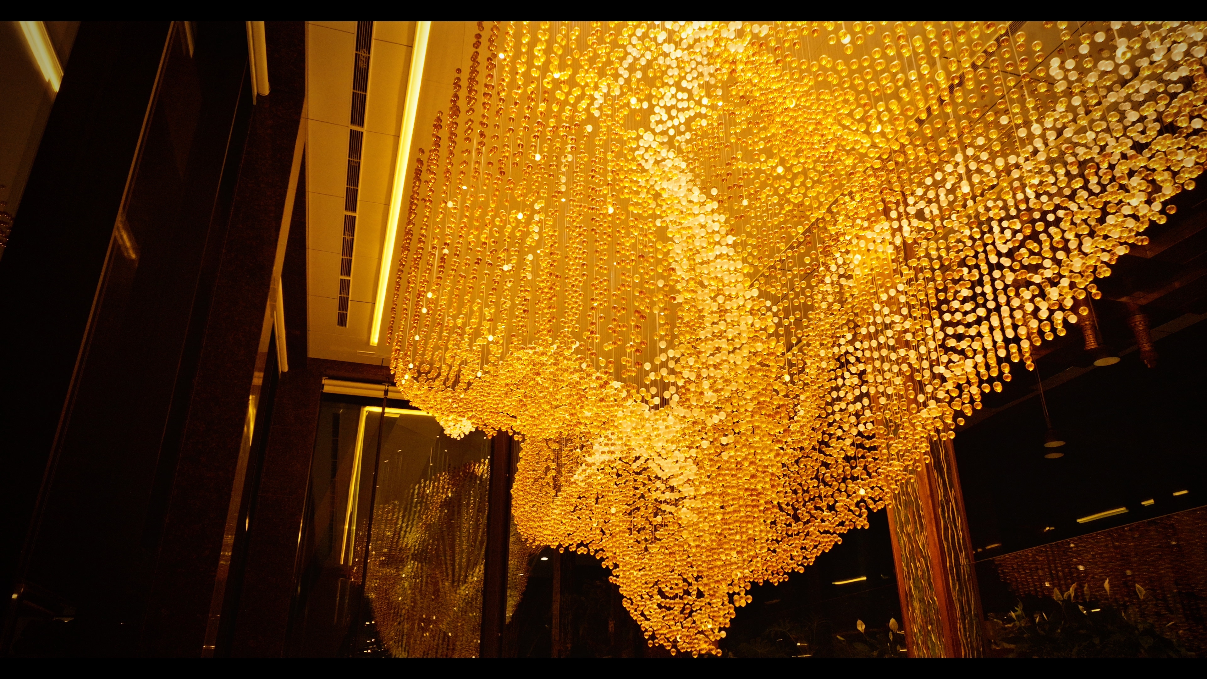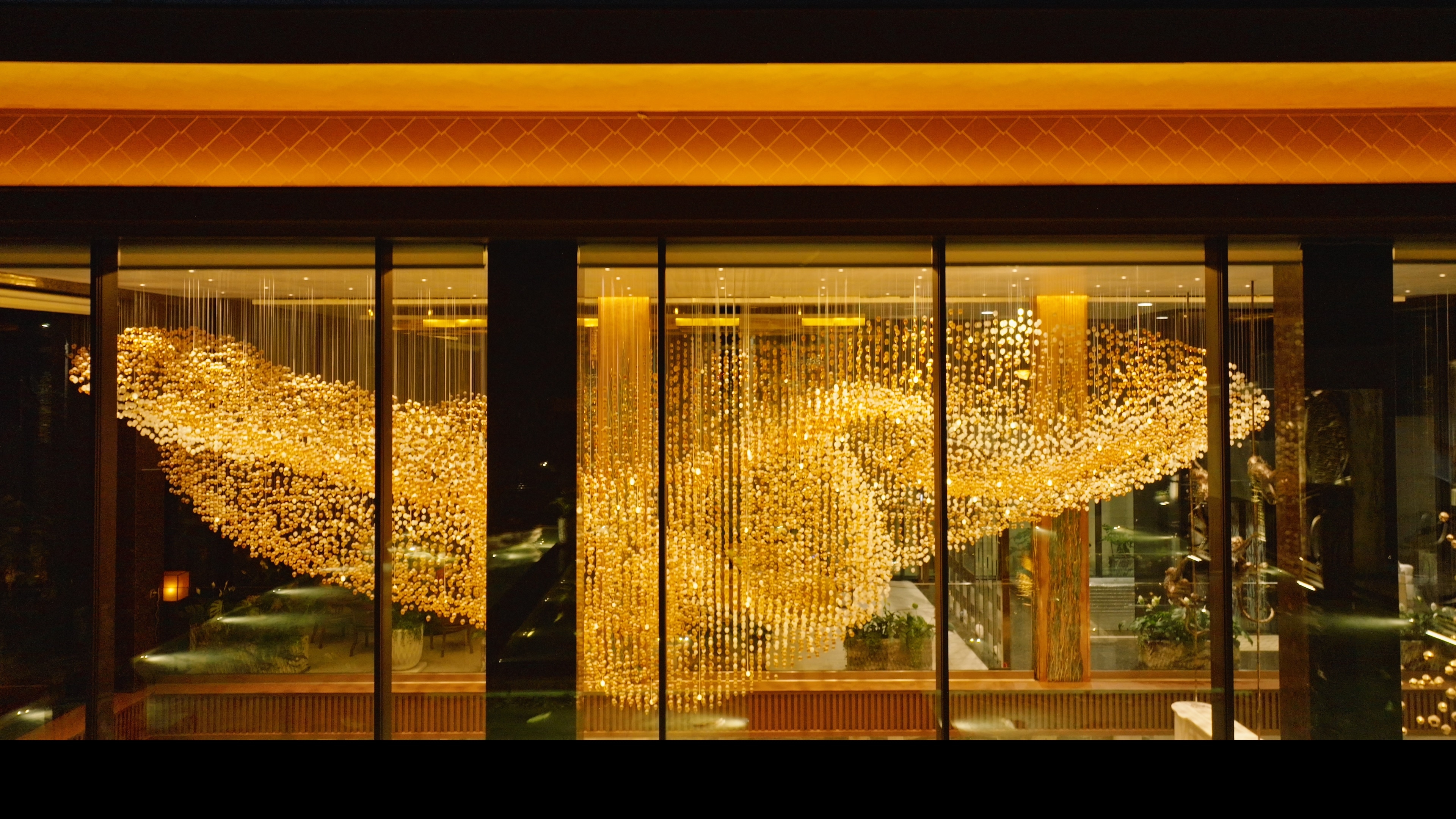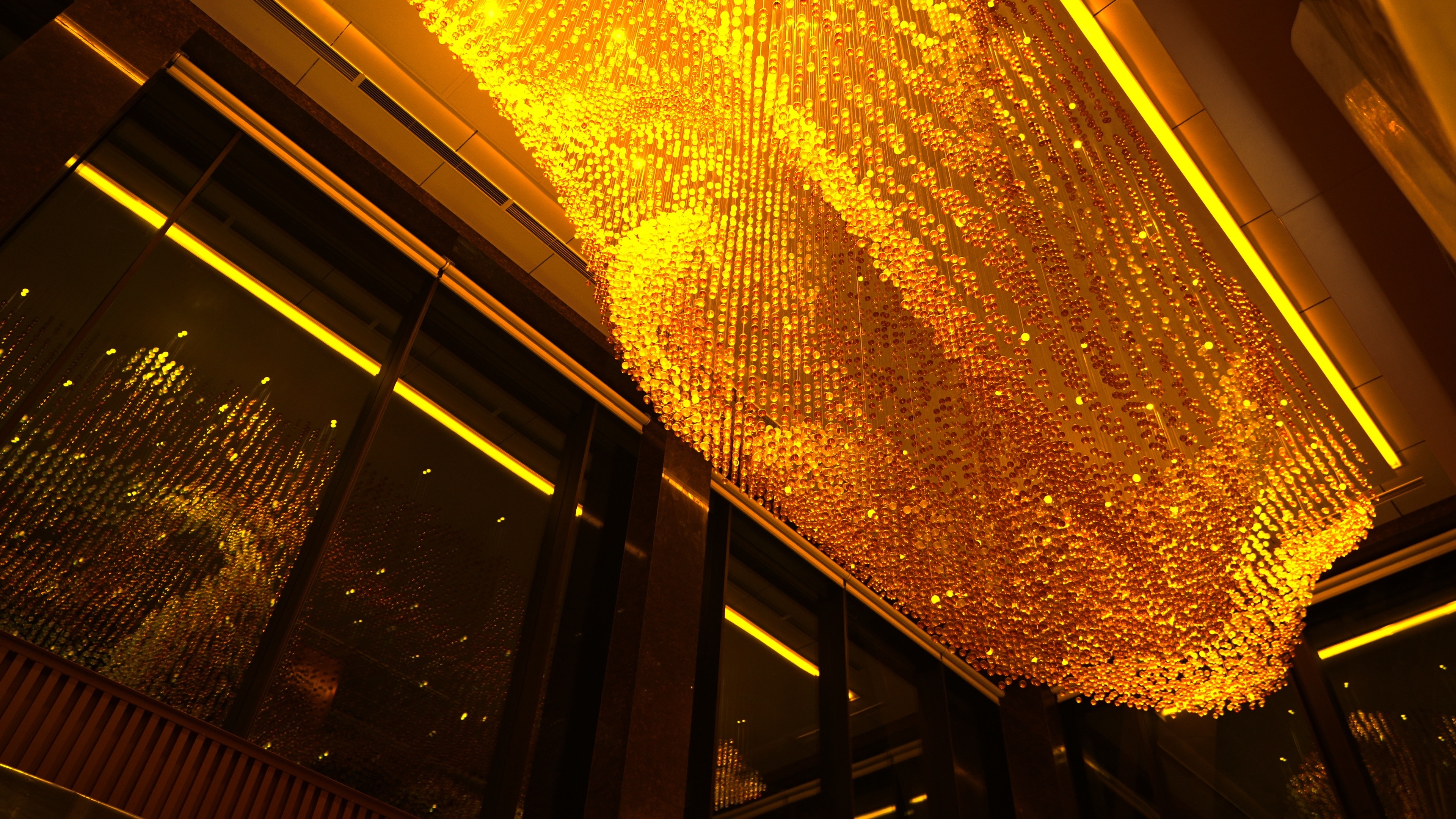 The overall form of Lua, consisting of more than twenty thousand solid glass balls, is inspired by the movement of silk.