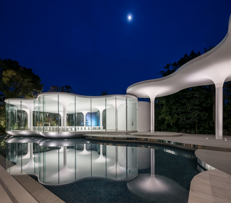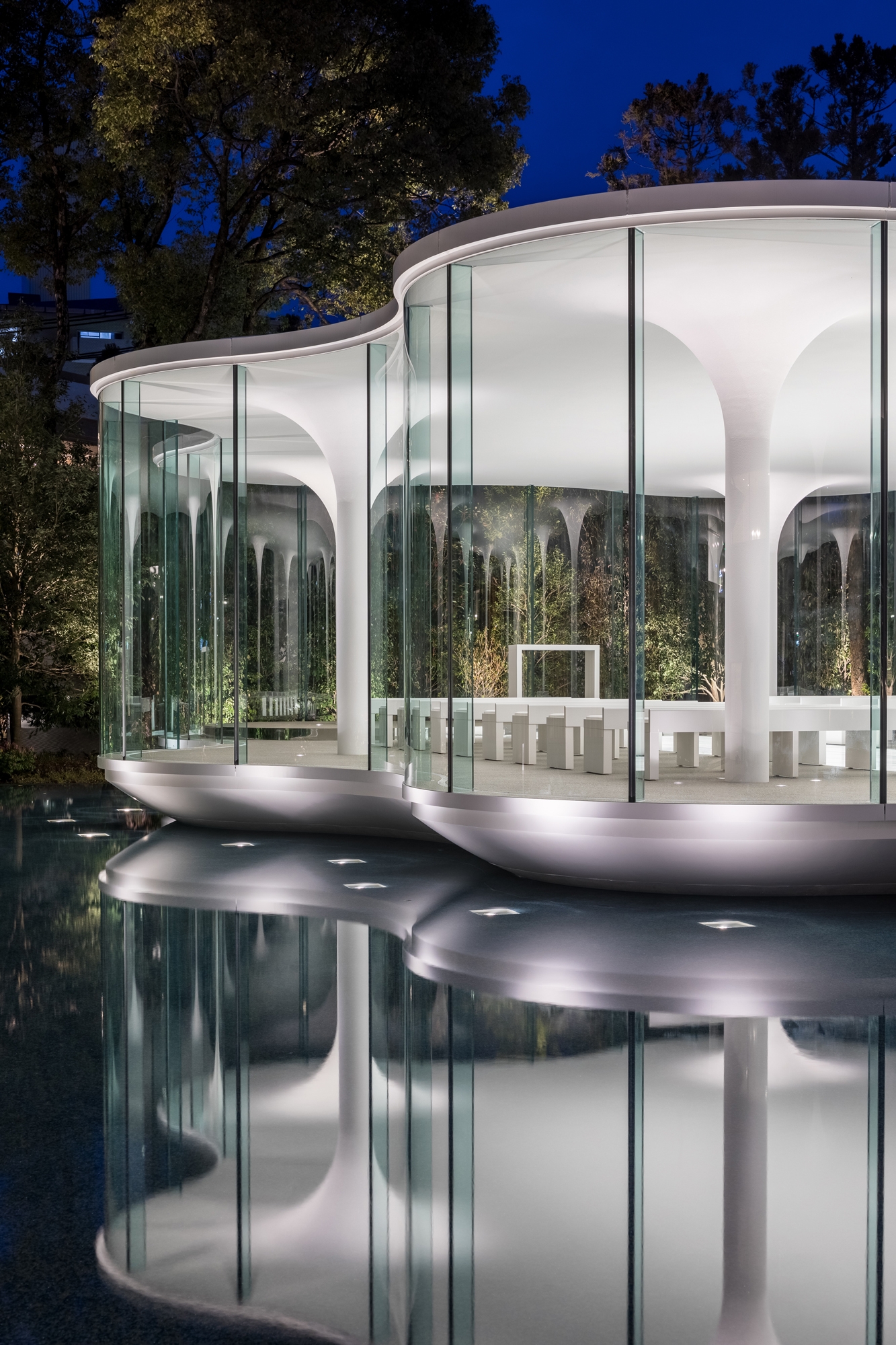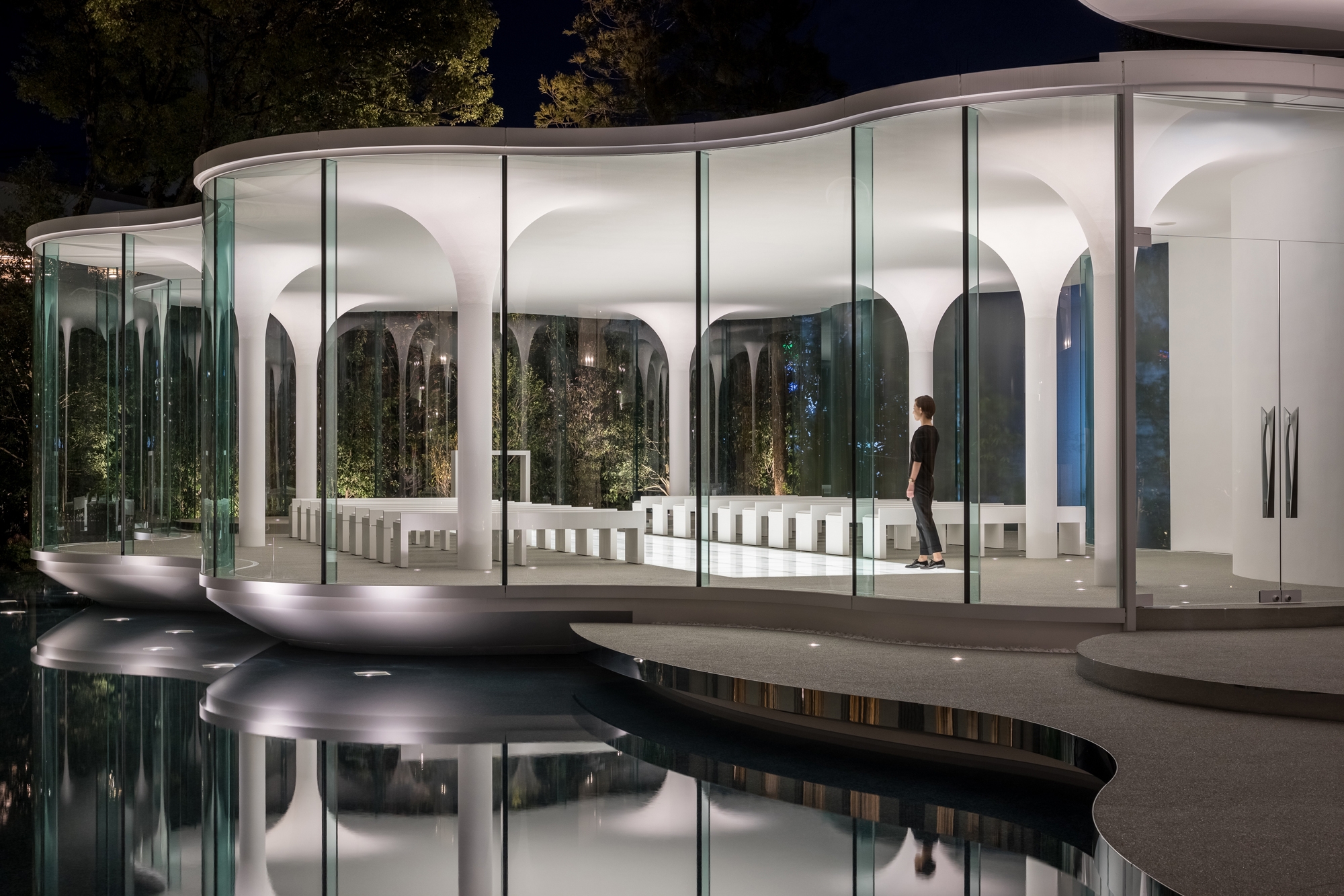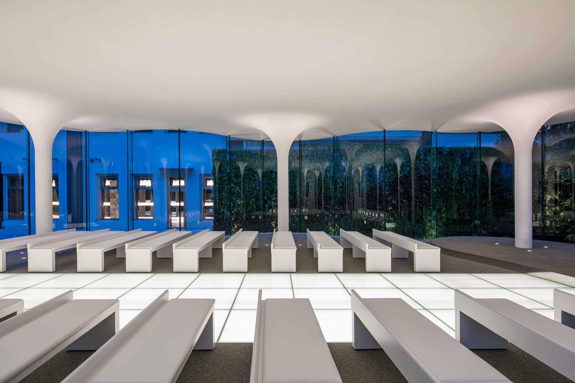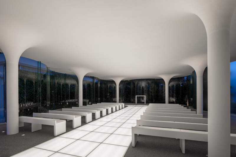 The Cloud shaped Chapel is all white, a minimalistic ceiling free of any technical pieces of machinery or equipment is supported by round columns with a hyperbolic cone head. The same columns support the roof of the approach connecting the main ceremony hall to the chapel and give access to the garden. The circles on the basin side have a hyperbolic shaped base, creating an impression of a floating chapel. The water surface reflects the floating chapel adding more lightness to the structure and extending the dreams into other dimensions.