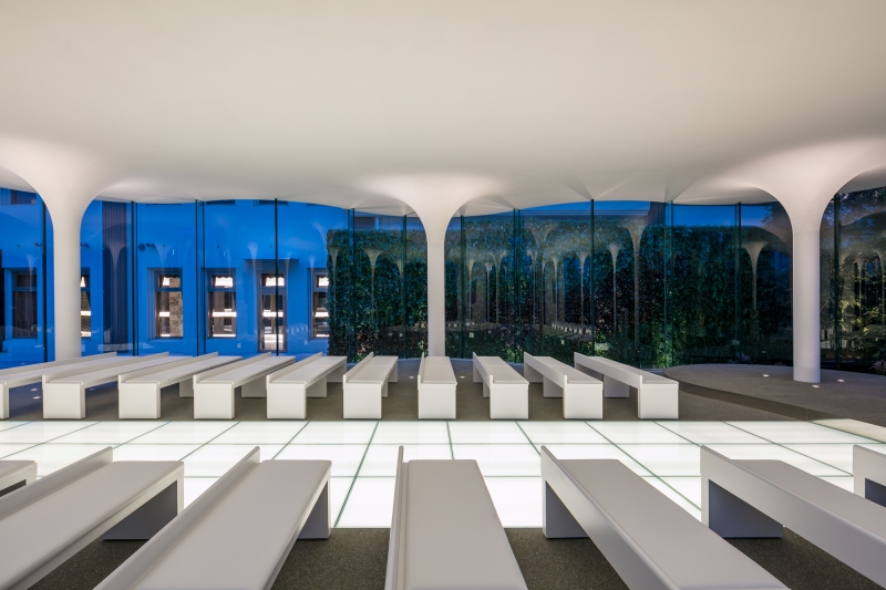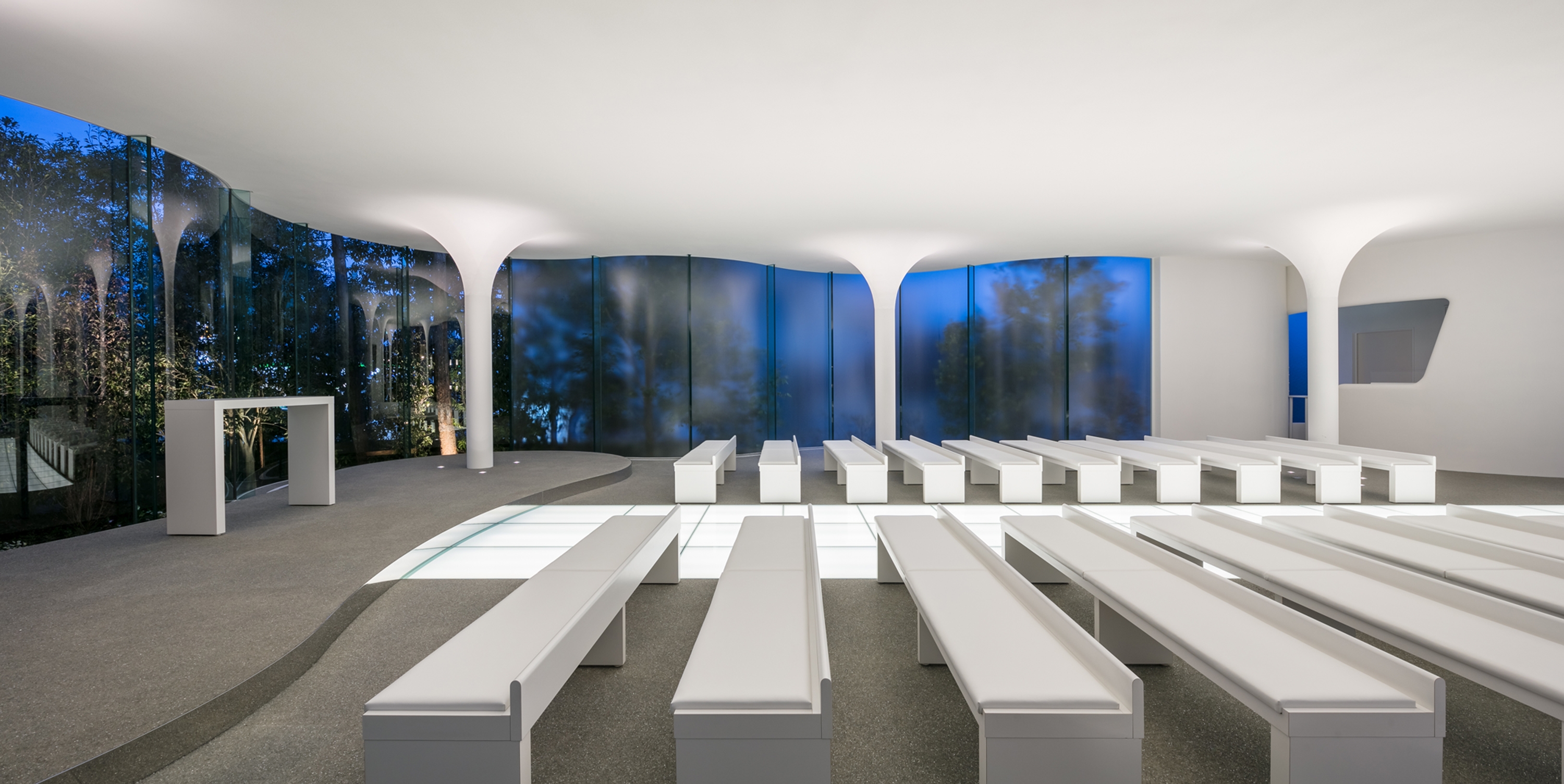 Dreams and light were depicted as curves and glass, a cloud-shaped space for the chapel was enveloped in transparent curved glass bringing daylight from all directions. Only the organ space and the technical room are enveloped in a circular white wall at the back of the chapel.