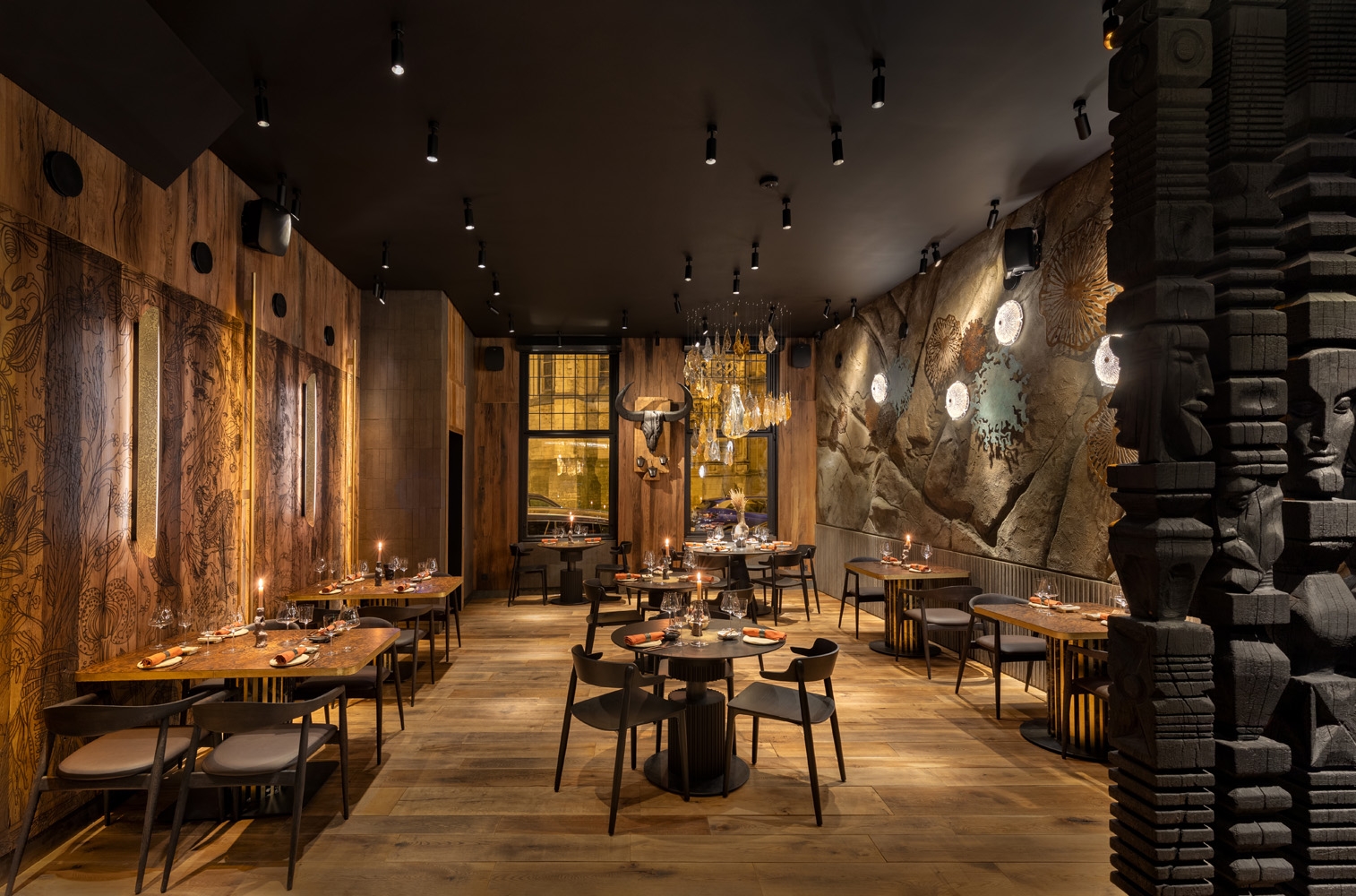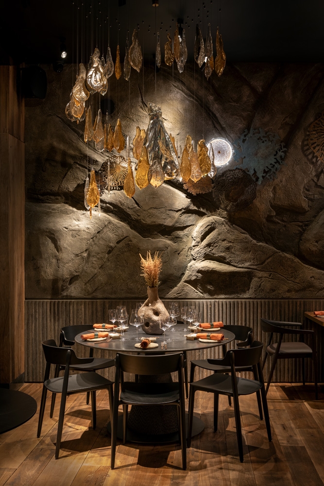 The most striking element is the bespoke light-glass chandelier, born from the symbolism of the molfar — a fusion of mirrors, “fire,” and botanical motifs. Mirror fragments at different angles produce multiple reflections of fiery elements, while amber tints emphasize textures of herbs, smoke, and flame.