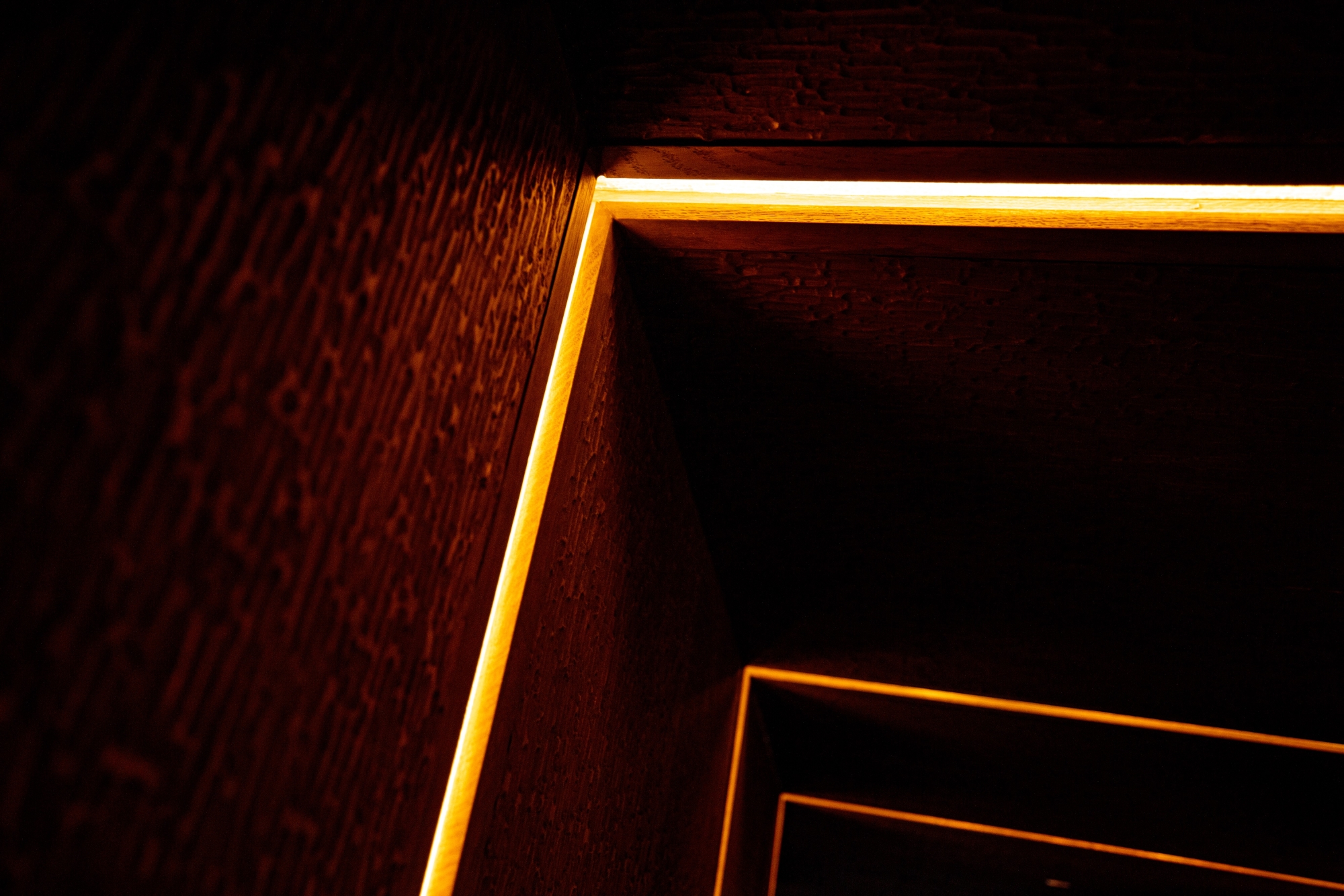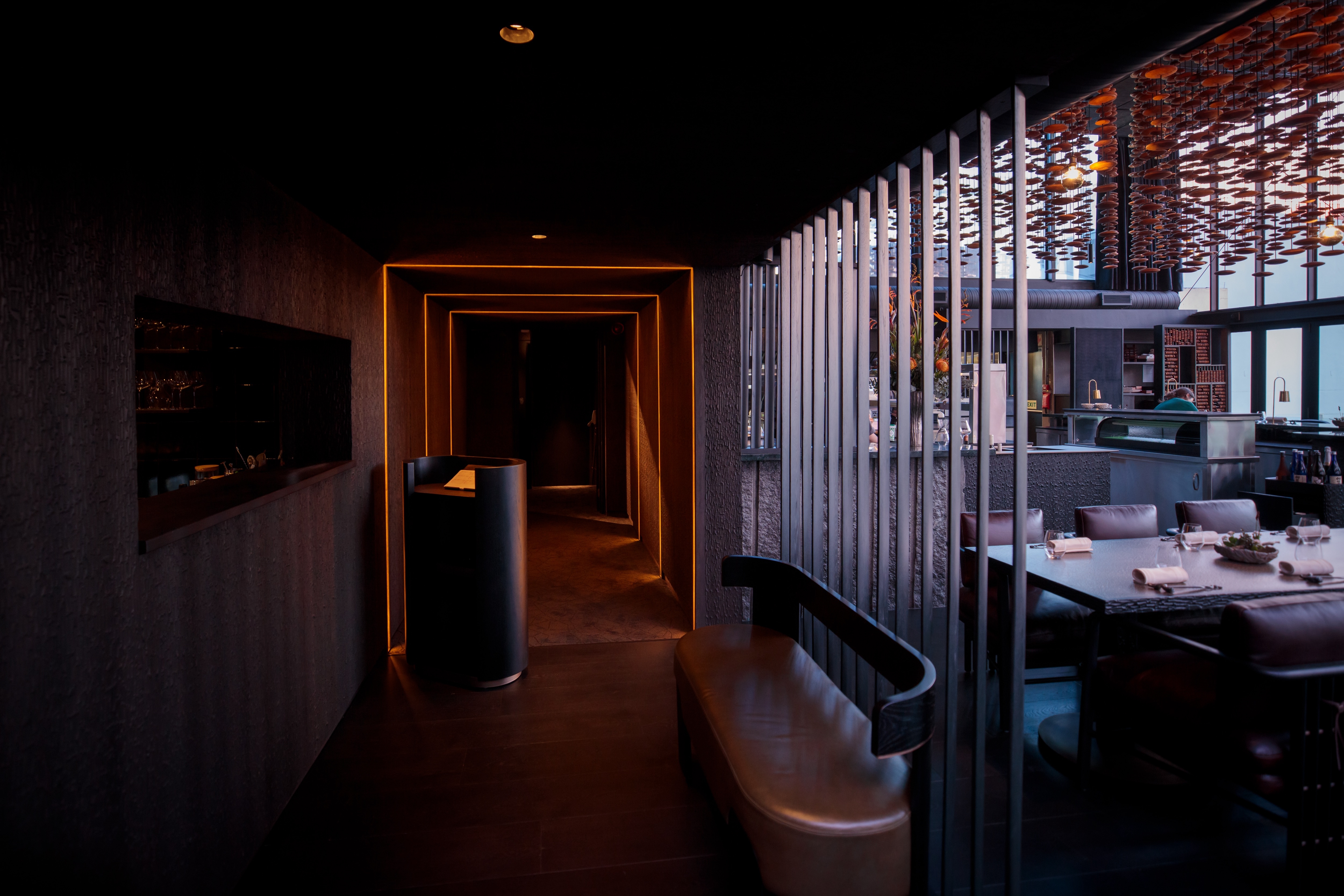 Entry DescriptionThis award-winning restaurant's lighting design exemplifies our signature experiential approach, banishing conventional glary downlight’s to create an intimate culinary theatre. The design features a sophisticated layering technique combining warm ambient illumination with dramatic architectural lighting elements. Golden linear LED installations create rhythmic patterns across the timber-clad ceiling, while concealed uplighting transforms the space into a dramatic backdrop for fine dining.