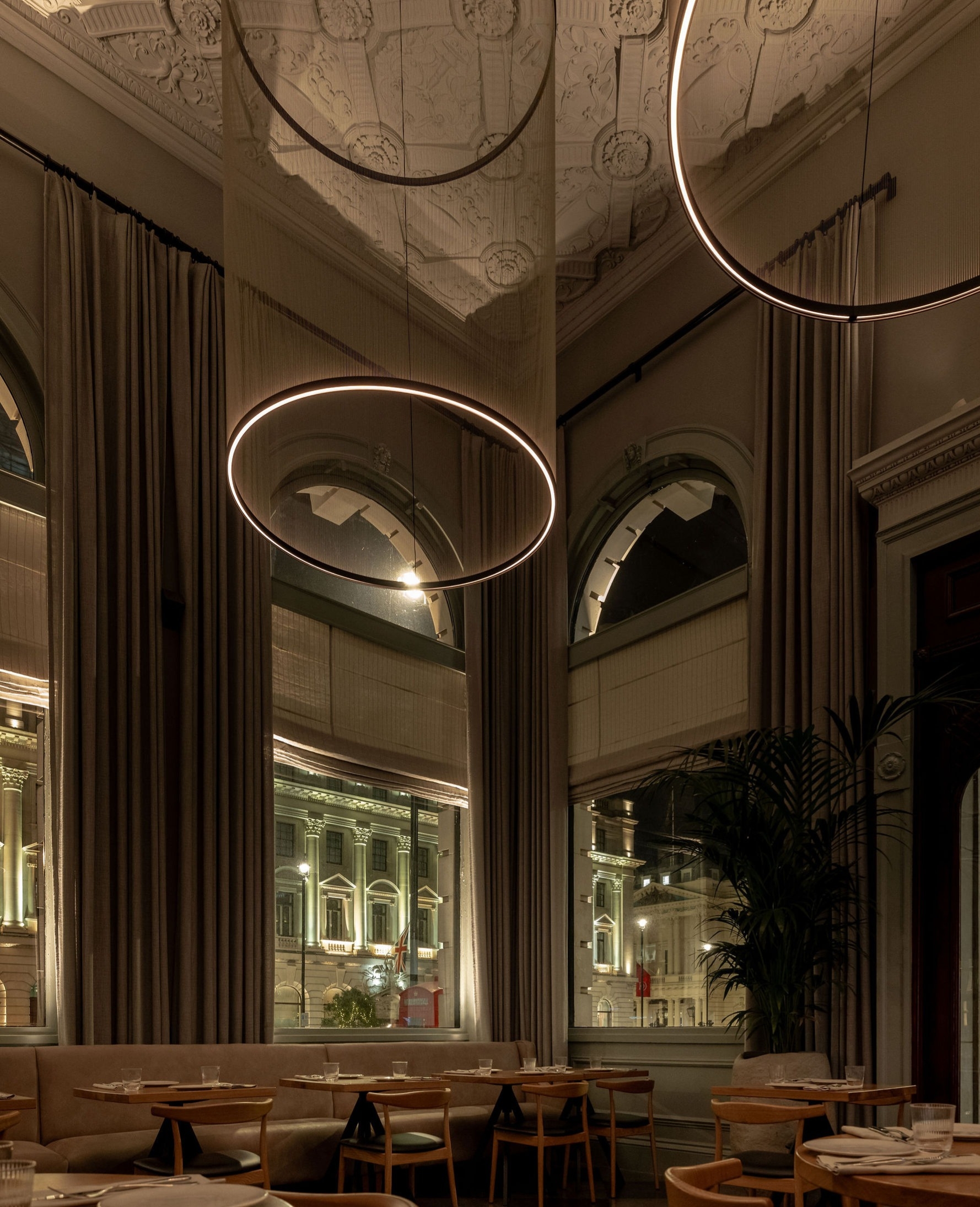 We focused on accentuating the internal volumes by showcasing the Edwardian plaster moulded ceiling through carefully positioned spotlighting on top of the existing cornice details, suspended pendants in the central ceiling zone to provide visual interest and key focal point for the main dining area. We chose to avoid ceiling clutter and avoid pin spotting of tables, but instead sought to highlight the existing exposed architectural features, such as cast iron columns, window reveals with surface mounted or recessed uplights fitted with anti-glare guards ensuring visual comfort.