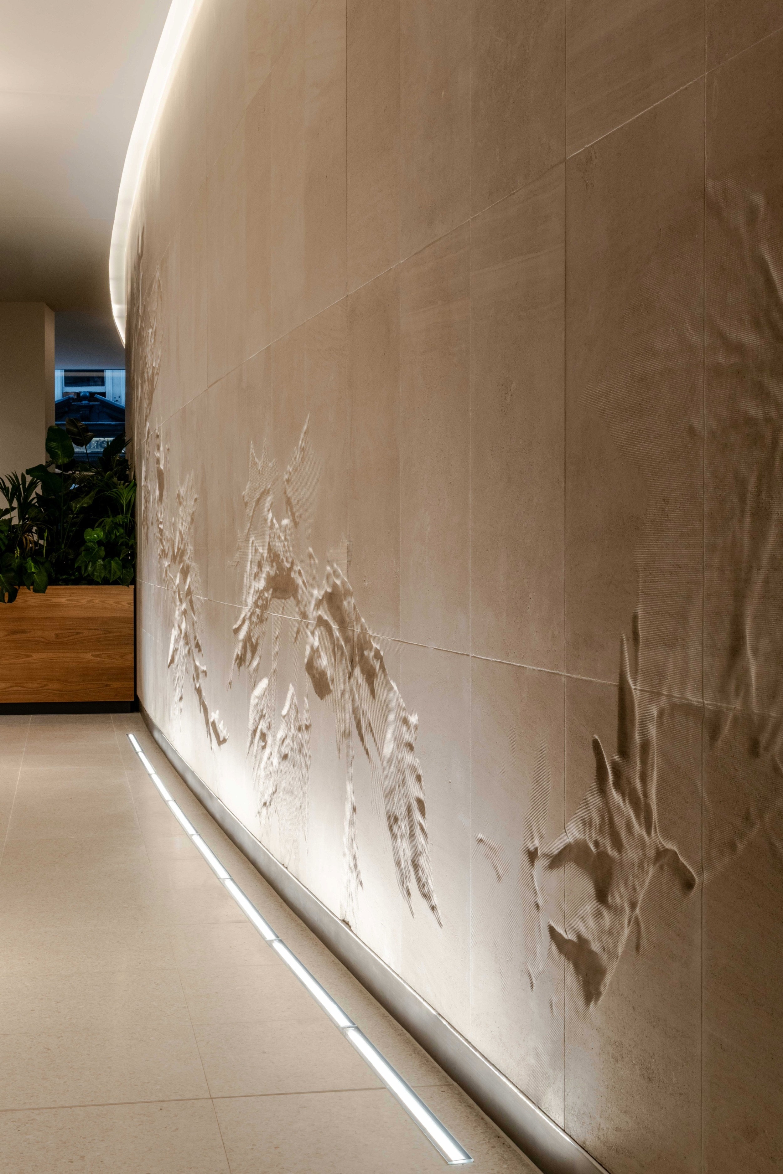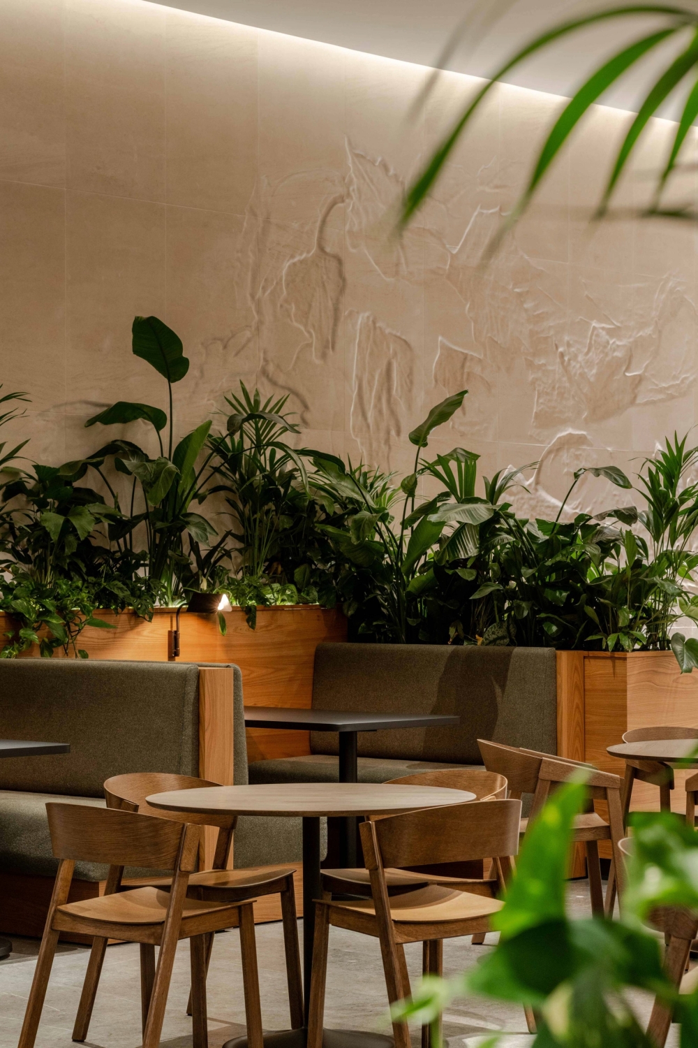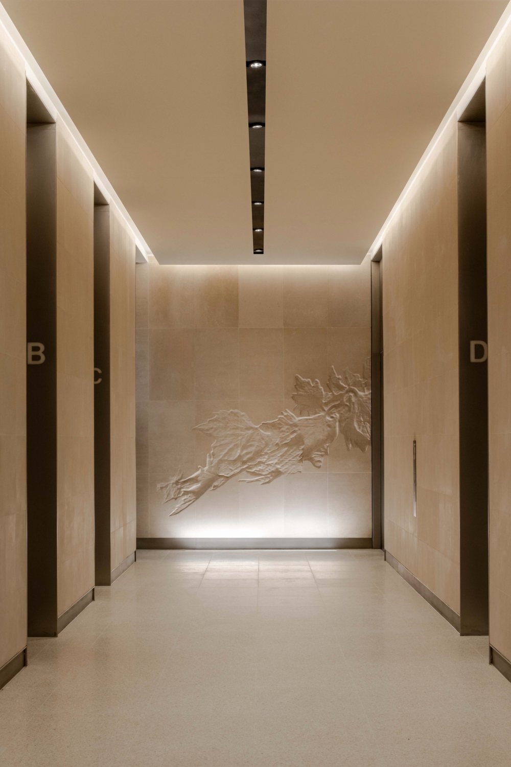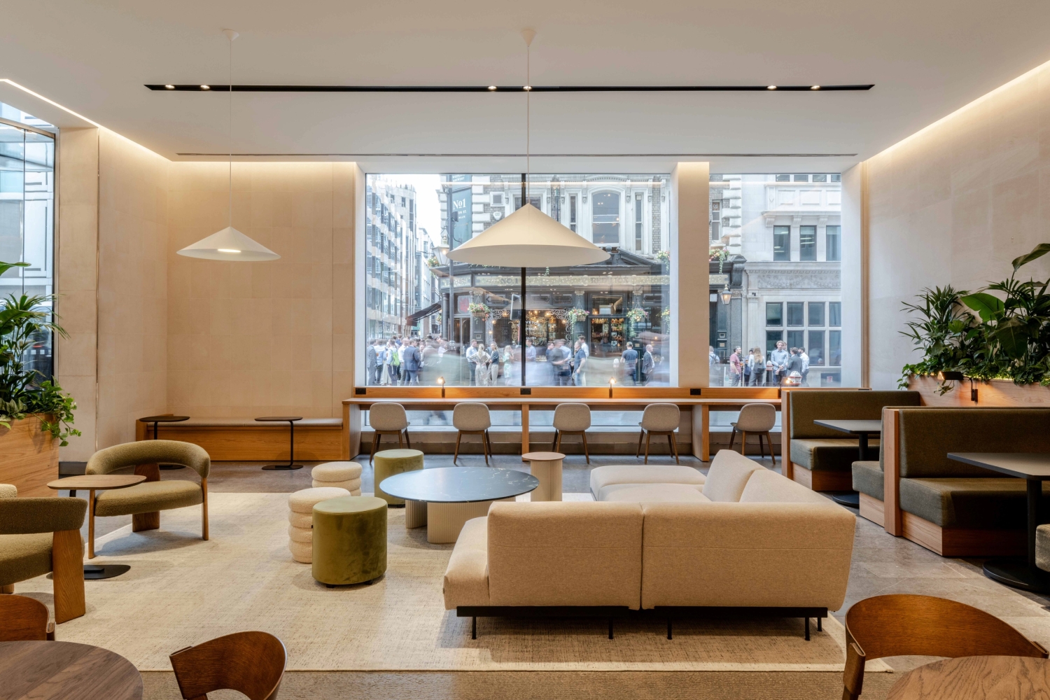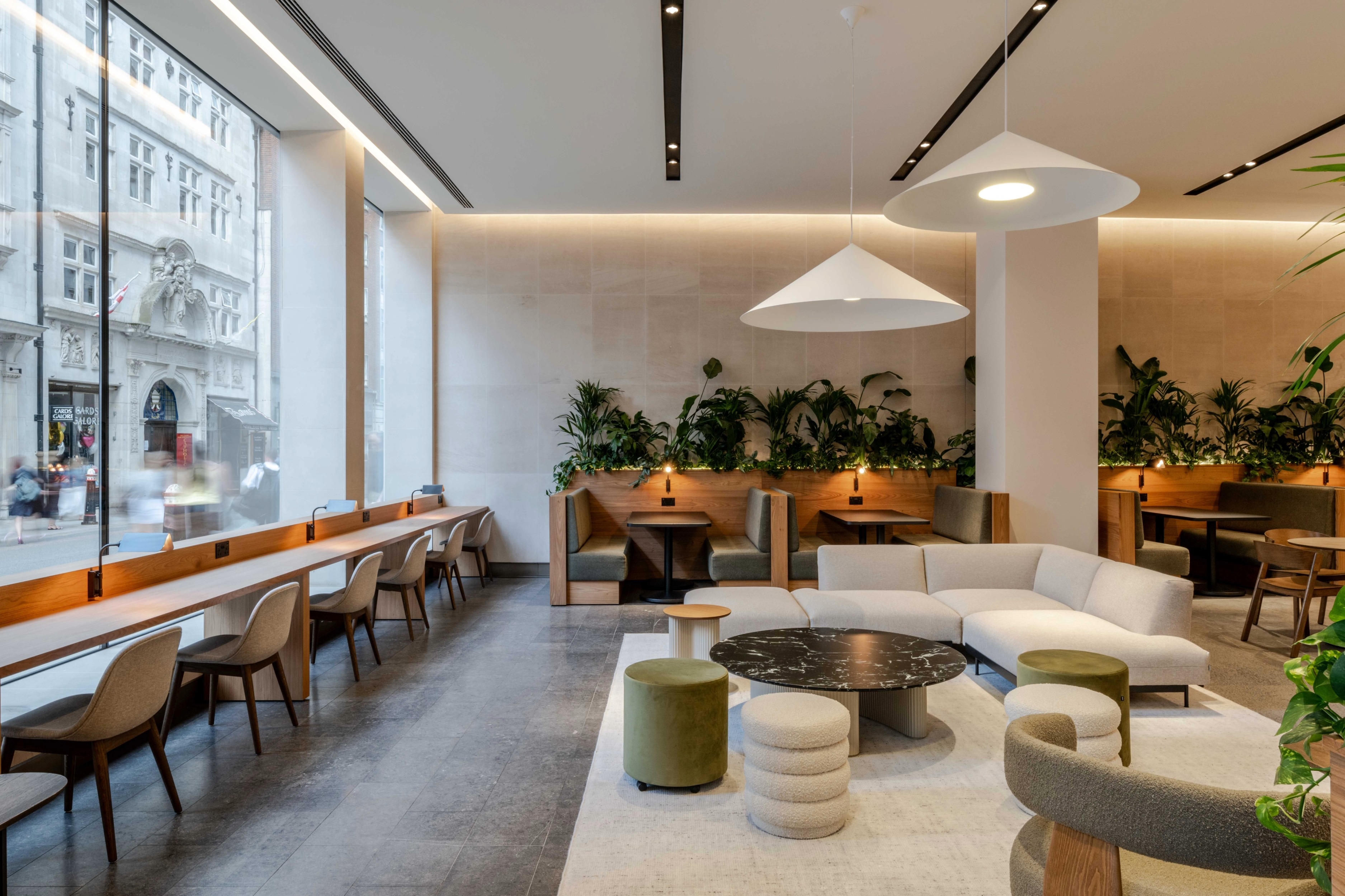 While the North and South entrances benefit from natural light through their large glazed facades, the building's deep-plan nature created a tunnel-like effect before the refurbishment that resulted in poor perception of the centrally placed reception desk and security gates. The newly designed lighting scheme establishes a clearer visual hierarchy, making navigation more intuitive, while also creating a softer and more welcoming space, introducing pockets of interest, and accentuating rich textures and materials.