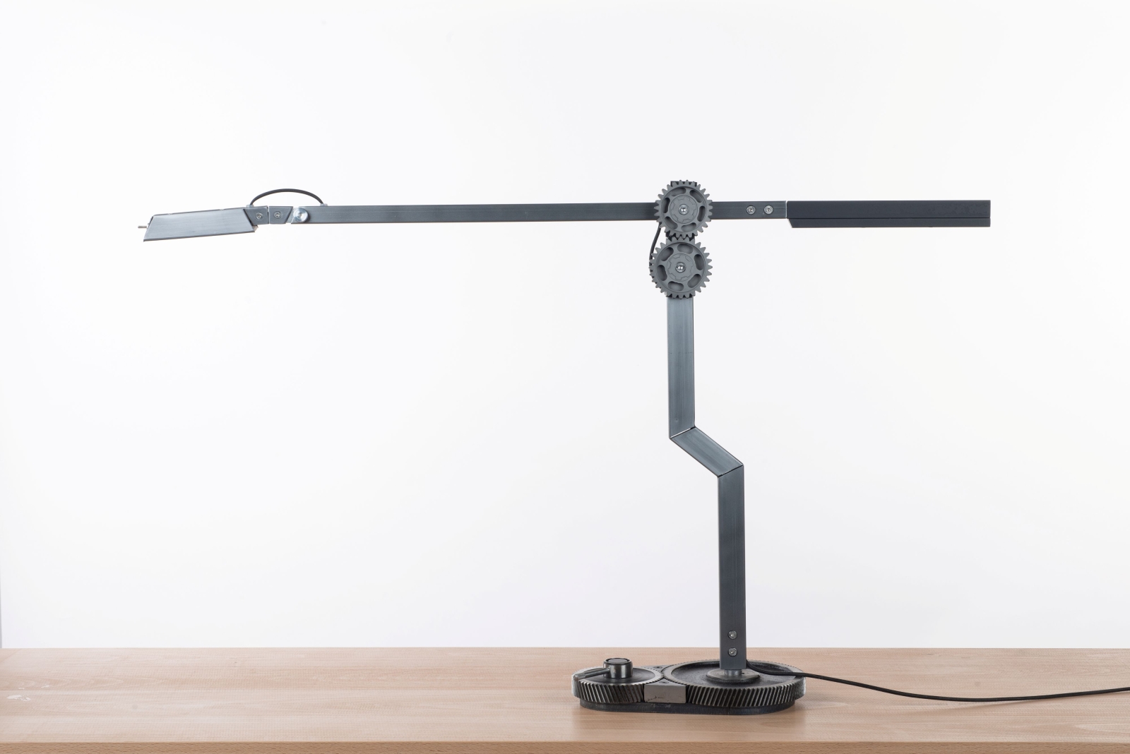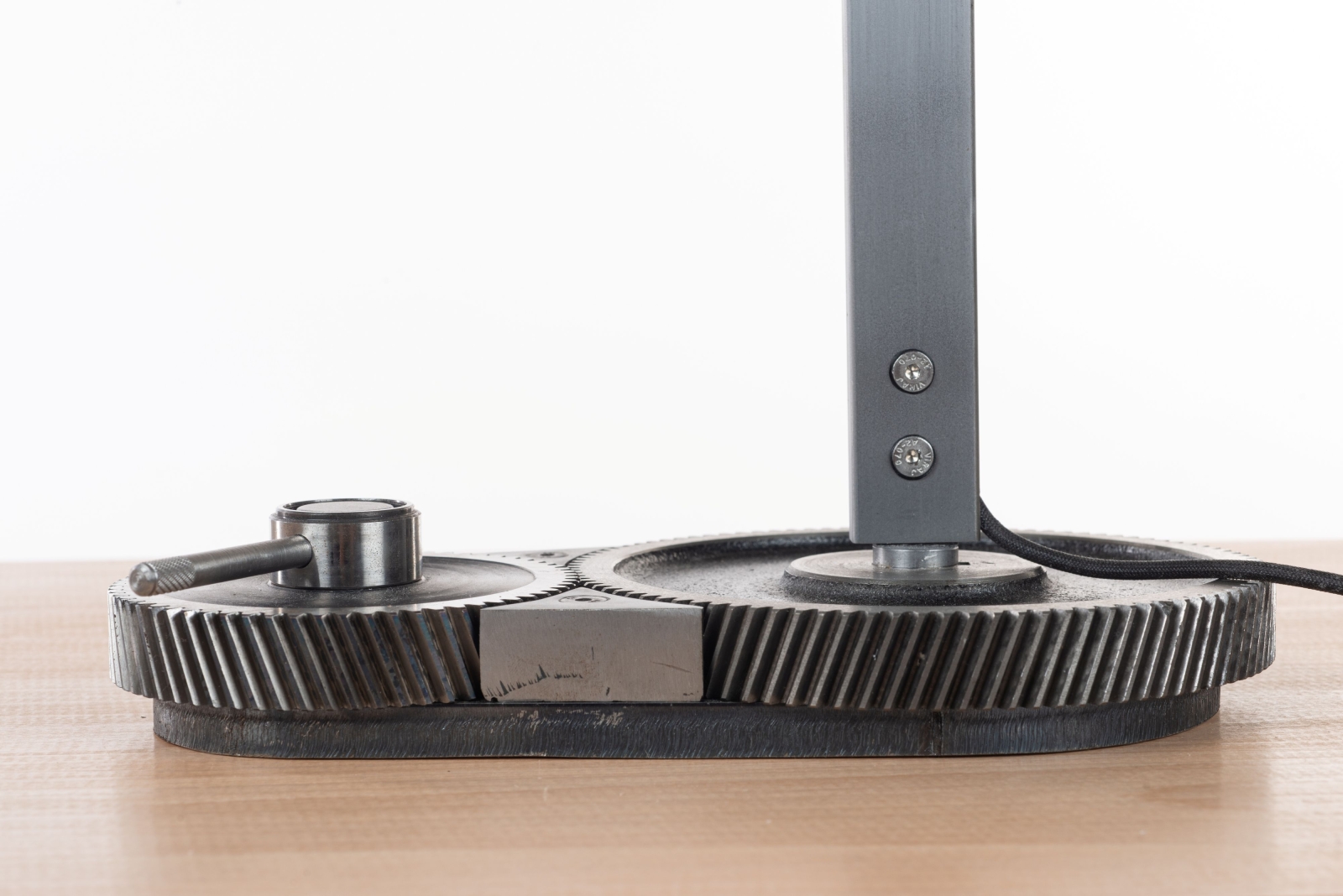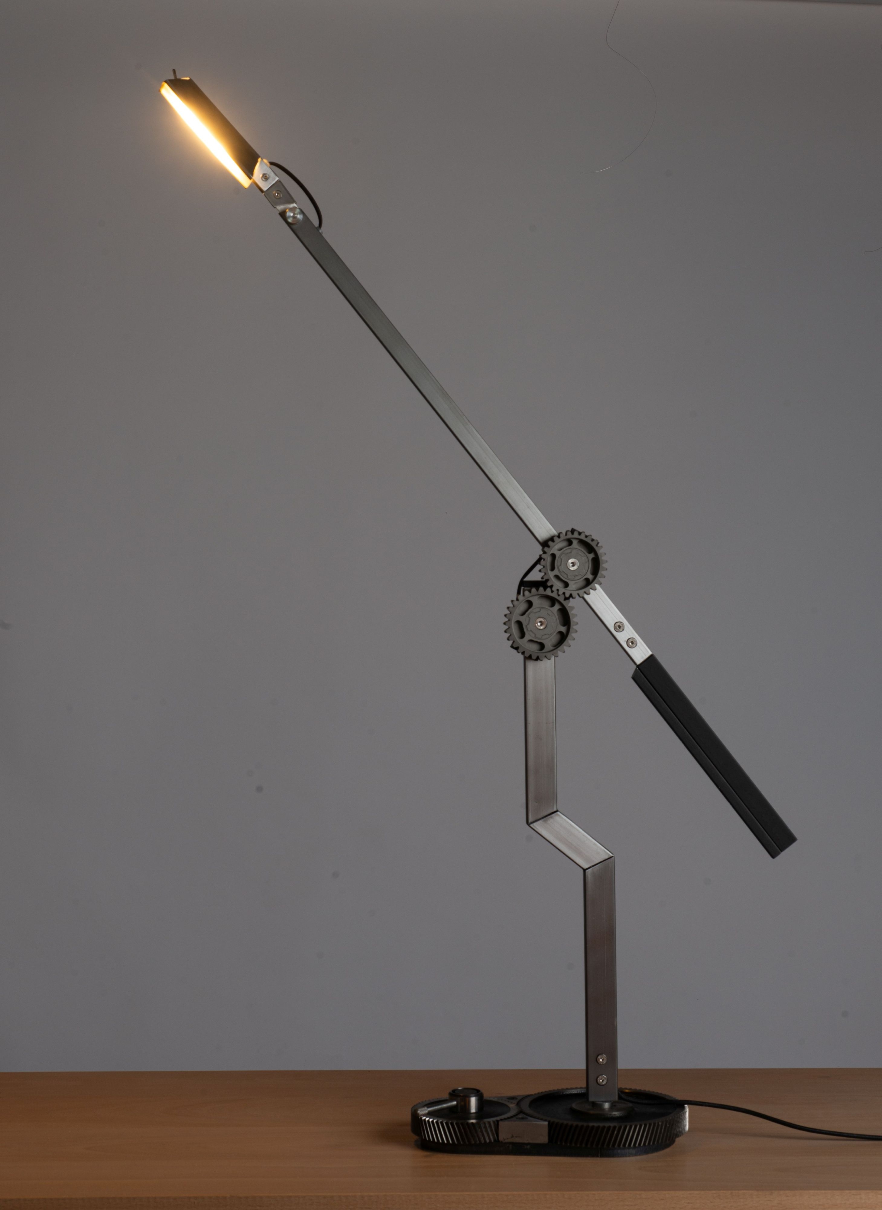 Entry DescriptionThe Cogwheel Desk Lamp explores the complex between mechanical solidity and light mobility. The cogwheel, as a prominent industrial element with a powerful and heavy appearance, enable smooth and continuous movement of the arms - surprisingly light compared to the strong appearance - and emphasize the balance between stability and operational simplicity.