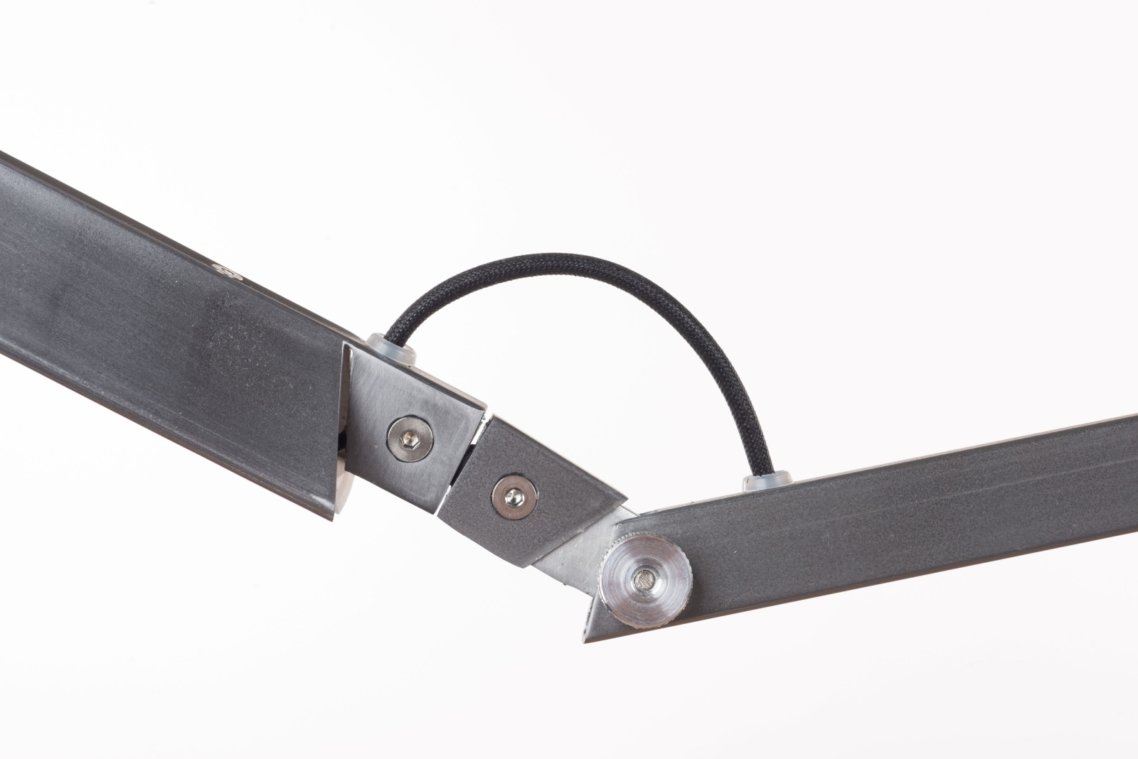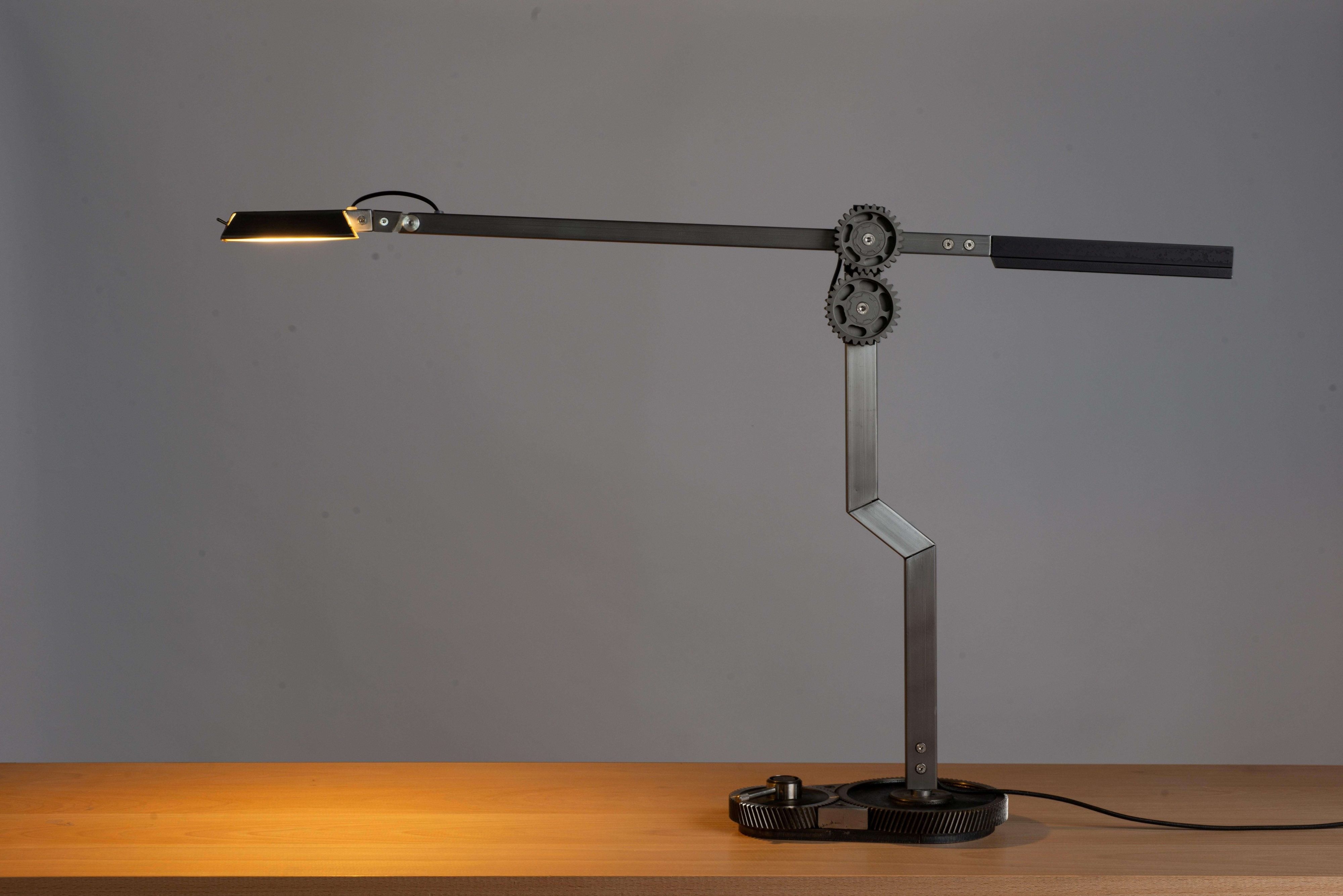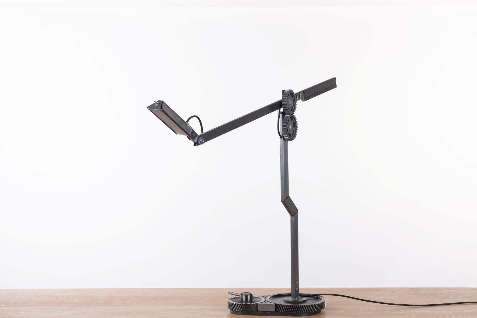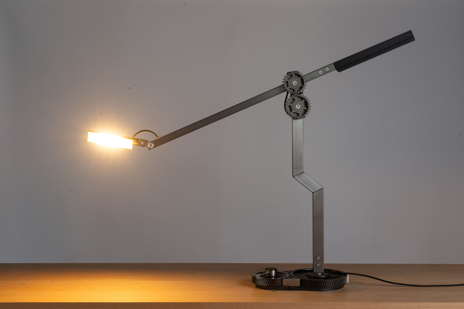 Entry DescriptionThe Cogwheel Desk Lamp explores the complex between mechanical solidity and light mobility. The cogwheel, as a prominent industrial element with a powerful and heavy appearance, enable smooth and continuous movement of the arms - surprisingly light compared to the strong appearance - and emphasize the balance between stability and operational simplicity.