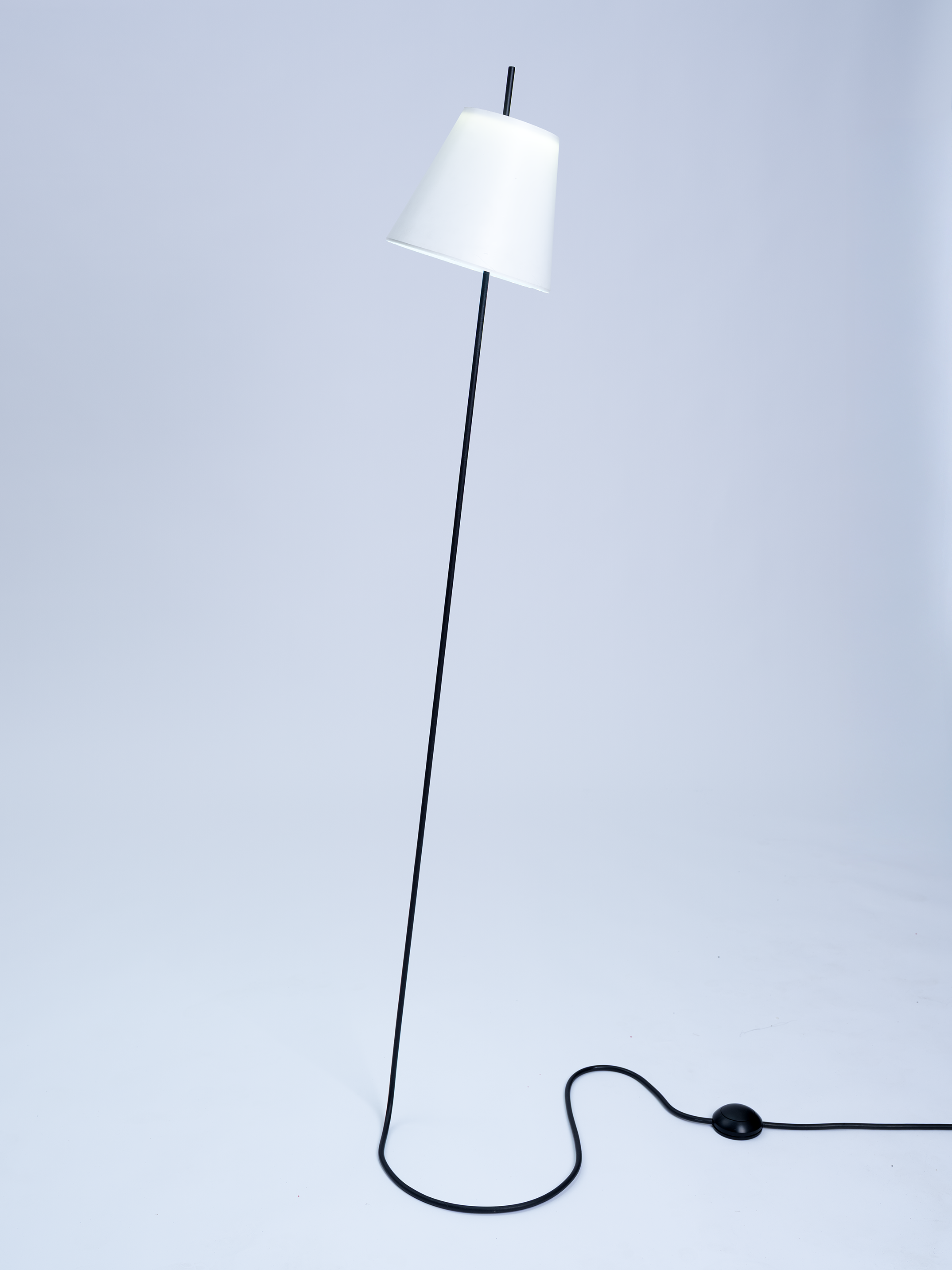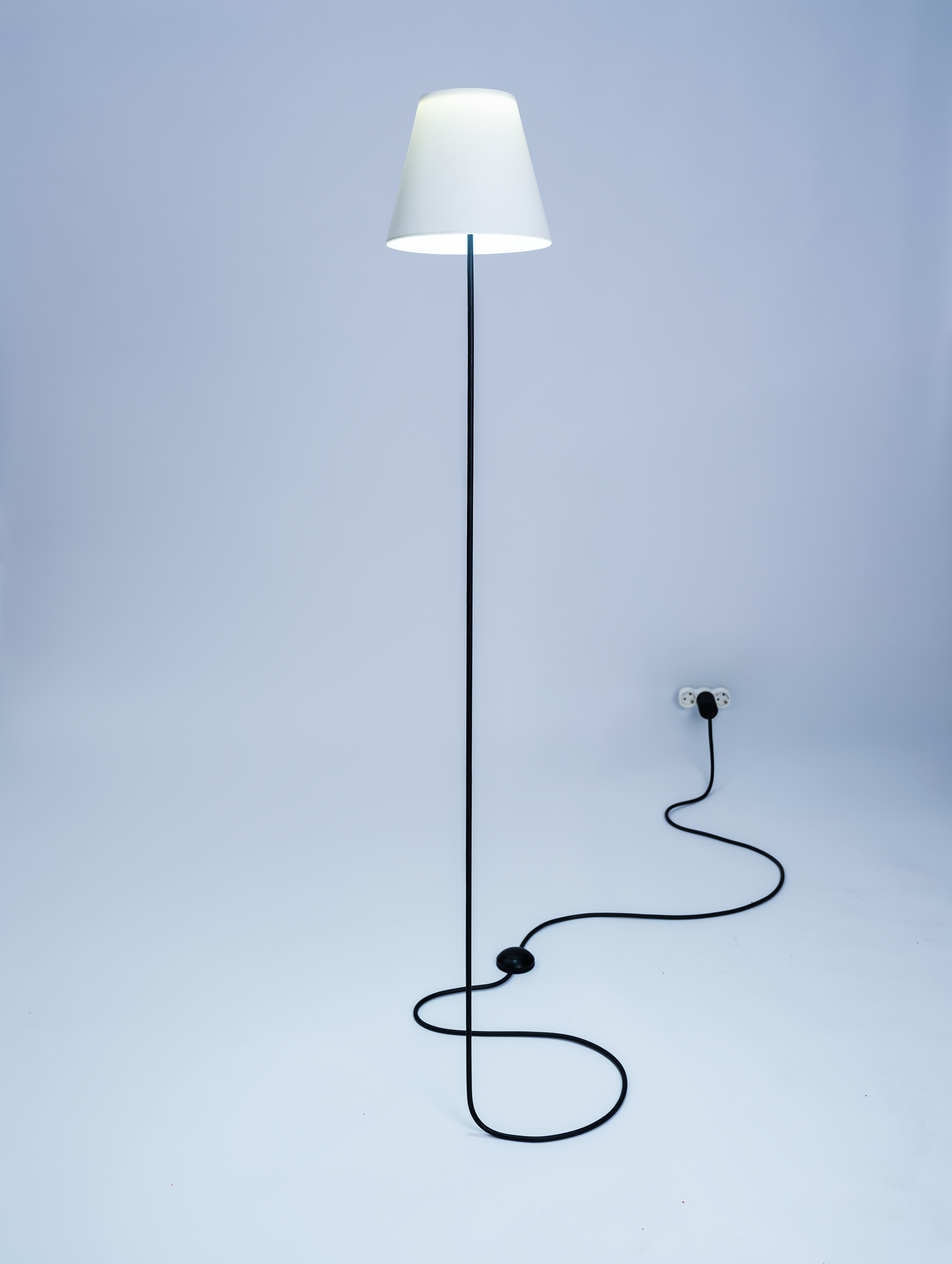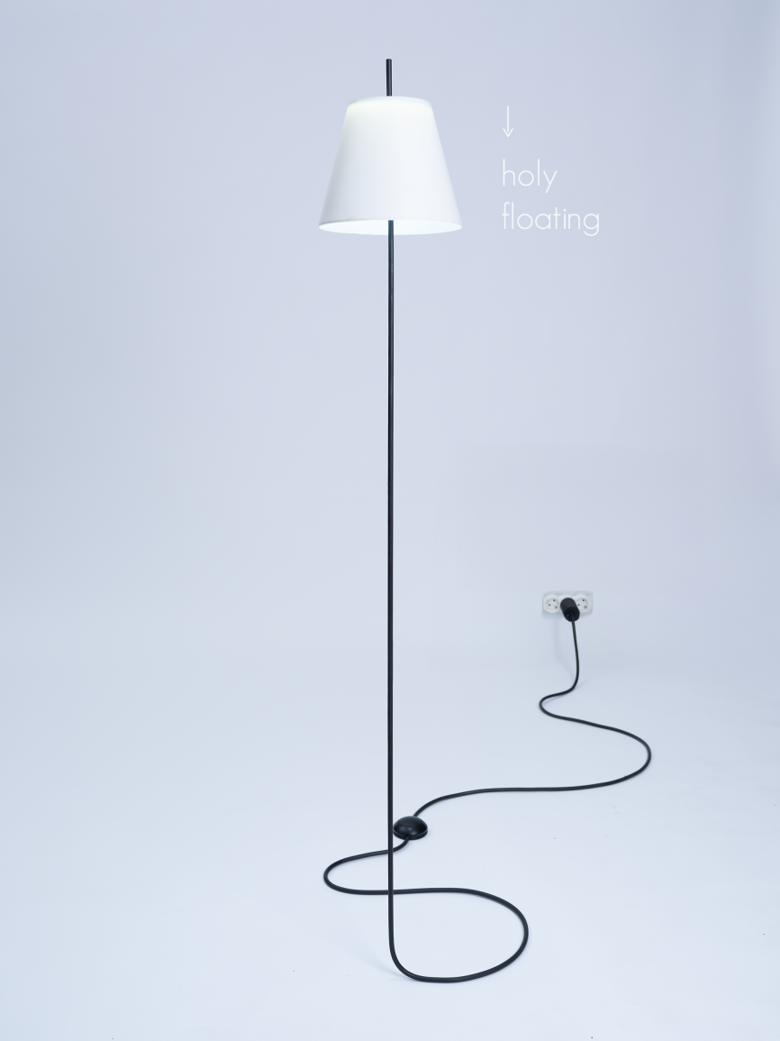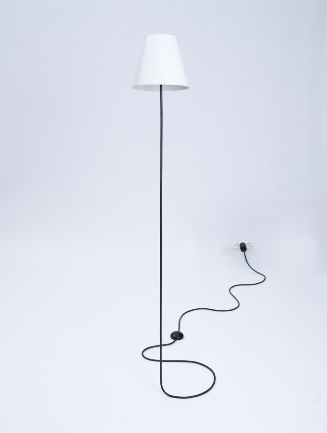 Entry DescriptionThis lamp plays cleverly with perception and is formally reduced to the essentials: just a simple cable leads in to the light. The trick lies in the illusion. What appears to be a continuous power cable running horizontally out of the socket is actually a precisely bent stainless steel tube with an 8 mm diameter. It seemingly floats effortlessly above the floor, rises vertically, and supports the lampshade—as if it were one continuous cable. The tube is completely covered with a black rubber hose, perfecting the illusion of a flexible cable.