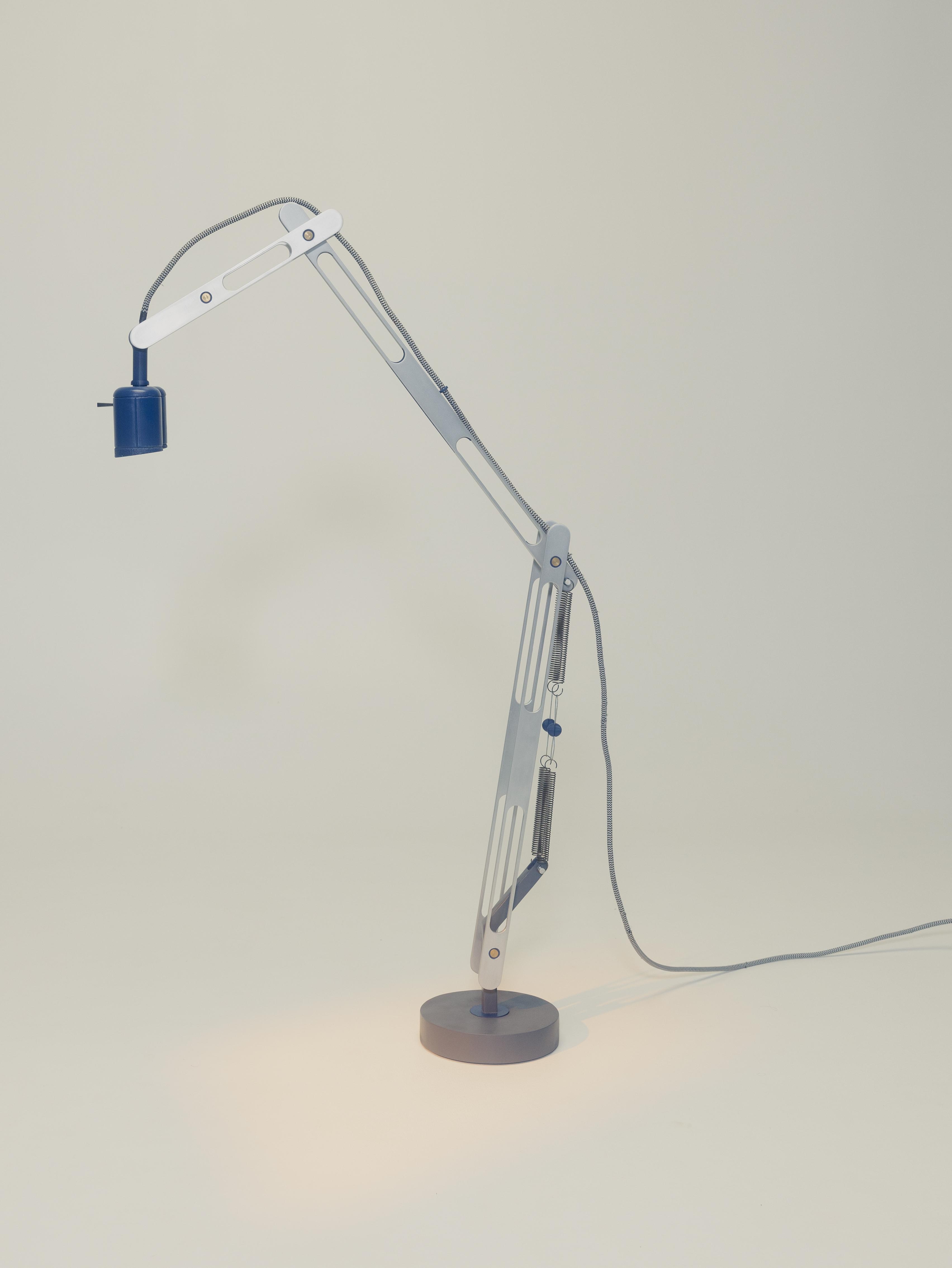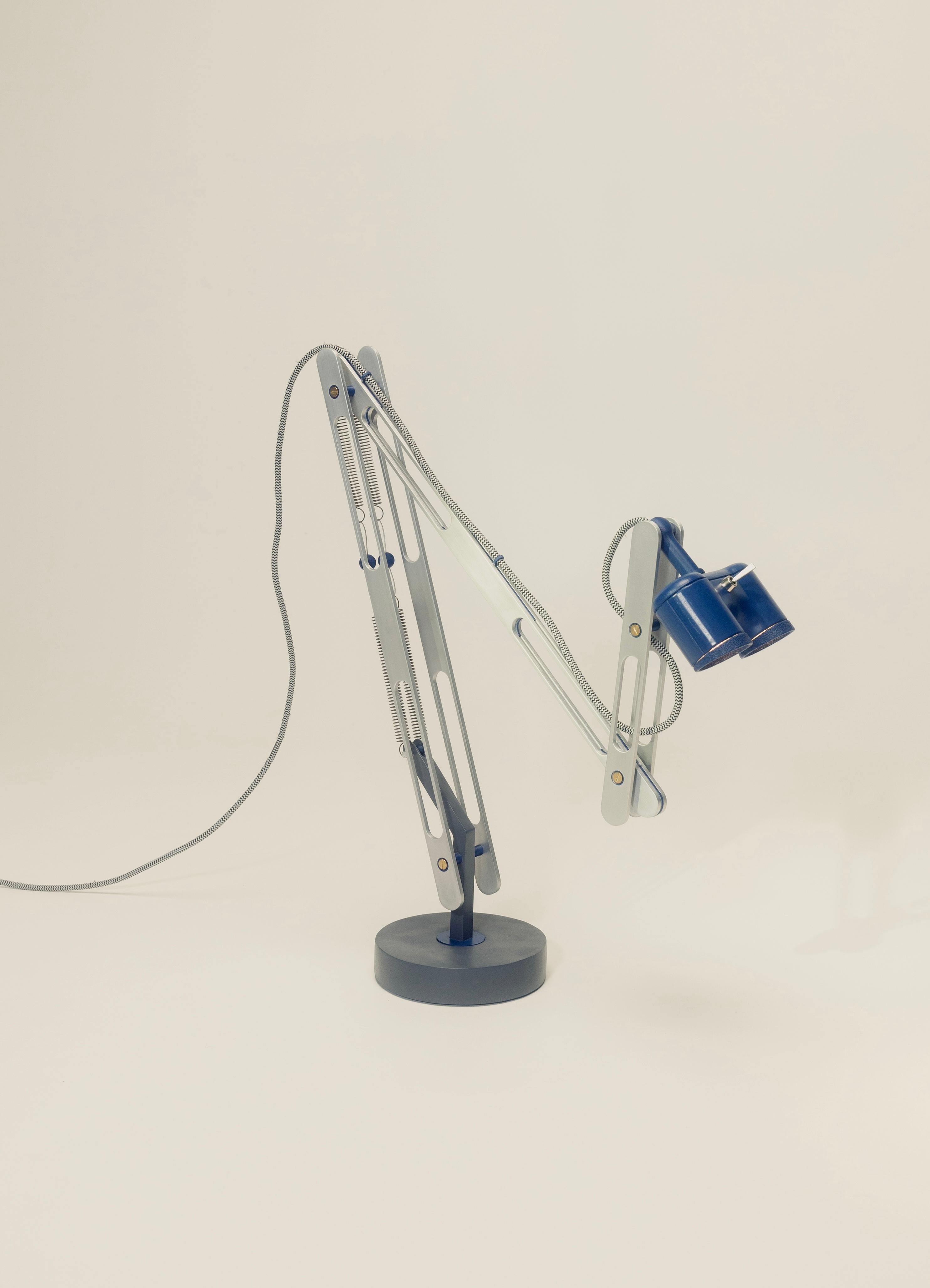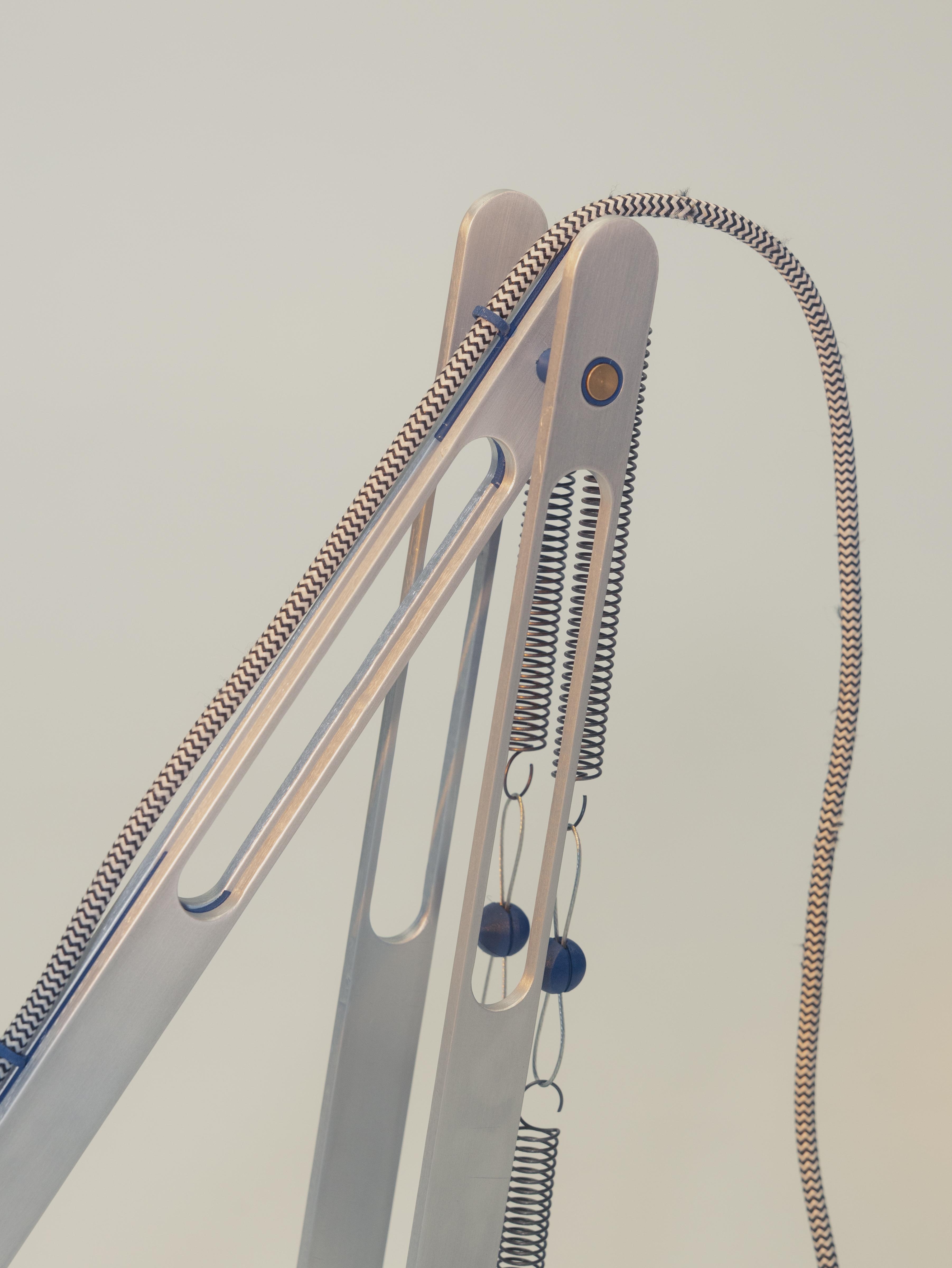 Crafted from 25 mm by 4 mm aluminum profiles, each piece was cut and hand-finished with care. 3D-printed components bring intricate details to life, while a solid iron weight in the base provides stability, grounding the lamp’s unique form in both function and presence.