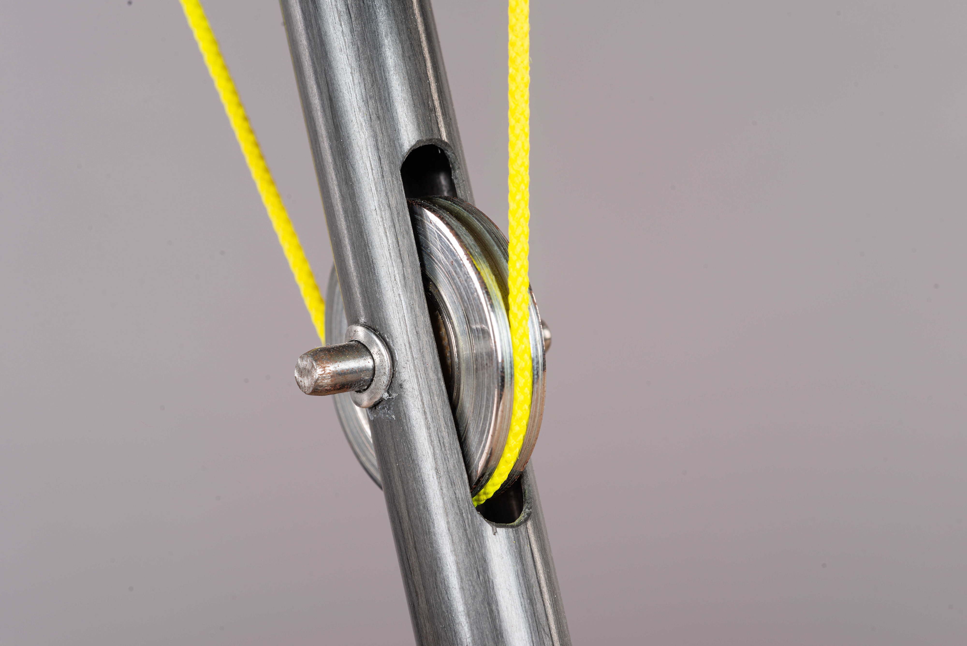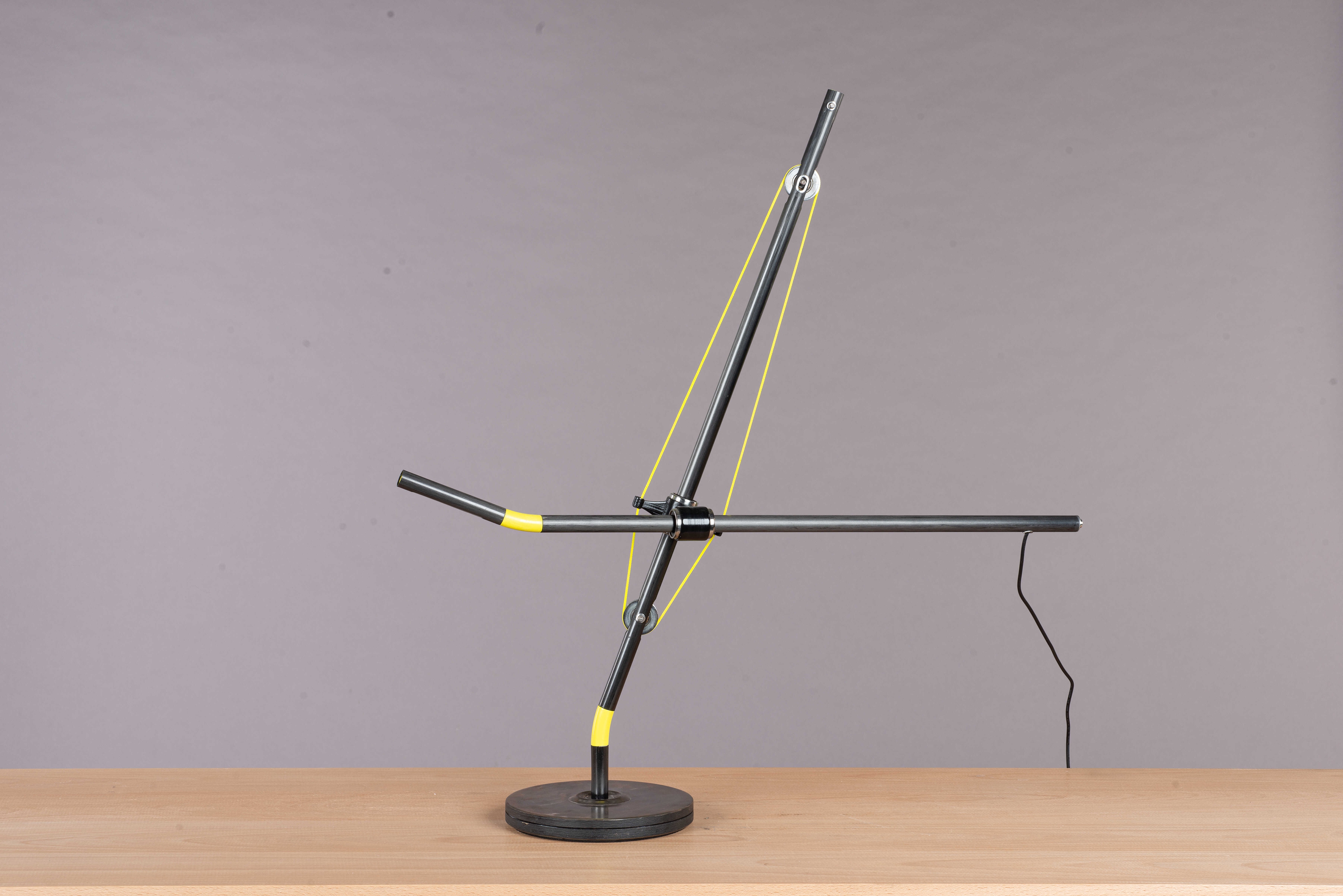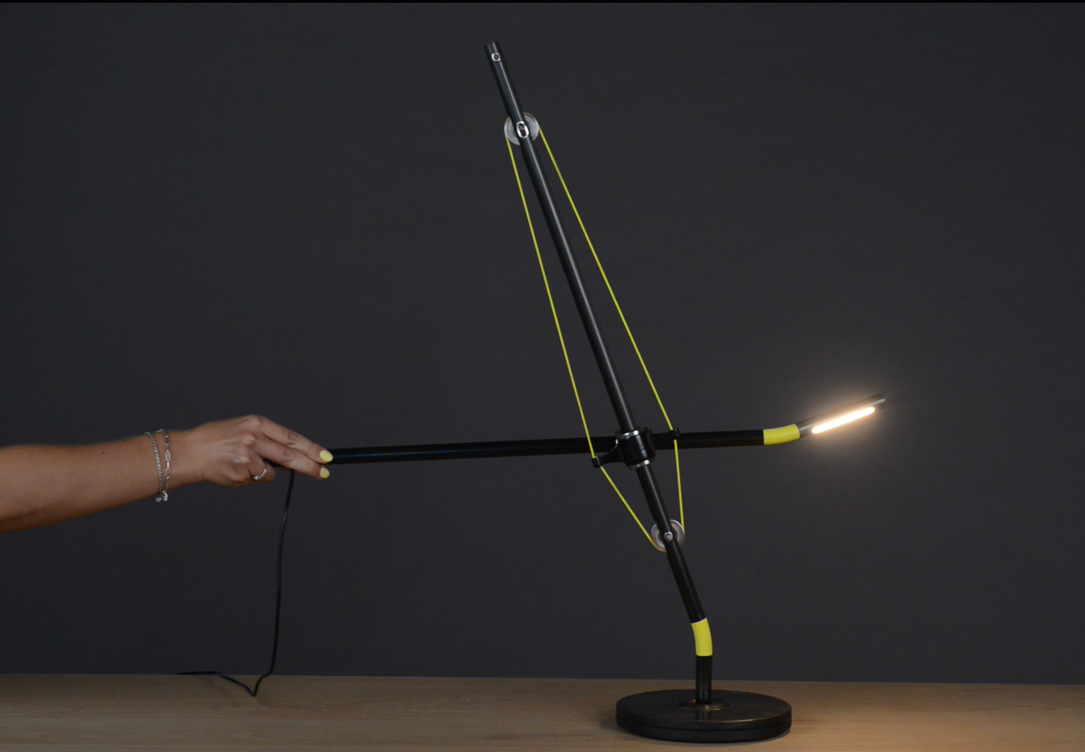 The lamp operates through a unique mechanism I developed, consisting of two pulleys—one fixed and one sliding along an axis, tensioned by a spring. A continuous closed-loop cord surrounds both pulleys and connects to a horizontal arm that carries the light source. This mechanism enables smooth movement across multiple axes, allowing the lamp to be positioned effortlessly and to hold firmly in place at any chosen angle.