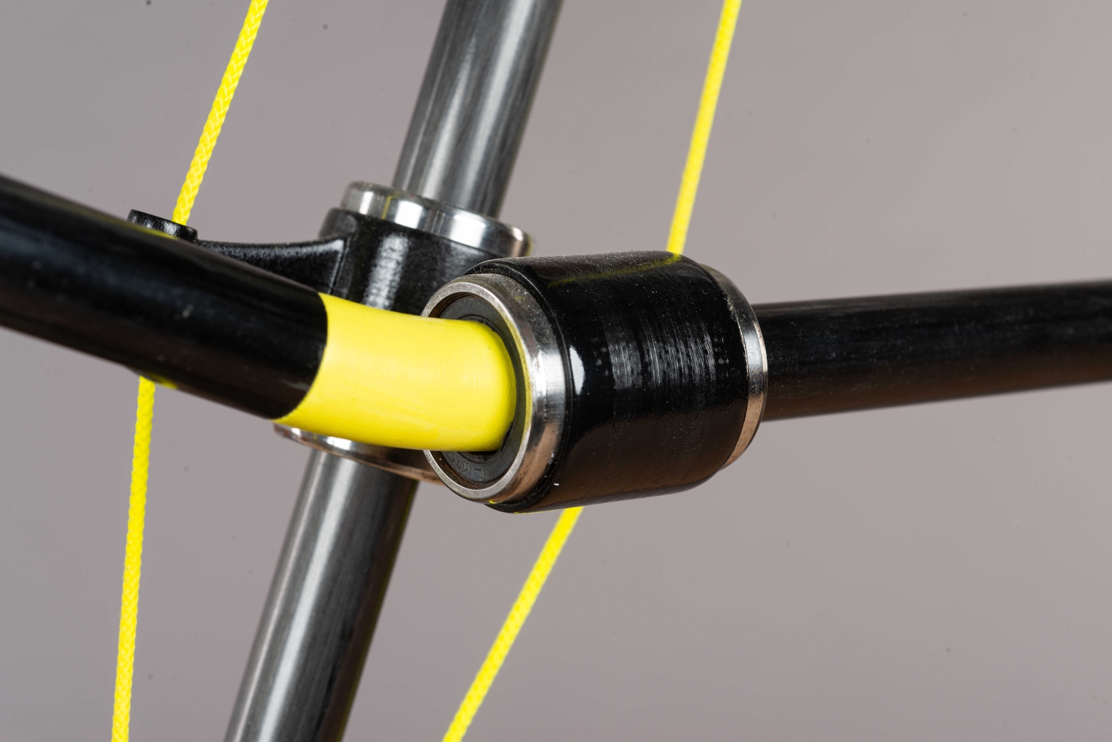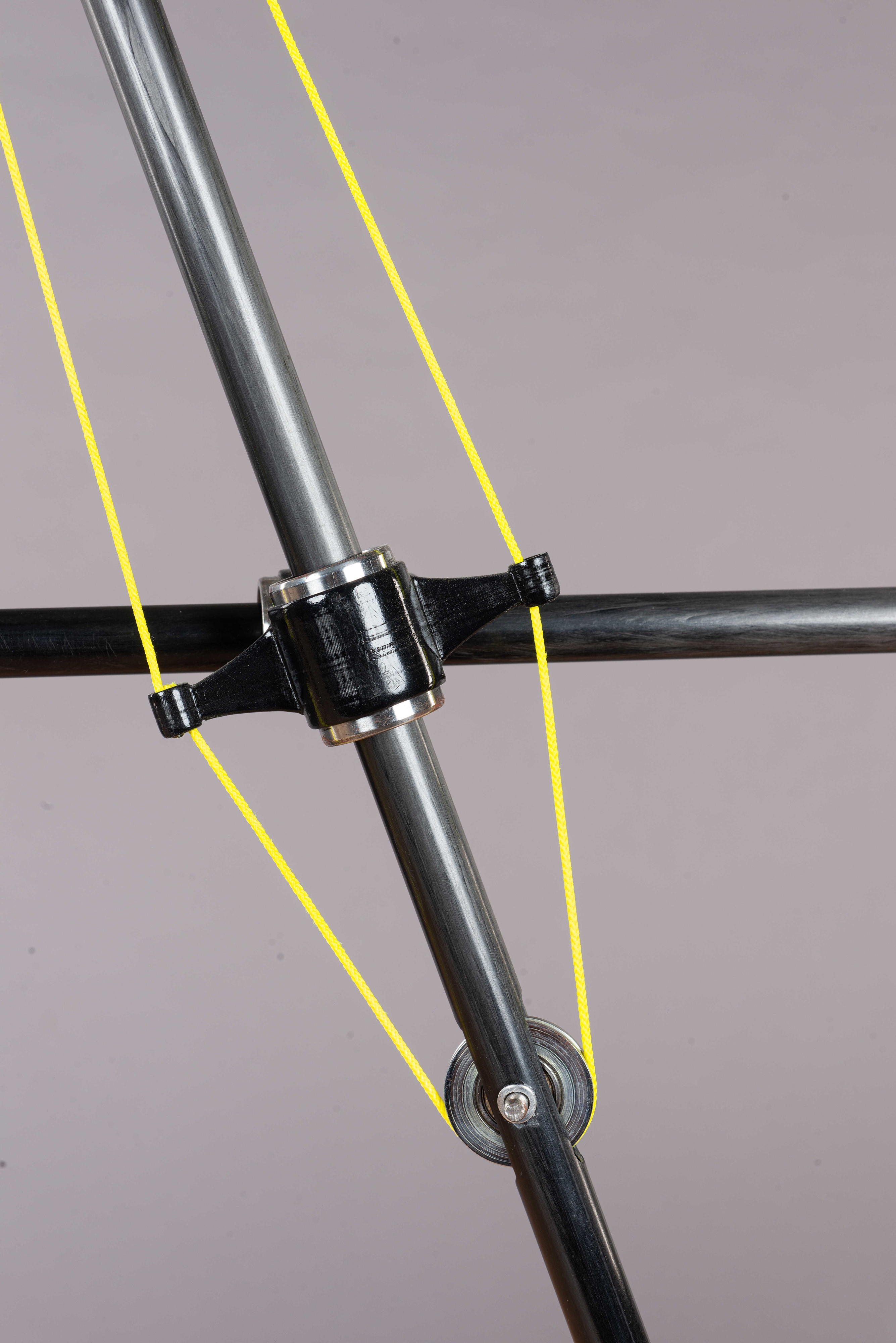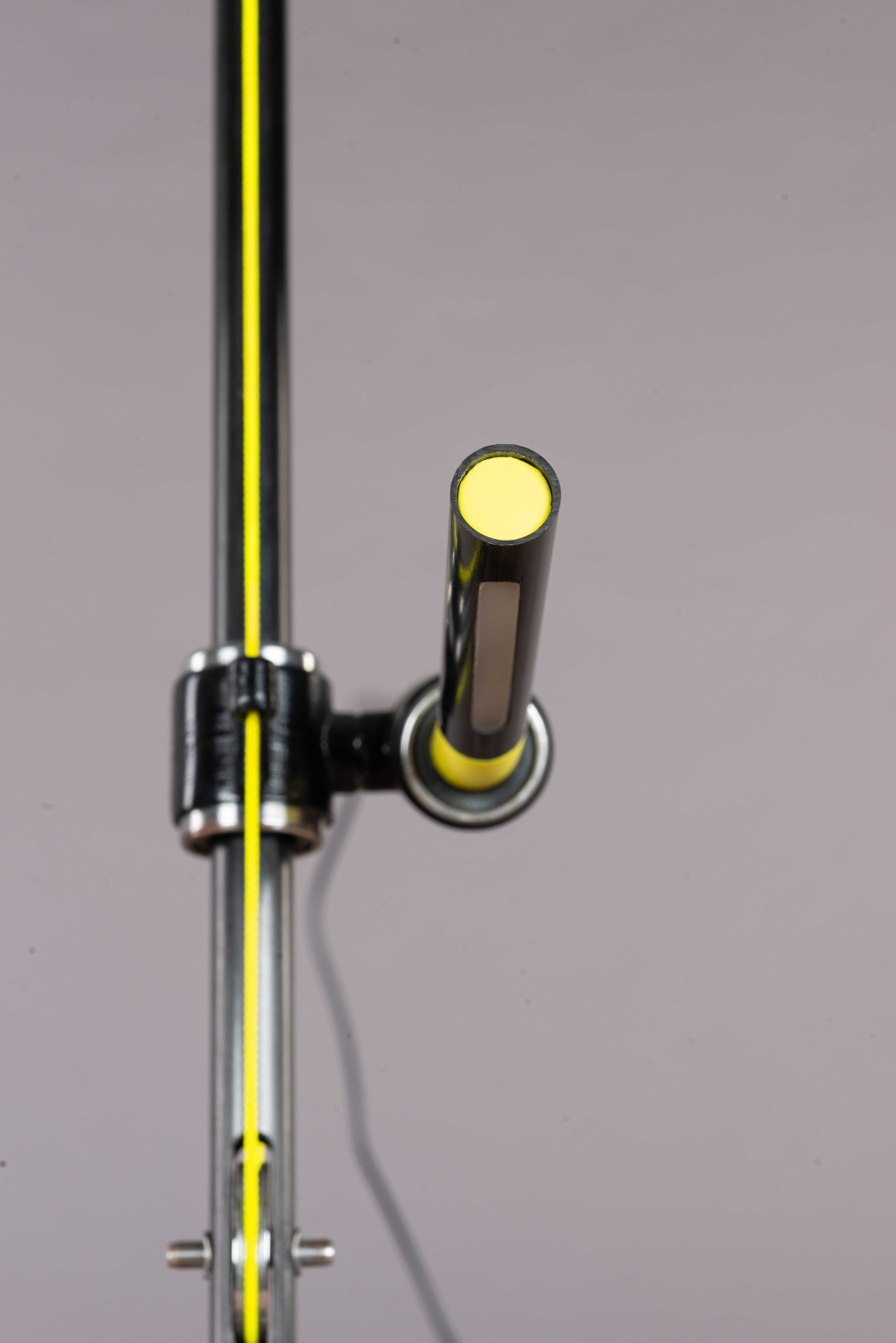 The lamp is constructed from a combination of materials, with carbon fiber as the primary one. This choice ensures lightweight components, which are essential for the fluidity of the movement system. Complementary elements include 3D-printed parts, aluminum, cast steel, and stainless steel, each selected for its specific functional and aesthetic contribution to the overall design.