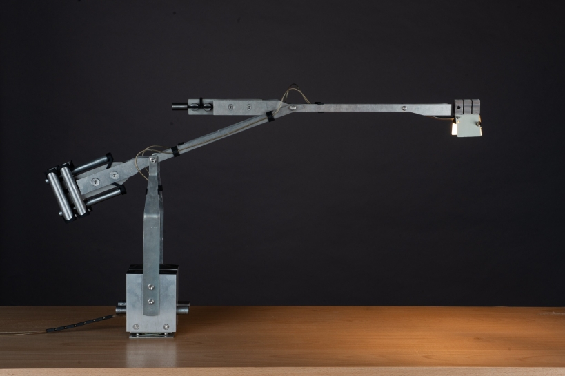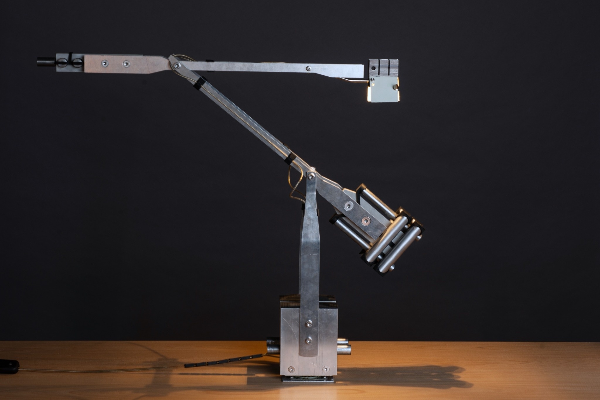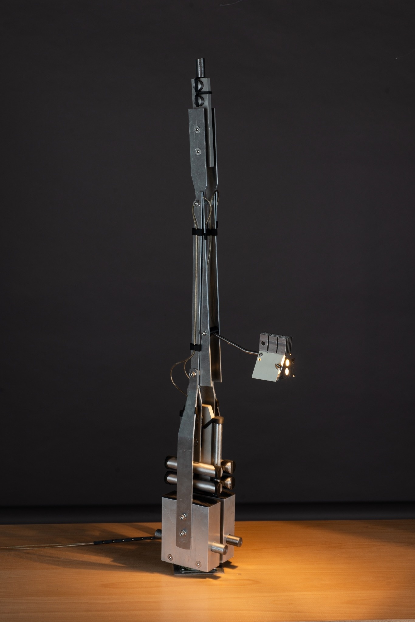 Entry DescriptionThis lamp is based on the principle of balance- it stabilizes itself through counterweights at the ends of its arms. Built from aluminum, steel, and PLA, it exposes every screw, wire, and joint openly.