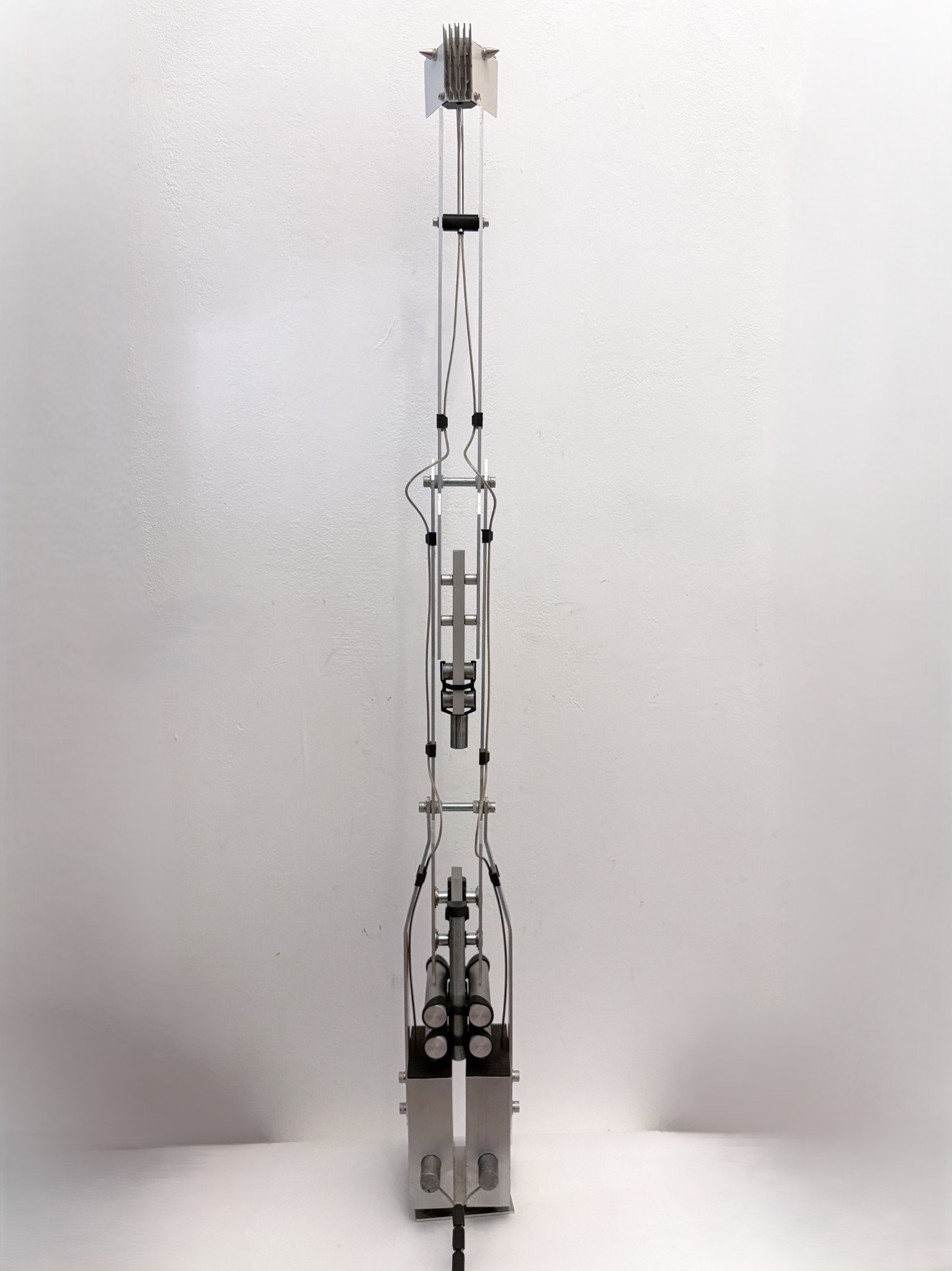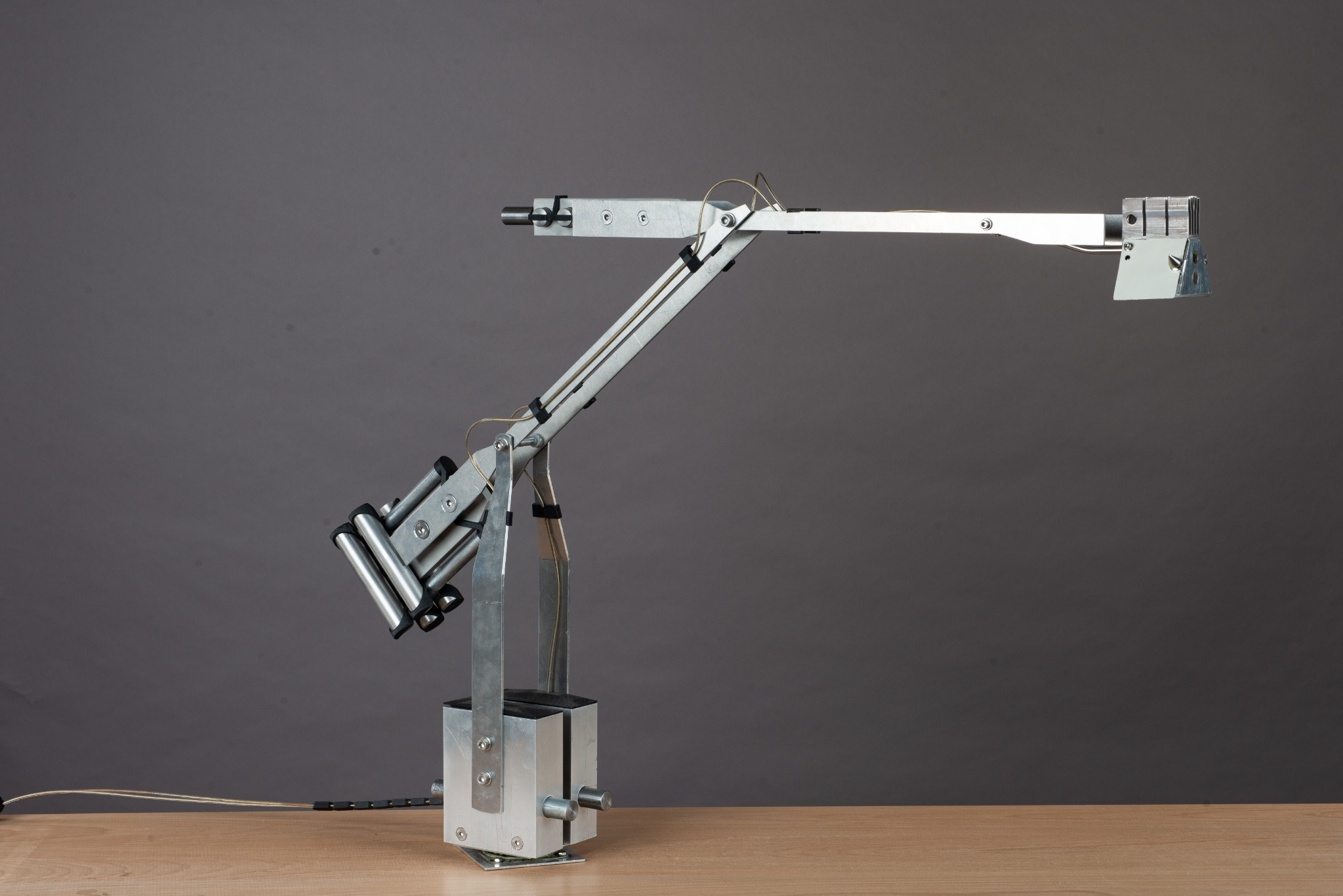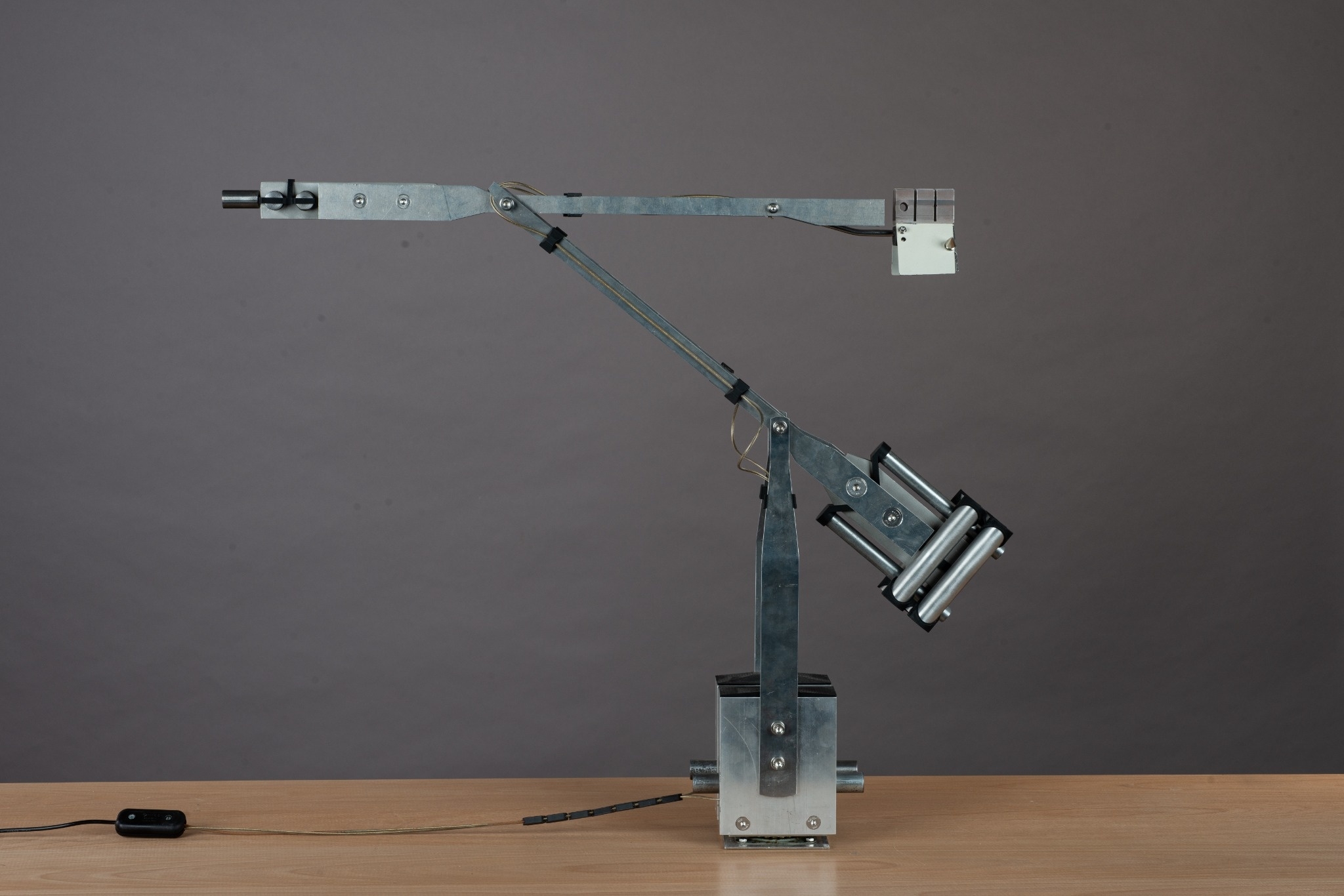 Entry DescriptionThis lamp is based on the principle of balance- it stabilizes itself through counterweights at the ends of its arms. Built from aluminum, steel, and PLA, it exposes every screw, wire, and joint openly.