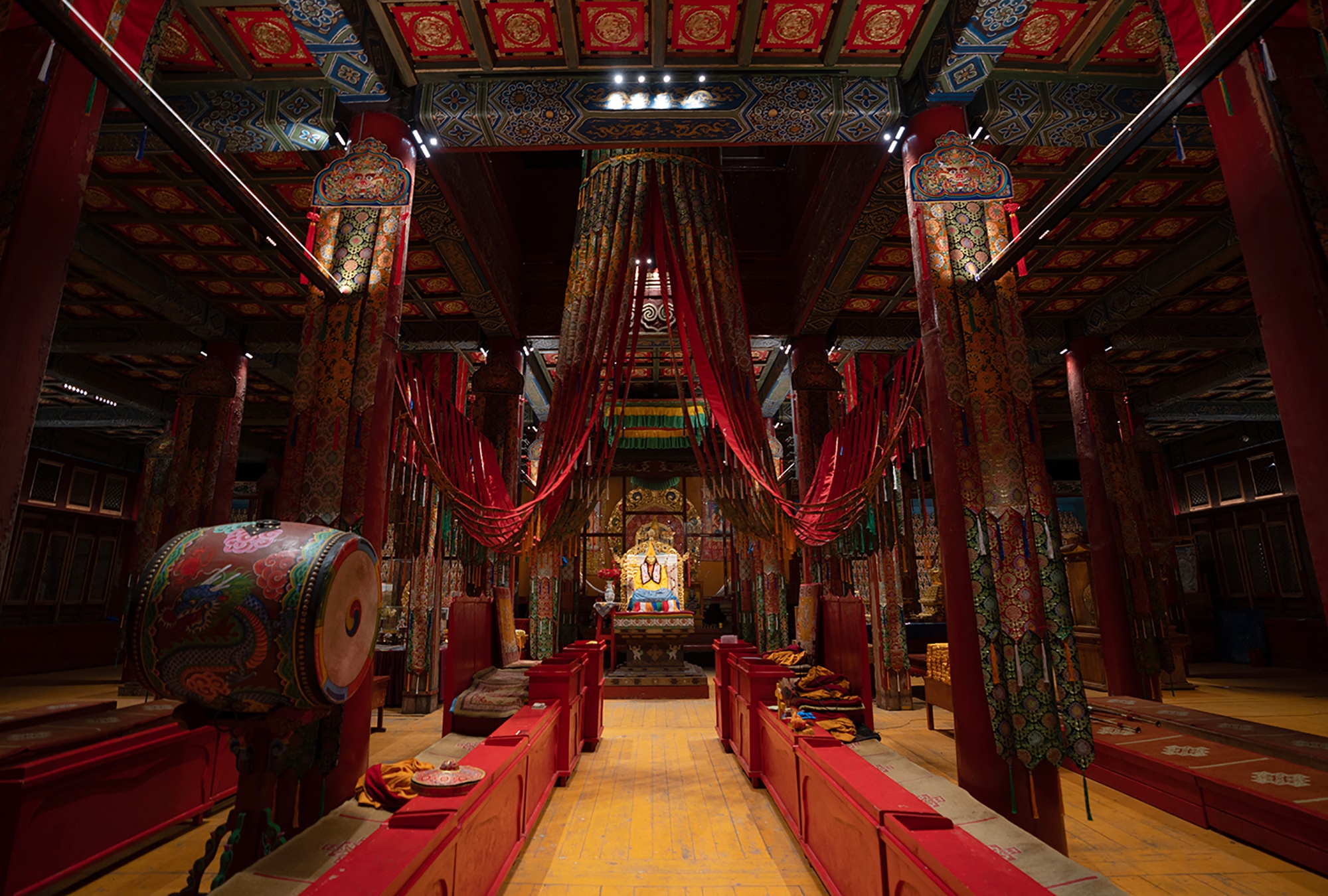 An indirect system glorifies the painted ceiling and provides ambient light that penetrates under the giant monks' hats.