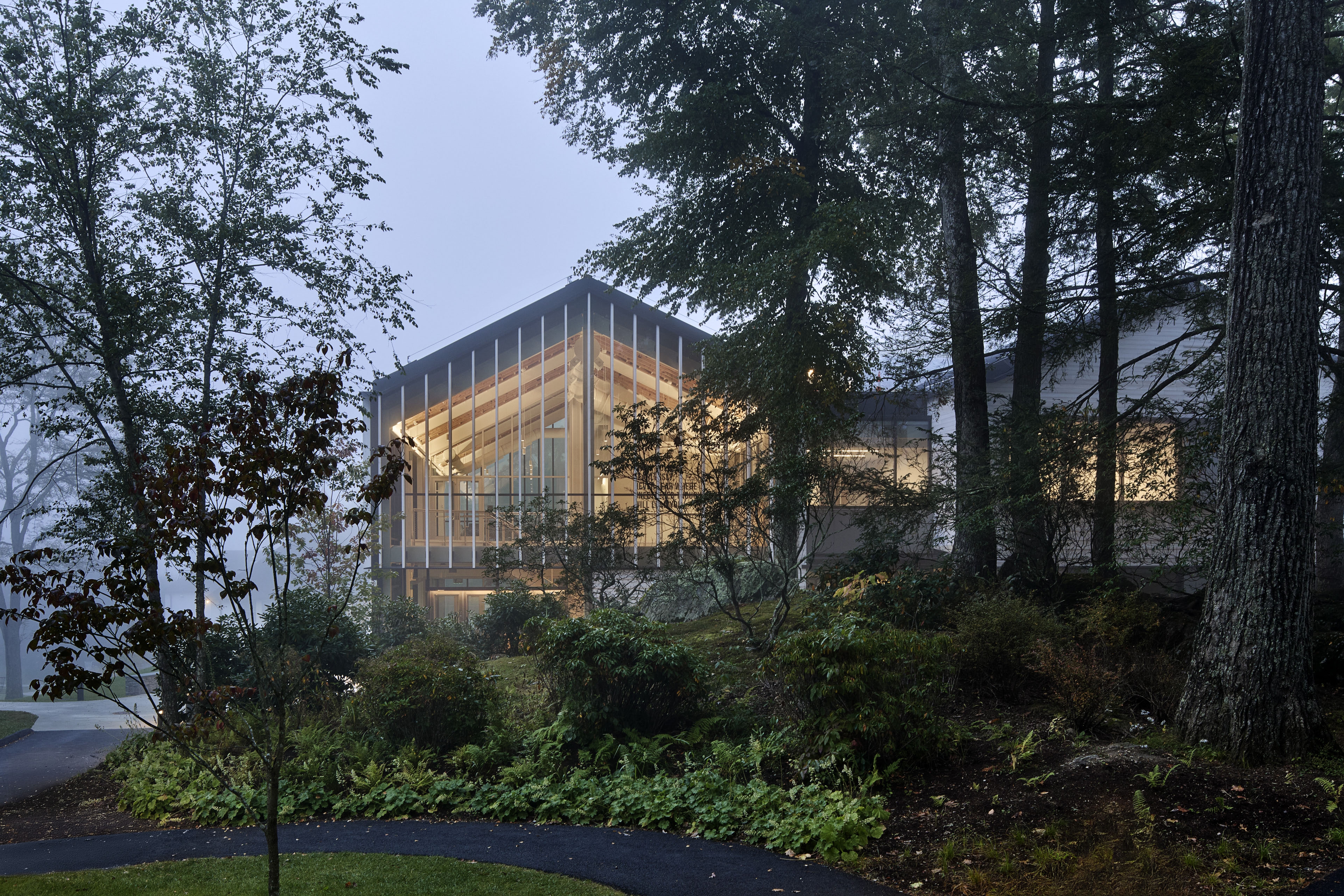 Lighting design supports this near-Net Zero project through efficiency and restraint. Interior fixtures were specified with tailored lumen packages to reduce loads and minimize energy use. In large gathering spaces, lighting is precisely directed onto surfaces where needed, avoiding unnecessary spill into the exterior environment. Low, dark-sky compliant bollards provide glare-free pathways while preserving views of the night sky.