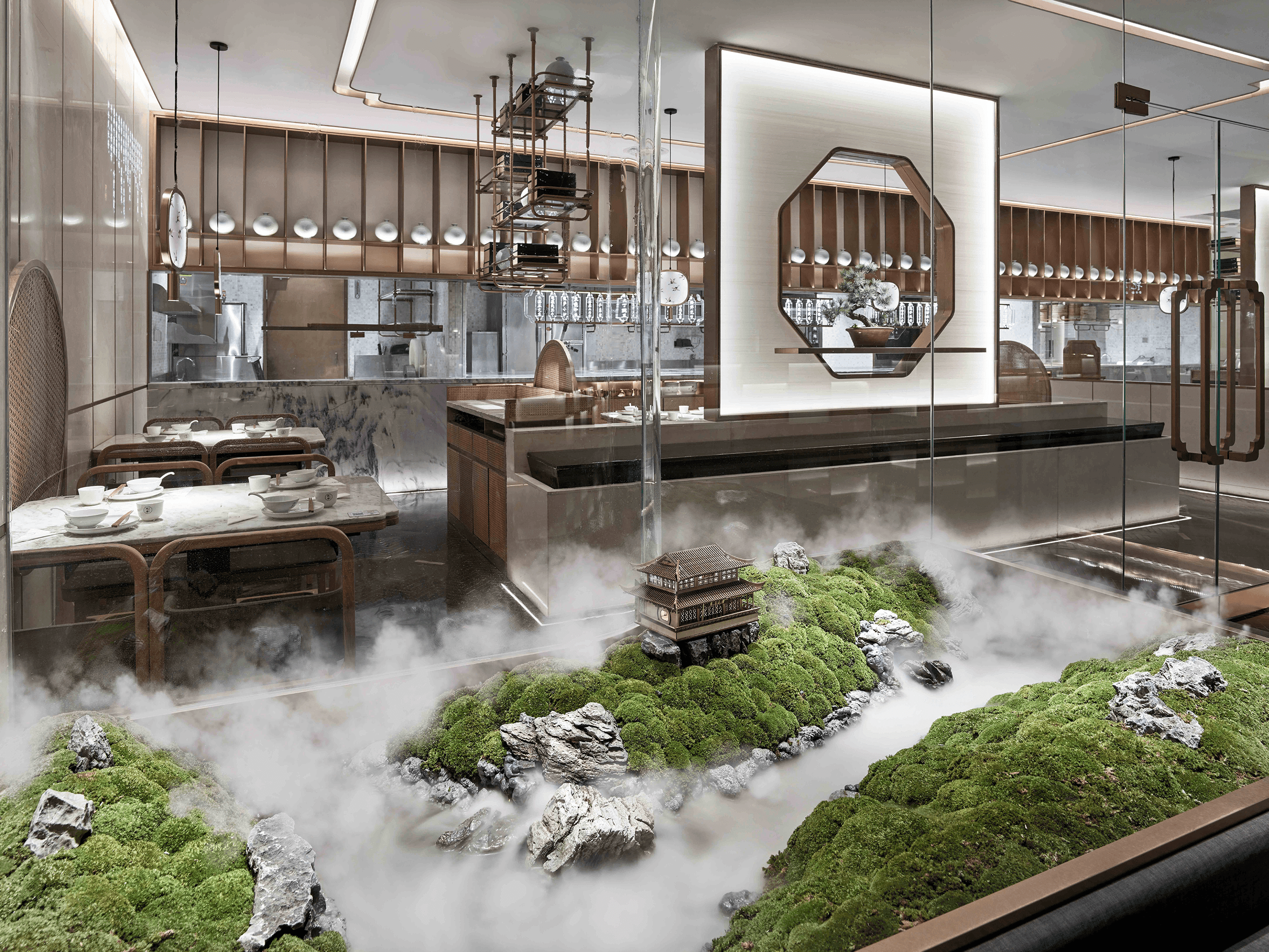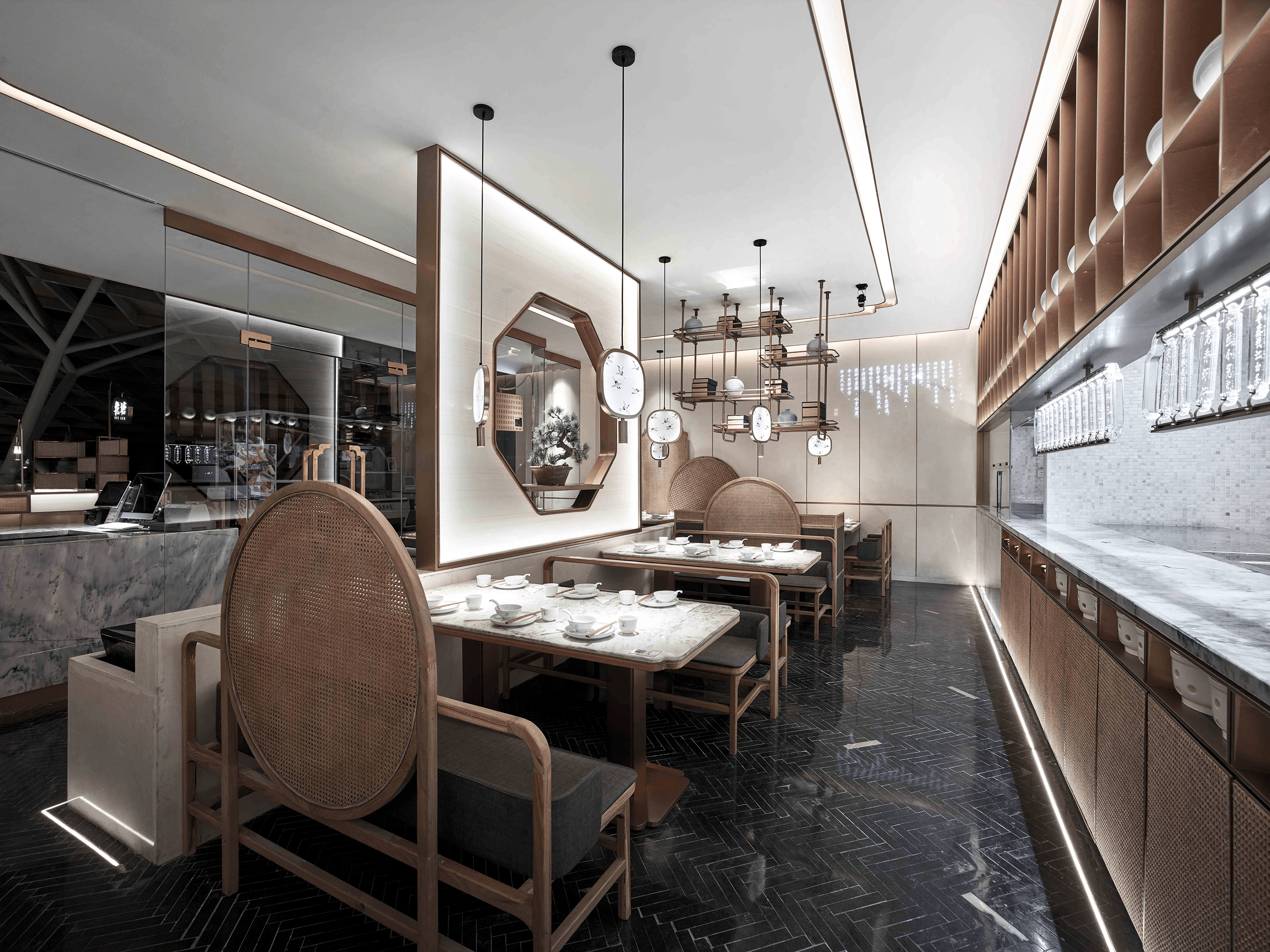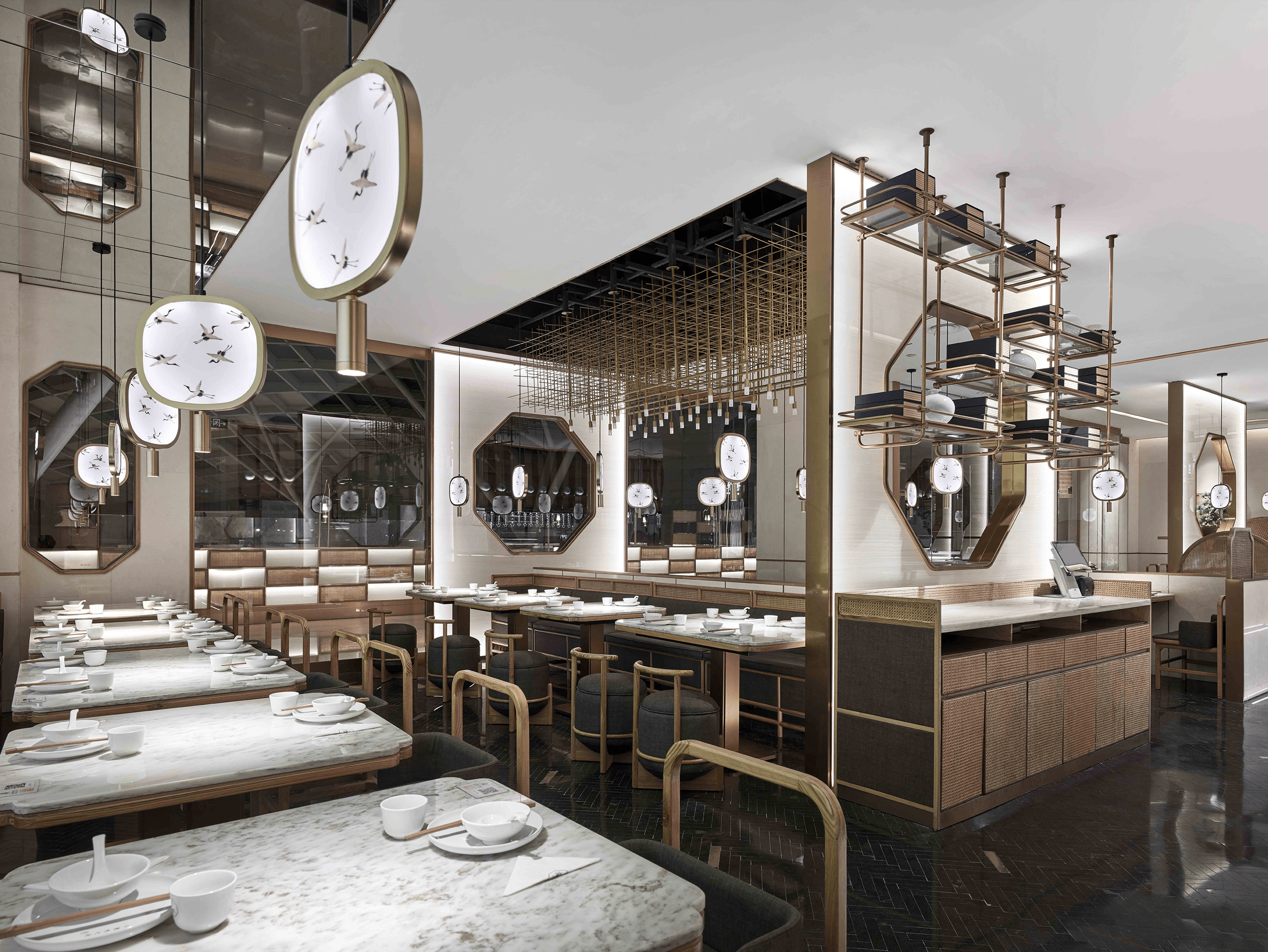 In terms of design, I used a lot of Chinese elements and Chinese paintings to improve the restaurant's ornamental. On the other hand, in the case of using a large number of abnormal lighting, the illumination of desktop 500 Lx and the color rendering above 85 are guaranteed. Because as a restaurant, the most important thing is to ensure the effect of food.