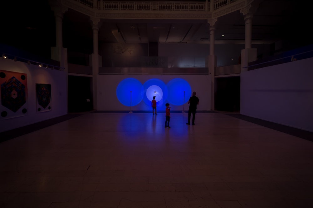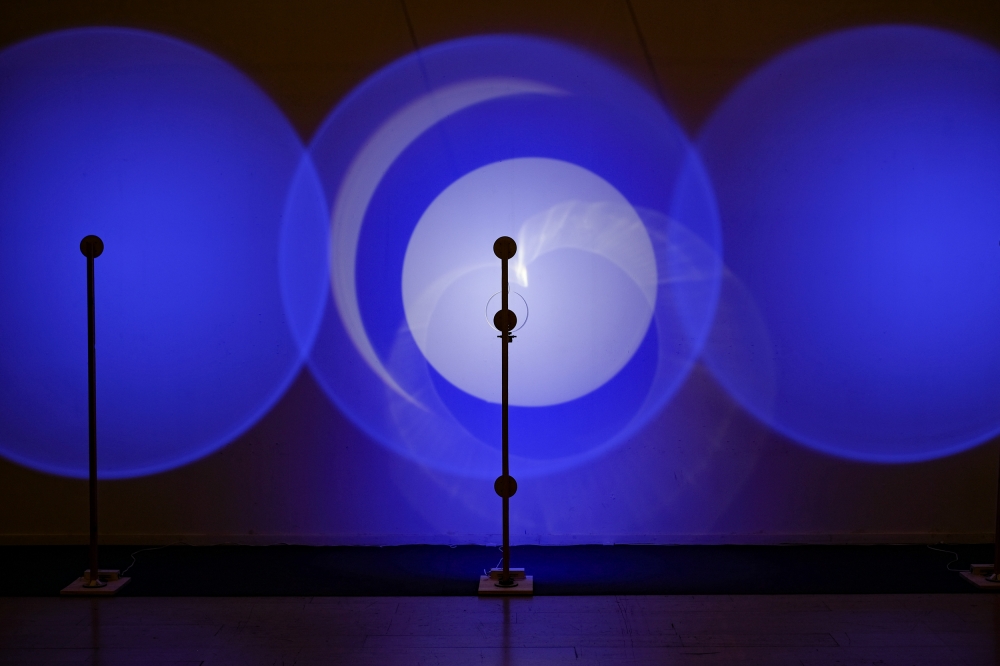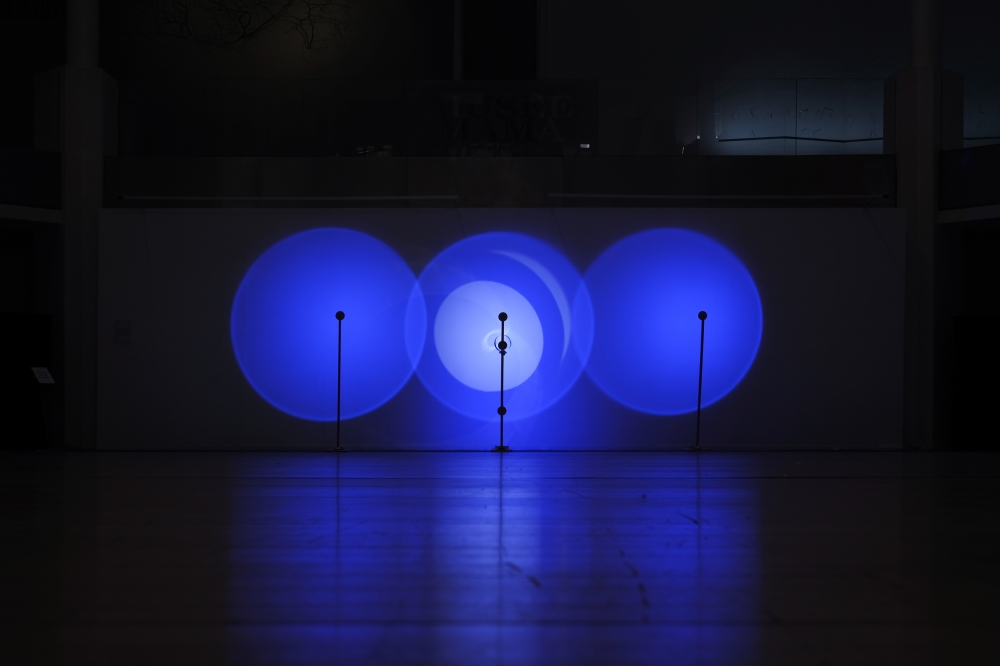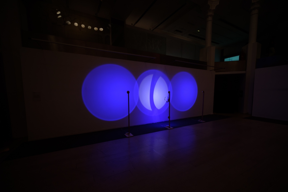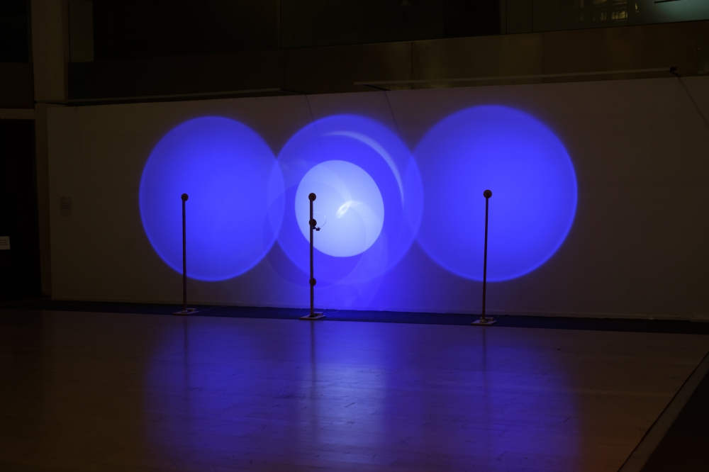 This kinetic sculpture is constituted by three royal blue light circles projected on the wall of the museum; the central one is filled also with a white light with a turning disc in front. The shifting of the white hues inside makes visible the materiality of light, allowing us to perceive when the different lights touch their limits and translating this feeling from visual to a physic one.