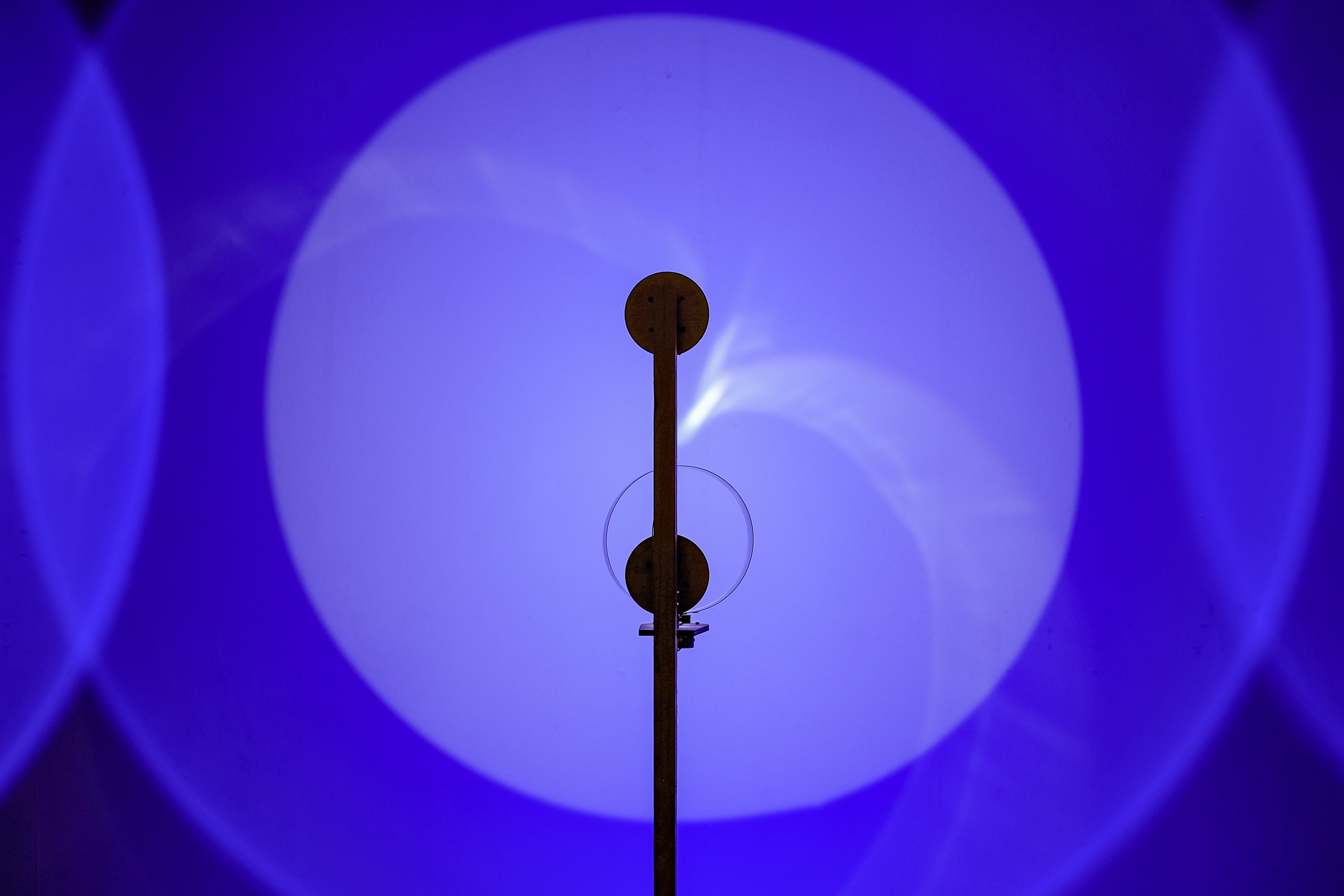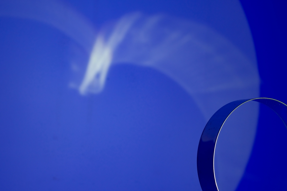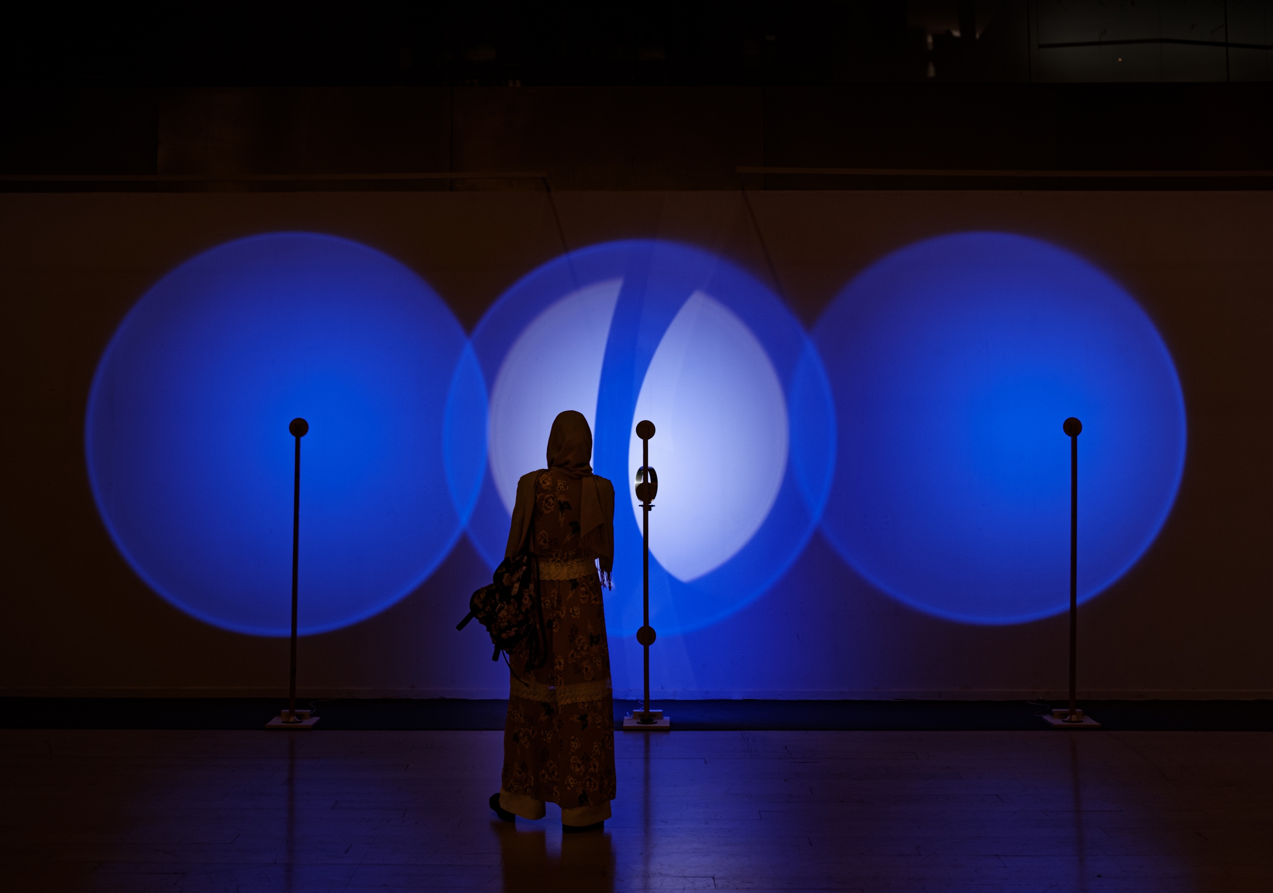 This kinetic sculpture is constituted by three royal blue light circles projected on the wall of the museum; the central one is filled also with a white light with a turning disc in front. The shifting of the white hues inside makes visible the materiality of light, allowing us to perceive when the different lights touch their limits and translating this feeling from visual to a physic one.